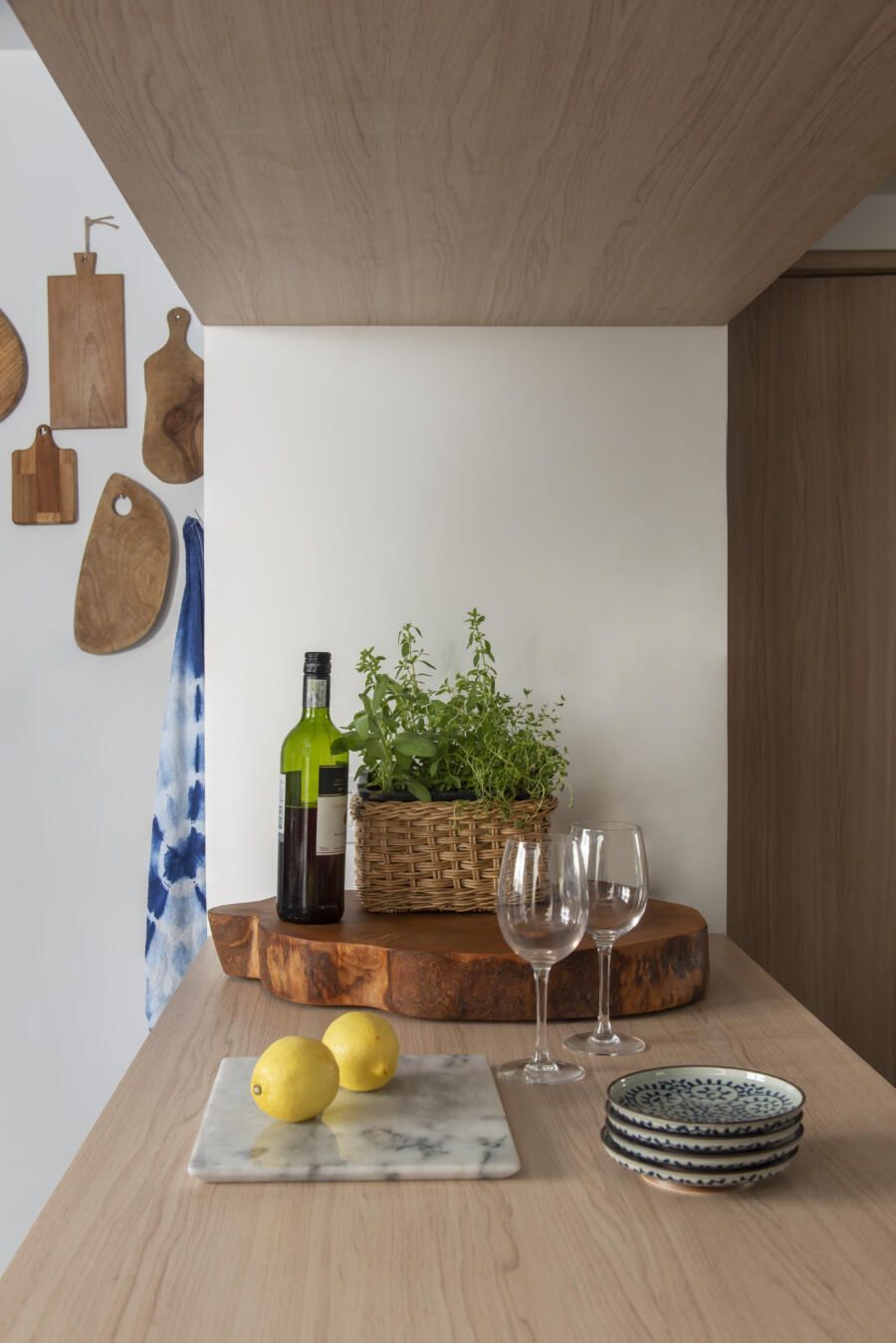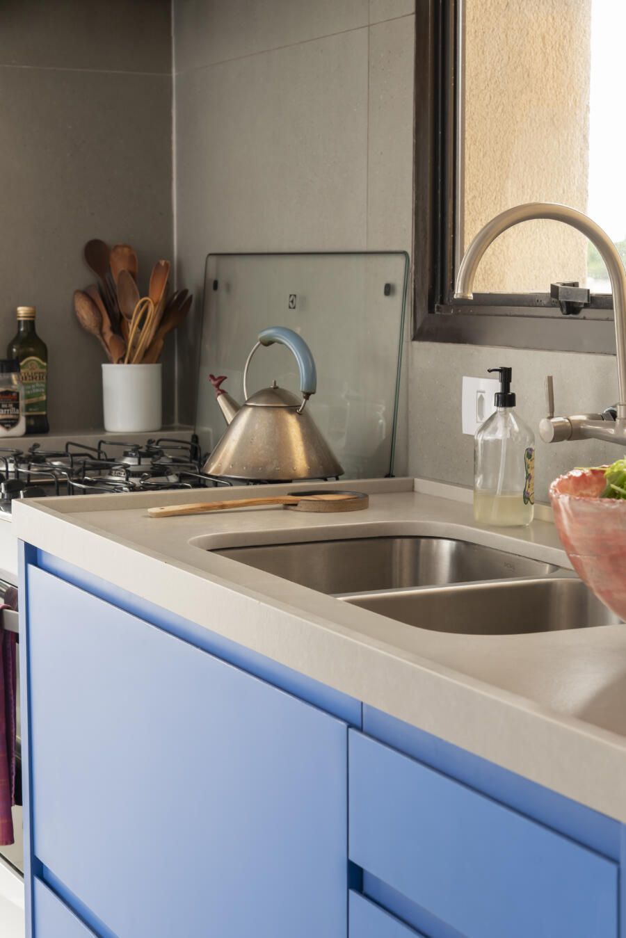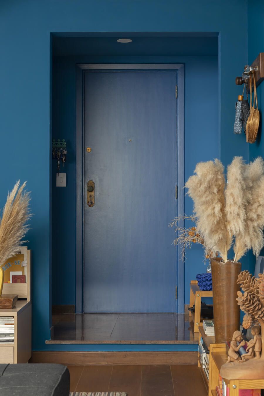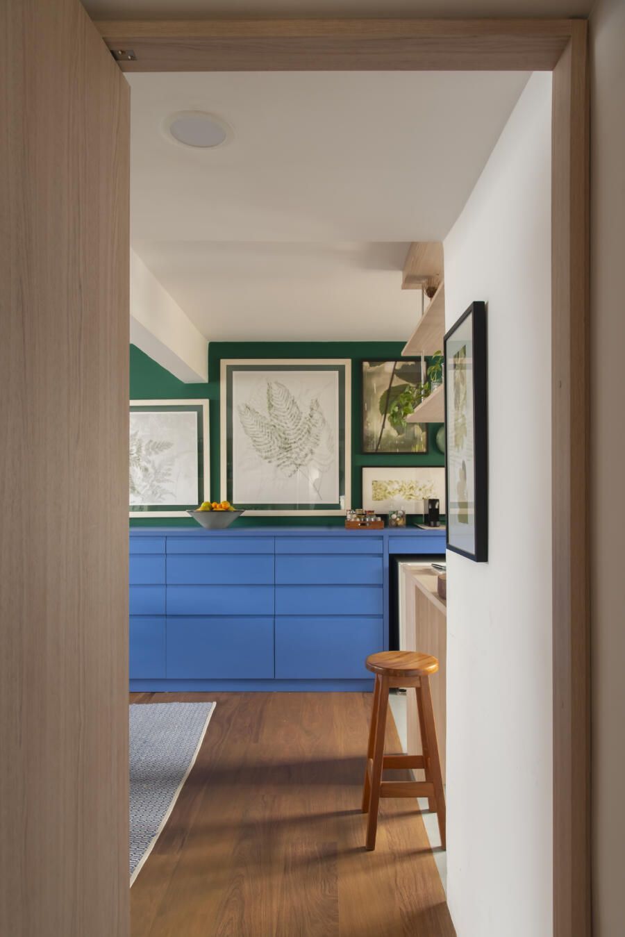 Localizado no Morumbi, em São Paulo, o apartamento da fotógrafa Cacá Bratke surpreende já de início: com uma sala e cozinha integradas, a cor predominante é o azul. São vários os tons distribuídos pelas paredes e móveis, inspiração que veio através de uma revista de arquitetura, na qual se apaixonou pelo estilo de cozinhas azuis.