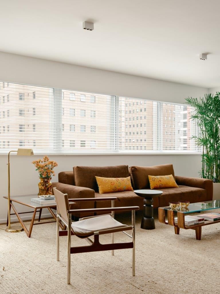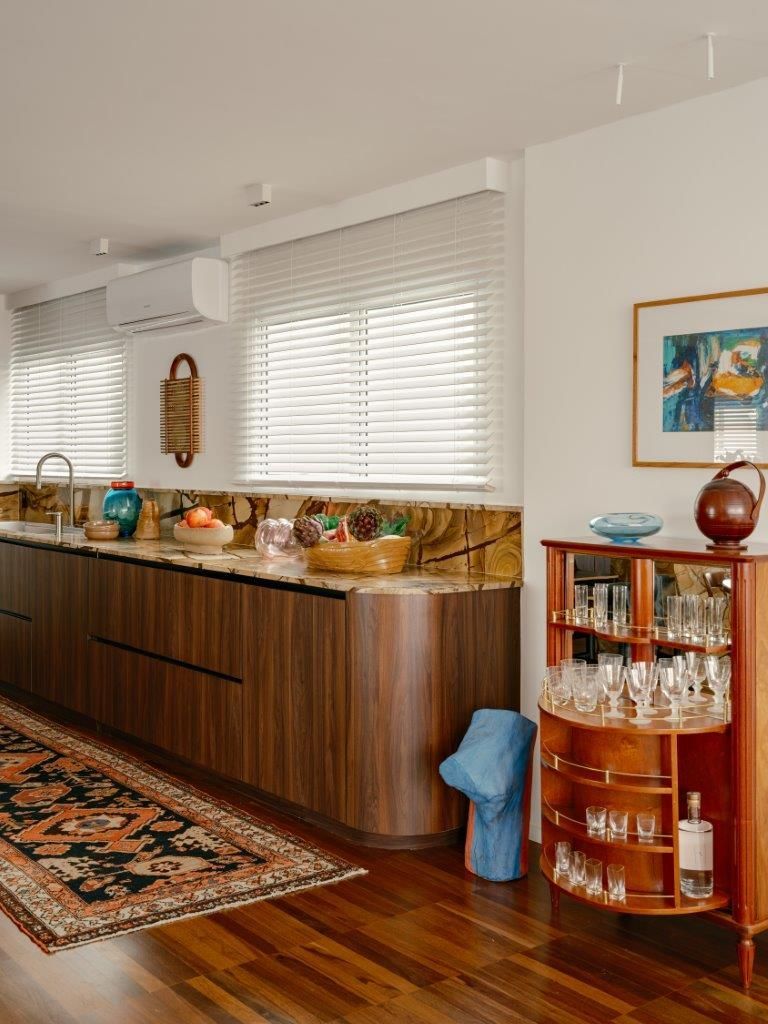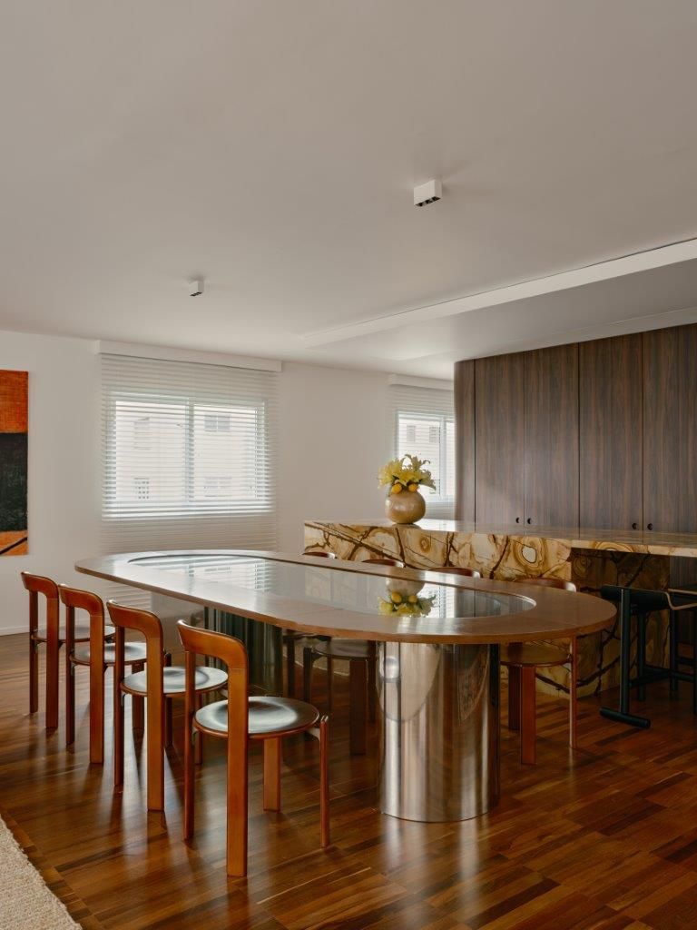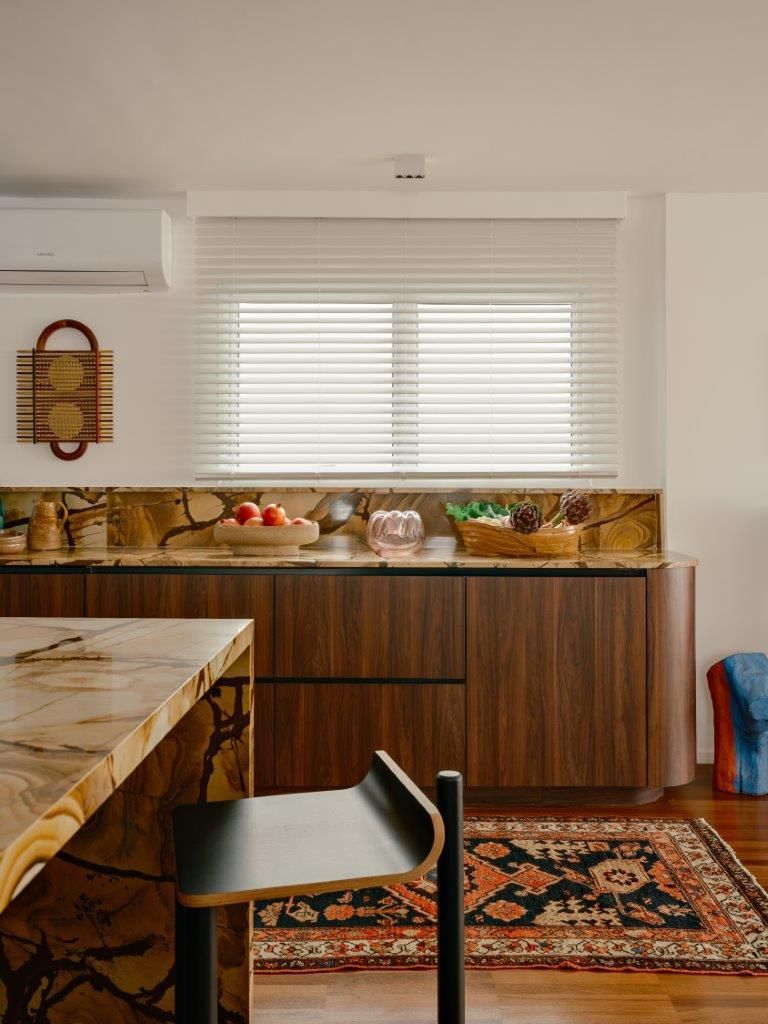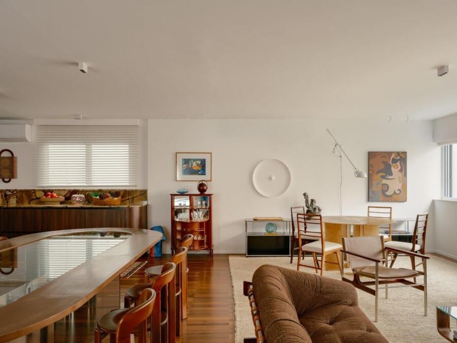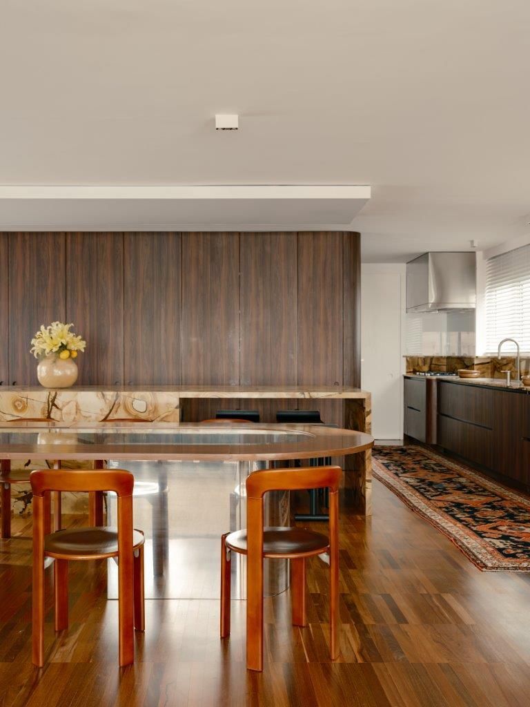 A inspiração parte diretamente da arquitetura setentista do edifício, com pele de vidro e esquadrias de alumínio que evocam uma certa leitura americana daquele período. Felipe mergulha no universo dos anos 70 e início dos 80 para construir uma paleta mais densa, com madeiras escuras, tons terrosos e texturas marcantes. O quartzito palomino da ilha da cozinha se destaca como elemento central do projeto, tanto pela força visual quanto pela maneira como distribui suas nuances de cor pelo restante do ambiente, dialogando com o piso em ipê e com a marcenaria em tom mais profundo.