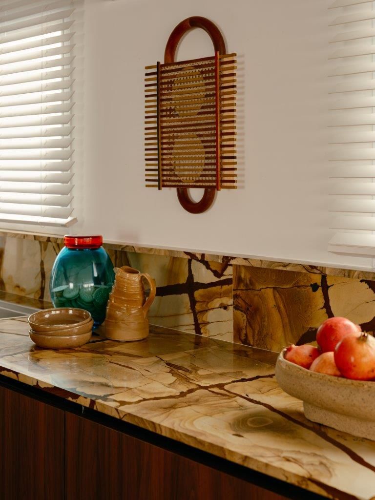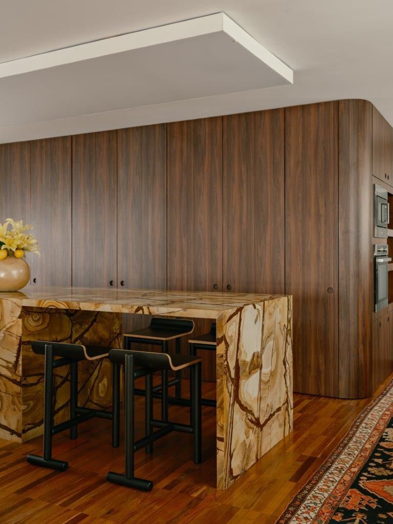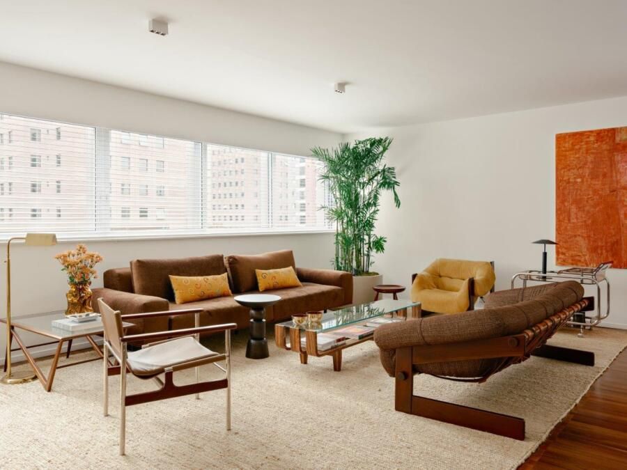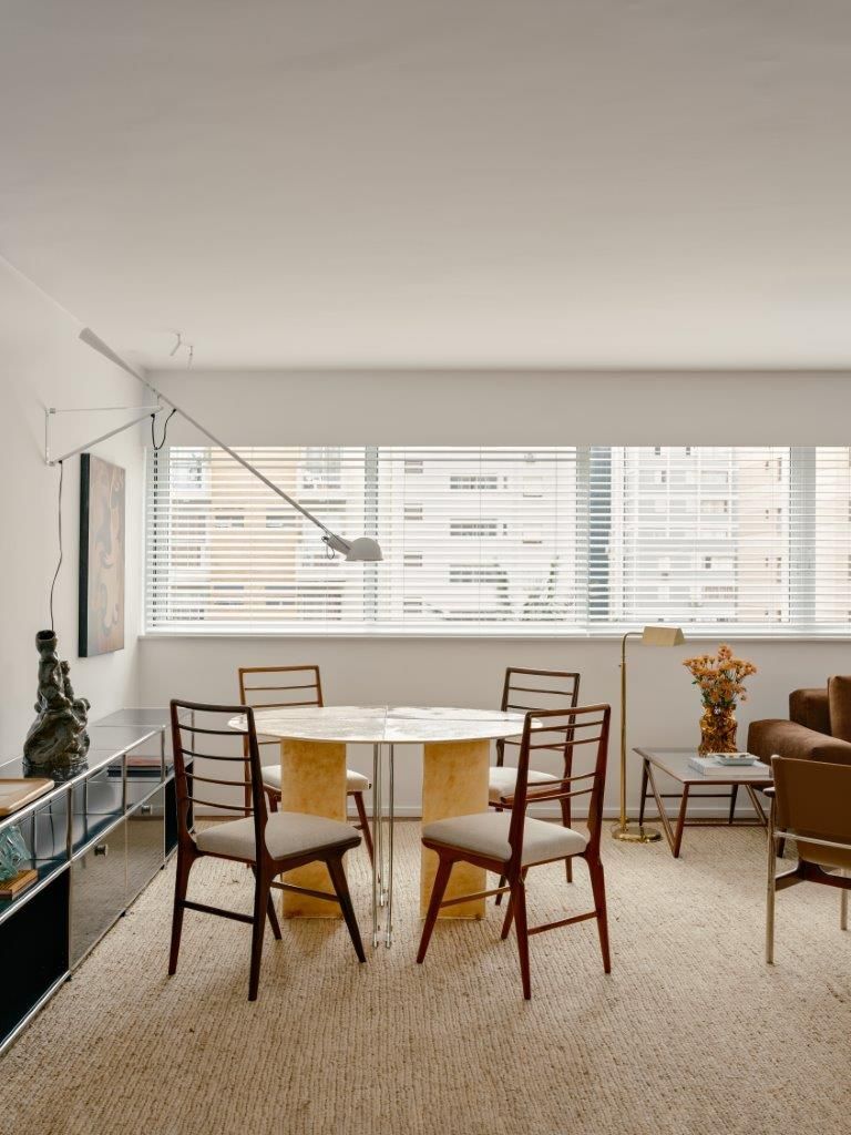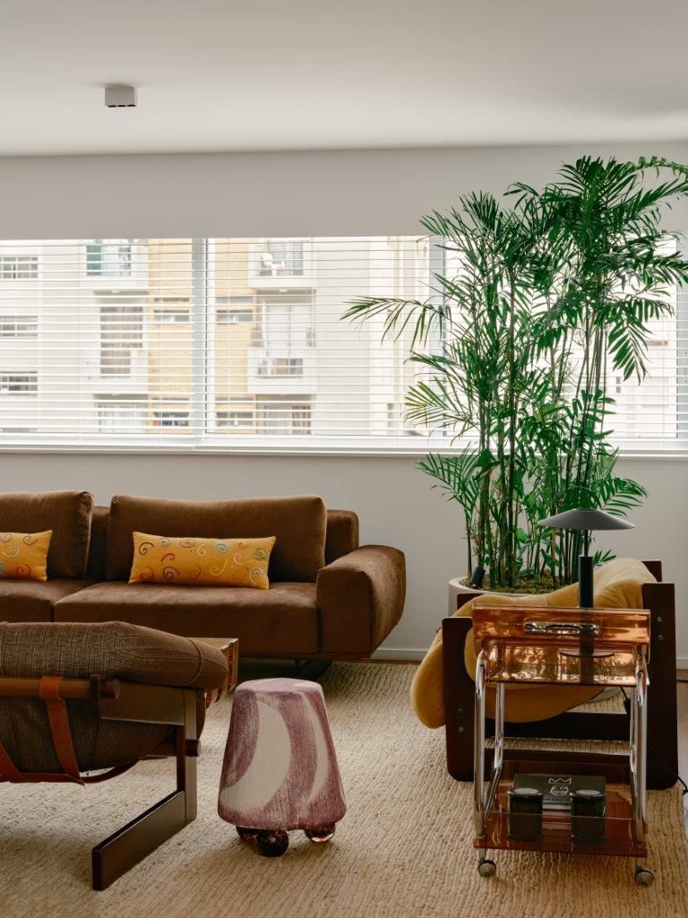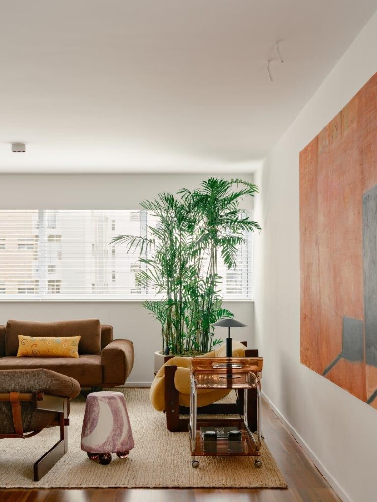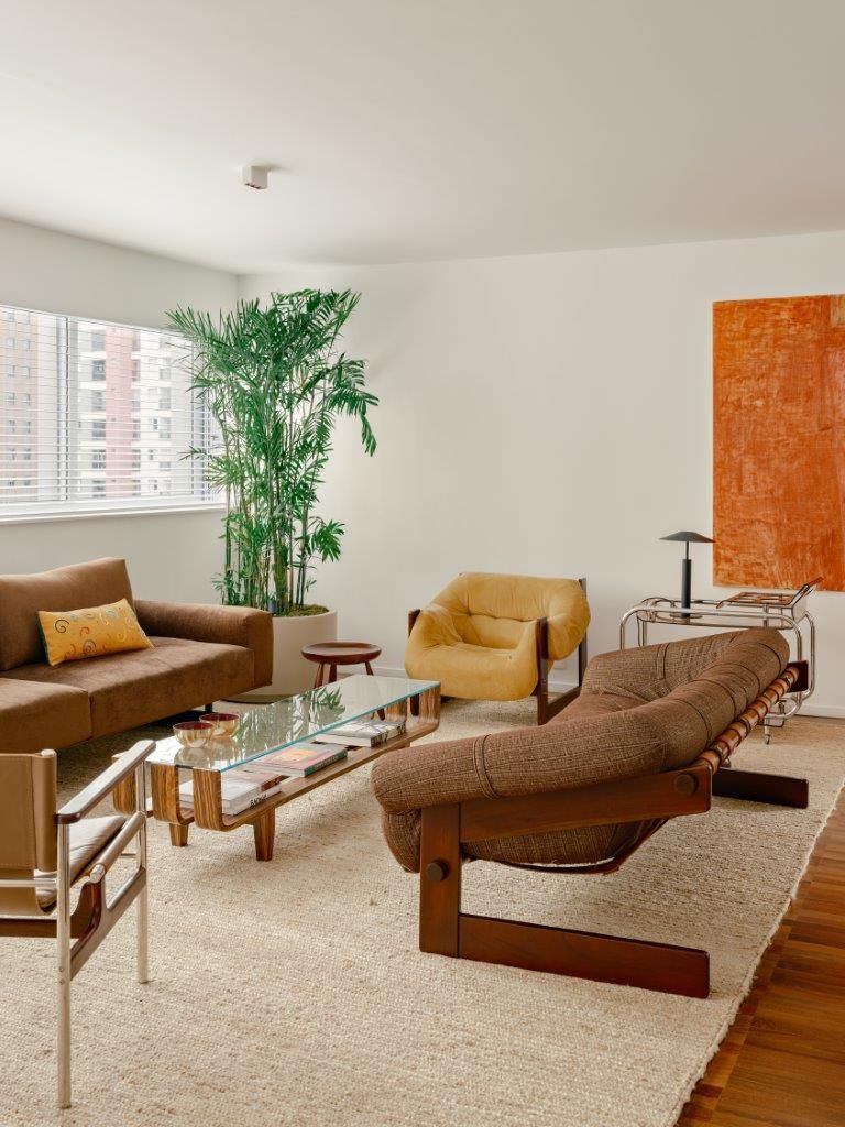 A inspiração parte diretamente da arquitetura setentista do edifício, com pele de vidro e esquadrias de alumínio que evocam uma certa leitura americana daquele período. Felipe mergulha no universo dos anos 70 e início dos 80 para construir uma paleta mais densa, com madeiras escuras, tons terrosos e texturas marcantes. O quartzito palomino da ilha da cozinha se destaca como elemento central do projeto, tanto pela força visual quanto pela maneira como distribui suas nuances de cor pelo restante do ambiente, dialogando com o piso em ipê e com a marcenaria em tom mais profundo.