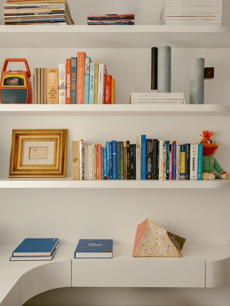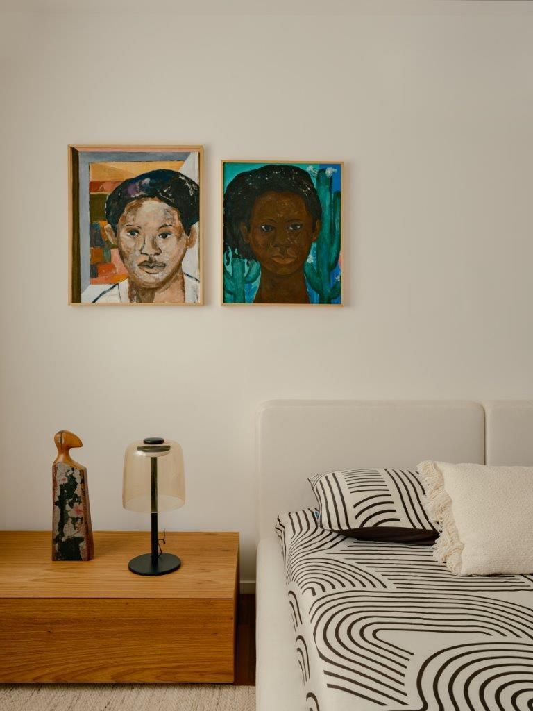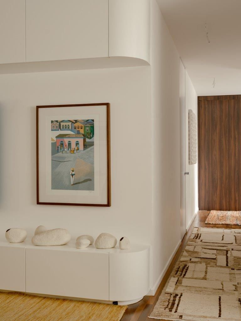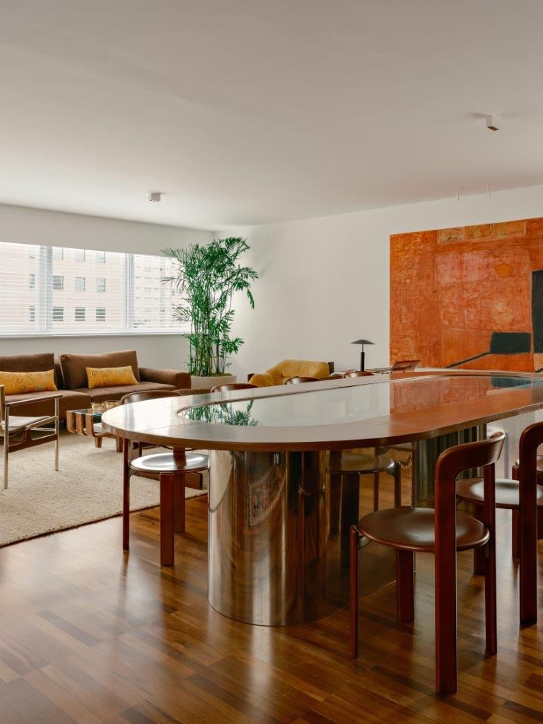 Eu mostro também as áreas de convivência, os cantinhos criados para tornar o ambiente mais acolhedor, as peças garimpadas e restauradas, e os elementos que carregam história. A curadoria é parte essencial do projeto: obras de arte brasileira, mobiliário de diferentes épocas e criações autorais convivem de maneira orgânica, reforçando a identidade do espaço sem recorrer a fórmulas prontas.