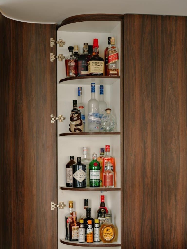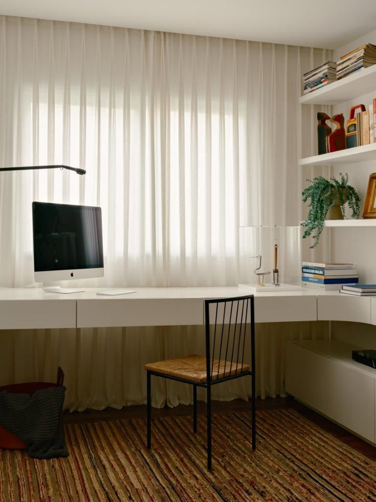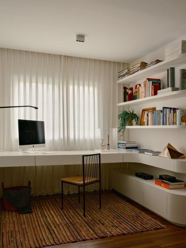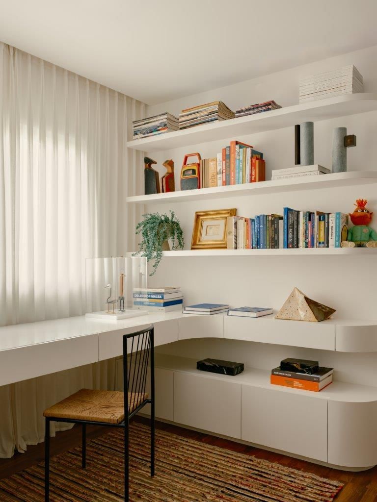 A gente conversa sobre essa paleta mais escura, sobre as curvas presentes na marcenaria e no desenho de alguns móveis, sobre o piso e sobre a escolha de materiais que equilibram estética e funcionalidade. Na cozinha e no estar, tudo foi pensado dentro dessa linha tênue entre o bonito e o prático, respeitando a rotina real dos moradores. A sala de TV integrada ao office, por exemplo, nasce da necessidade de ter um espaço mais reservado para o dia a dia, enquanto a área social permanece livre e preparada para receber.