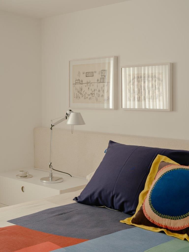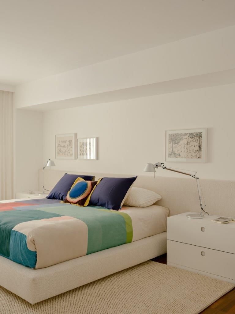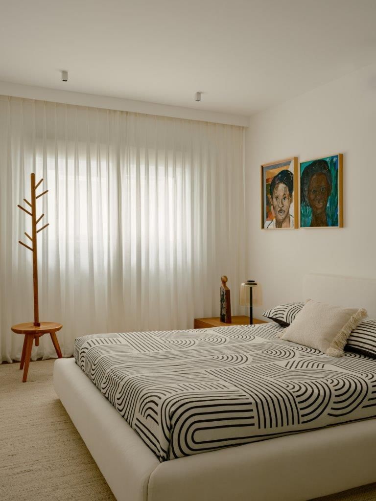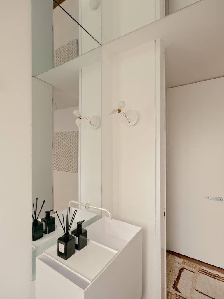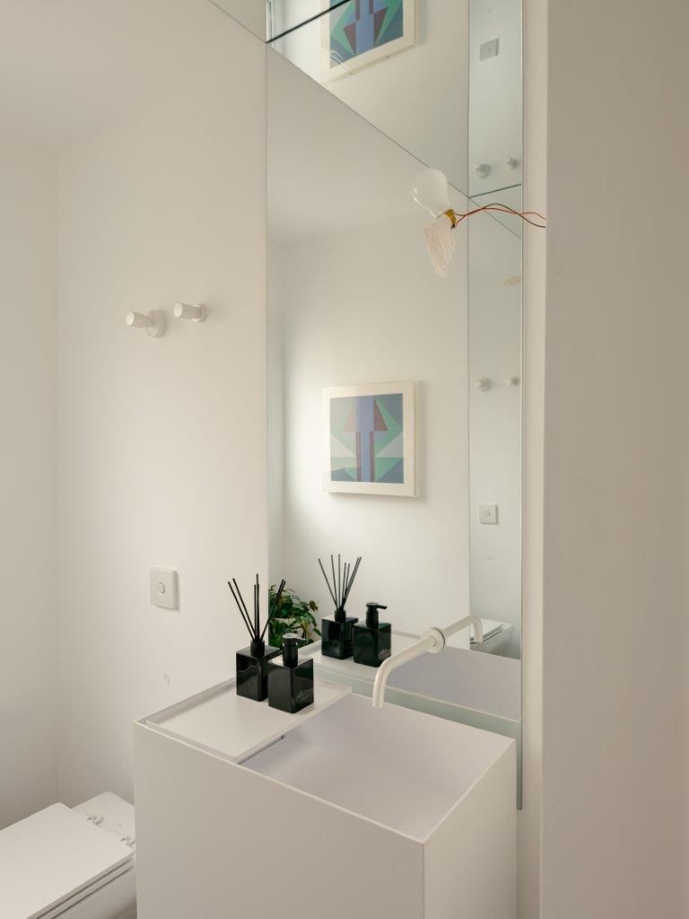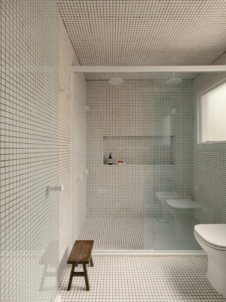 Na área íntima, a atmosfera muda. A suíte master aposta em uma paleta clara e texturizada, criando um contraponto à densidade da área social. Nos banheiros, as pastilhas aplicadas do piso ao teto reinterpretam a linguagem do prédio de 1978 de maneira contemporânea, enquanto toda a infraestrutura elétrica e hidráulica foi refeita para atender às novas demandas de uso e tecnologia, preservando o pé-direito e a leitura arquitetônica original.