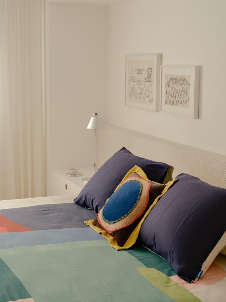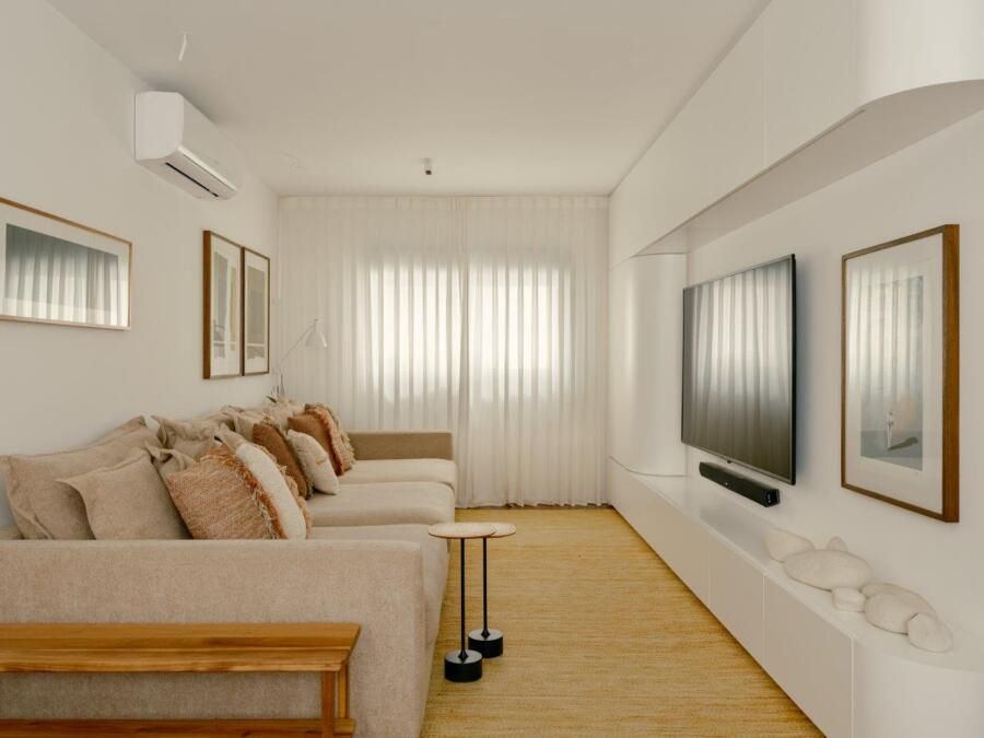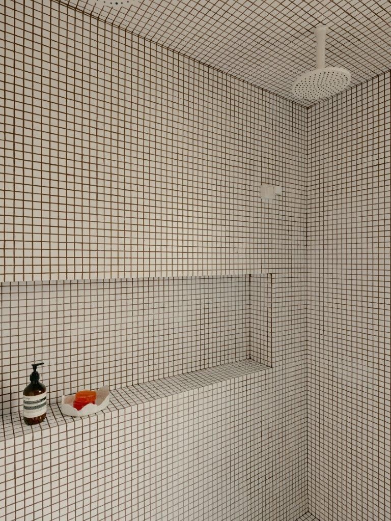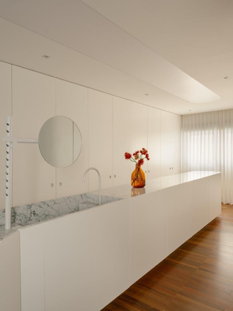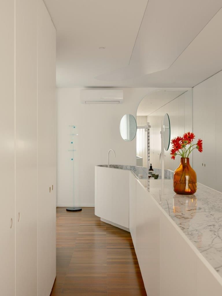 Na área íntima, a atmosfera muda. A suíte master aposta em uma paleta clara e texturizada, criando um contraponto à densidade da área social. Nos banheiros, as pastilhas aplicadas do piso ao teto reinterpretam a linguagem do prédio de 1978 de maneira contemporânea, enquanto toda a infraestrutura elétrica e hidráulica foi refeita para atender às novas demandas de uso e tecnologia, preservando o pé-direito e a leitura arquitetônica original.