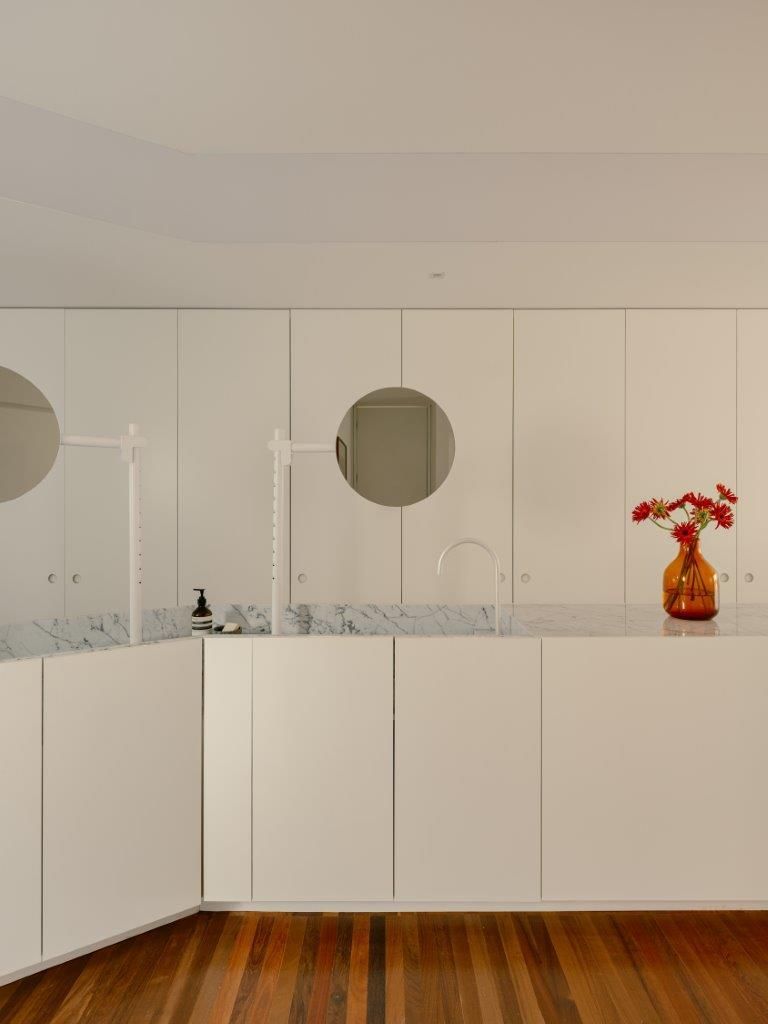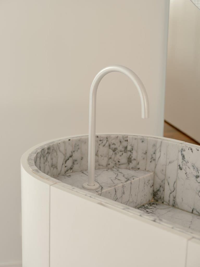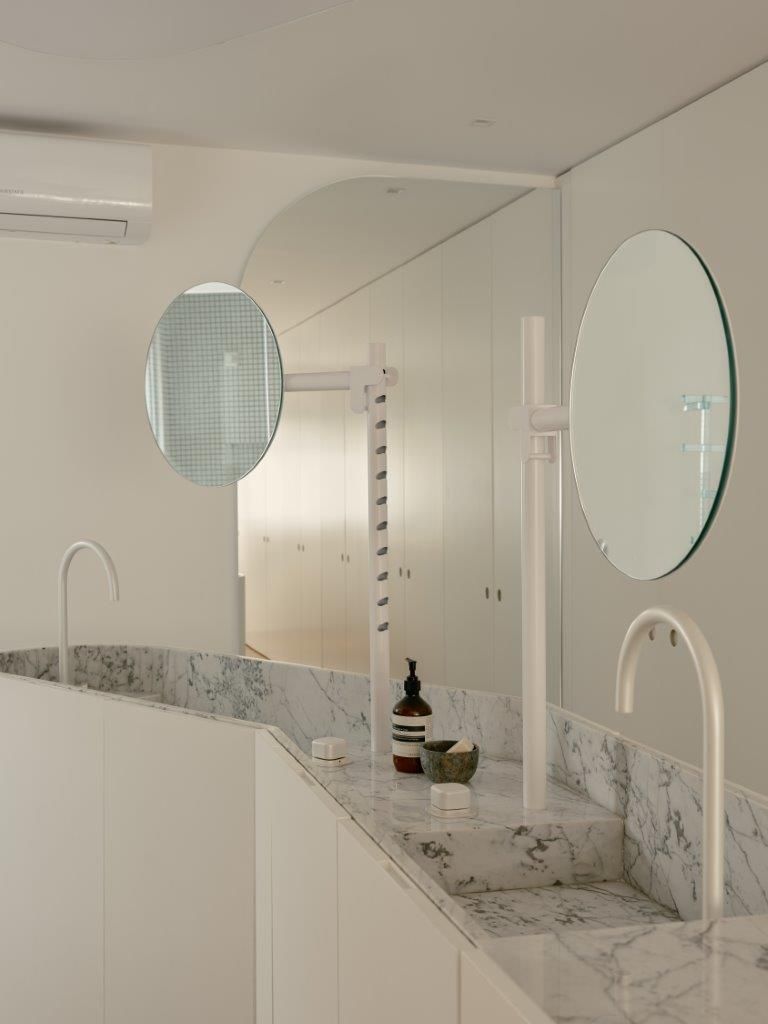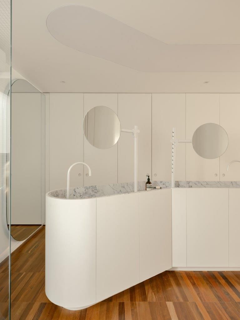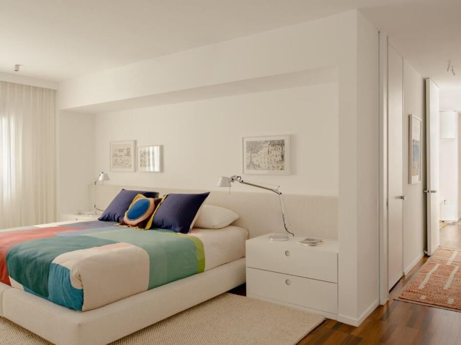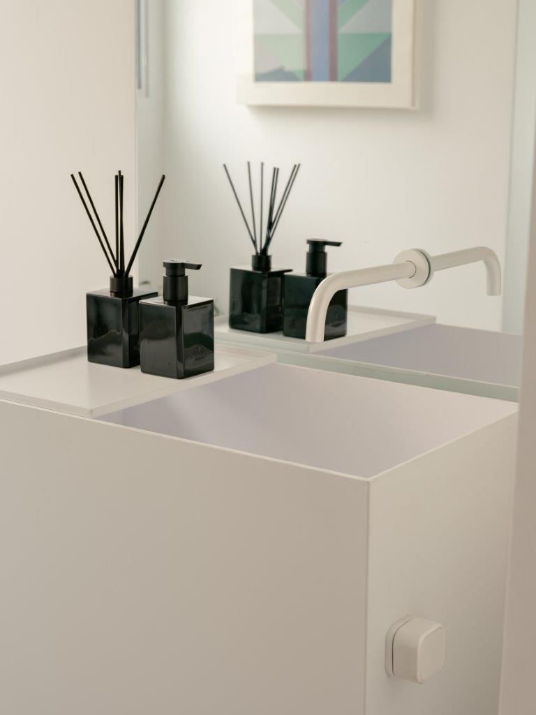 Na área íntima, a atmosfera muda. A suíte master aposta em uma paleta clara e texturizada, criando um contraponto à densidade da área social. Nos banheiros, as pastilhas aplicadas do piso ao teto reinterpretam a linguagem do prédio de 1978 de maneira contemporânea, enquanto toda a infraestrutura elétrica e hidráulica foi refeita para atender às novas demandas de uso e tecnologia, preservando o pé-direito e a leitura arquitetônica original.