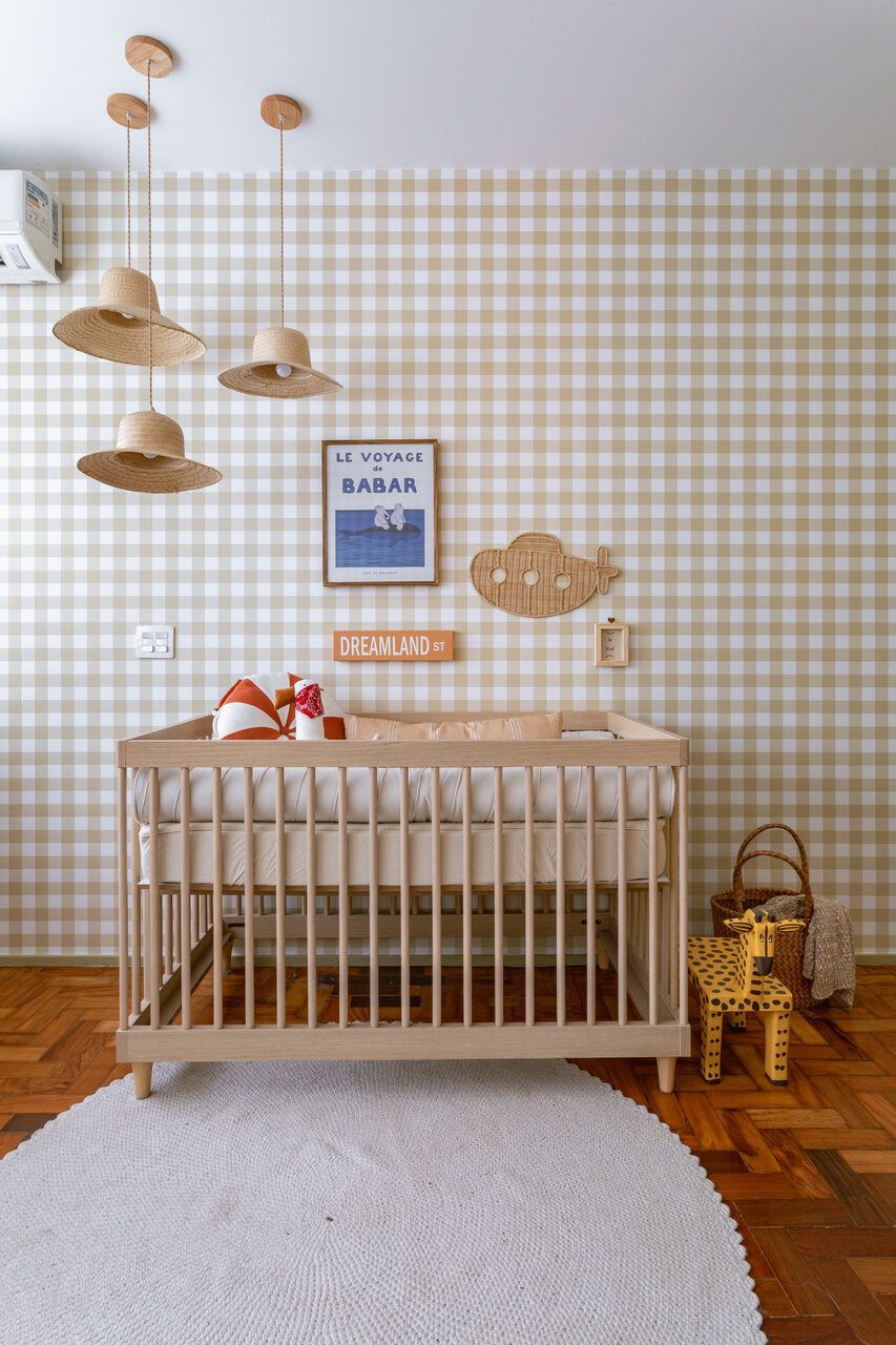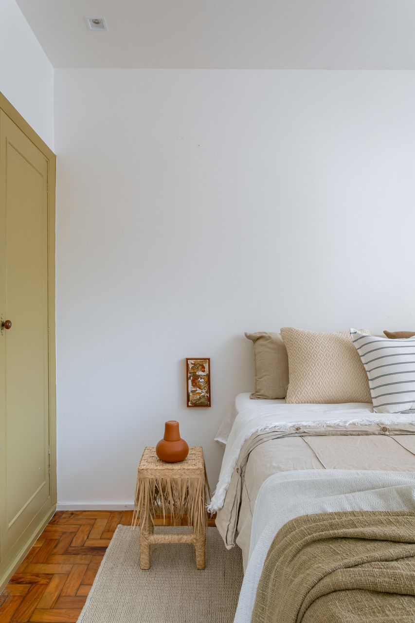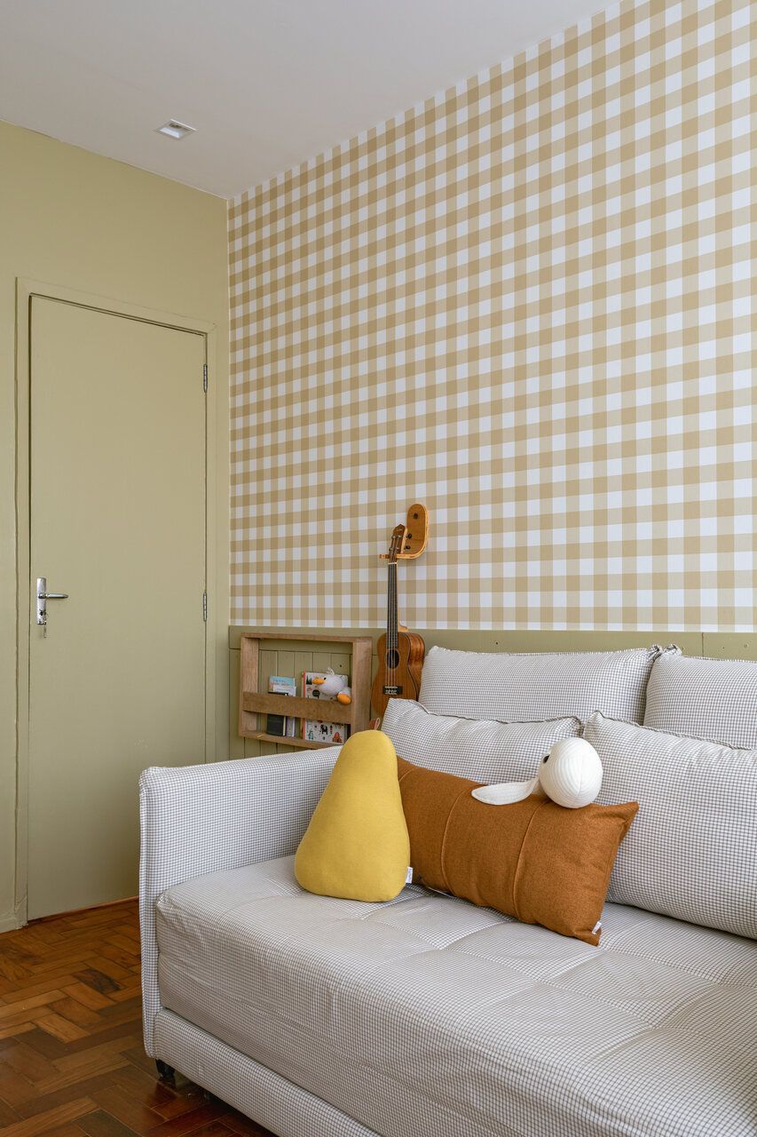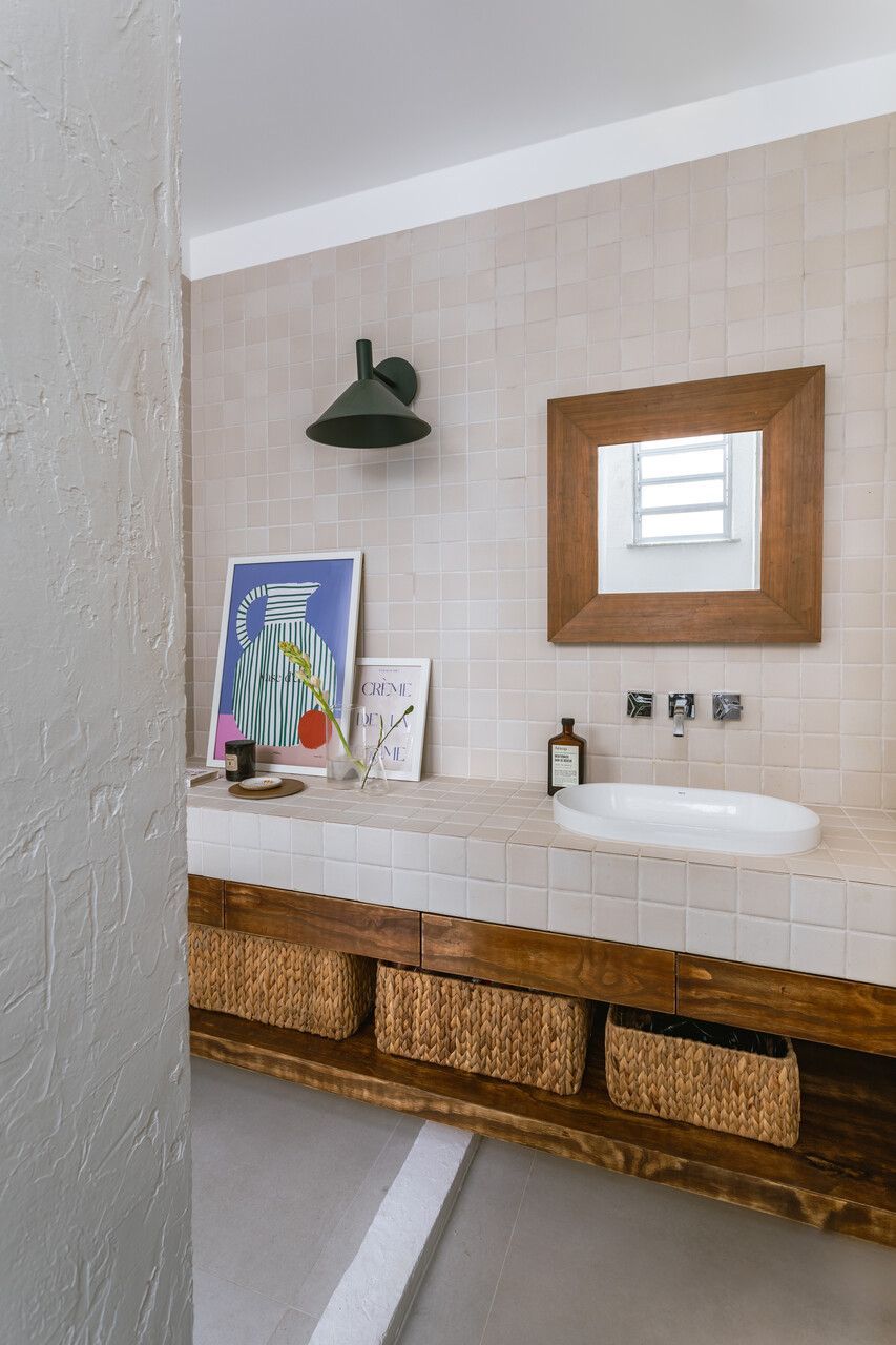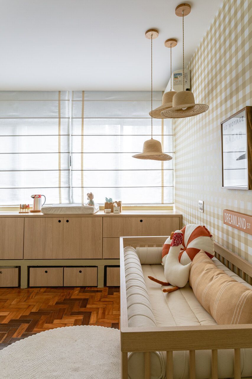 O quarto de Nico traduz a essência do primeiro filho tão esperado, com decoração inspirada na música “O Pato”, de Gilberto Gil, que a mãe cantava durante a gravidez. Armários embutidos e detalhes encantadores tornam o espaço funcional e acolhedor. No banheiro da suíte, a jardineira de cactos, que se estende desde a área de serviço até o fundo do box, destaca a integração entre arquitetura e paisagismo.