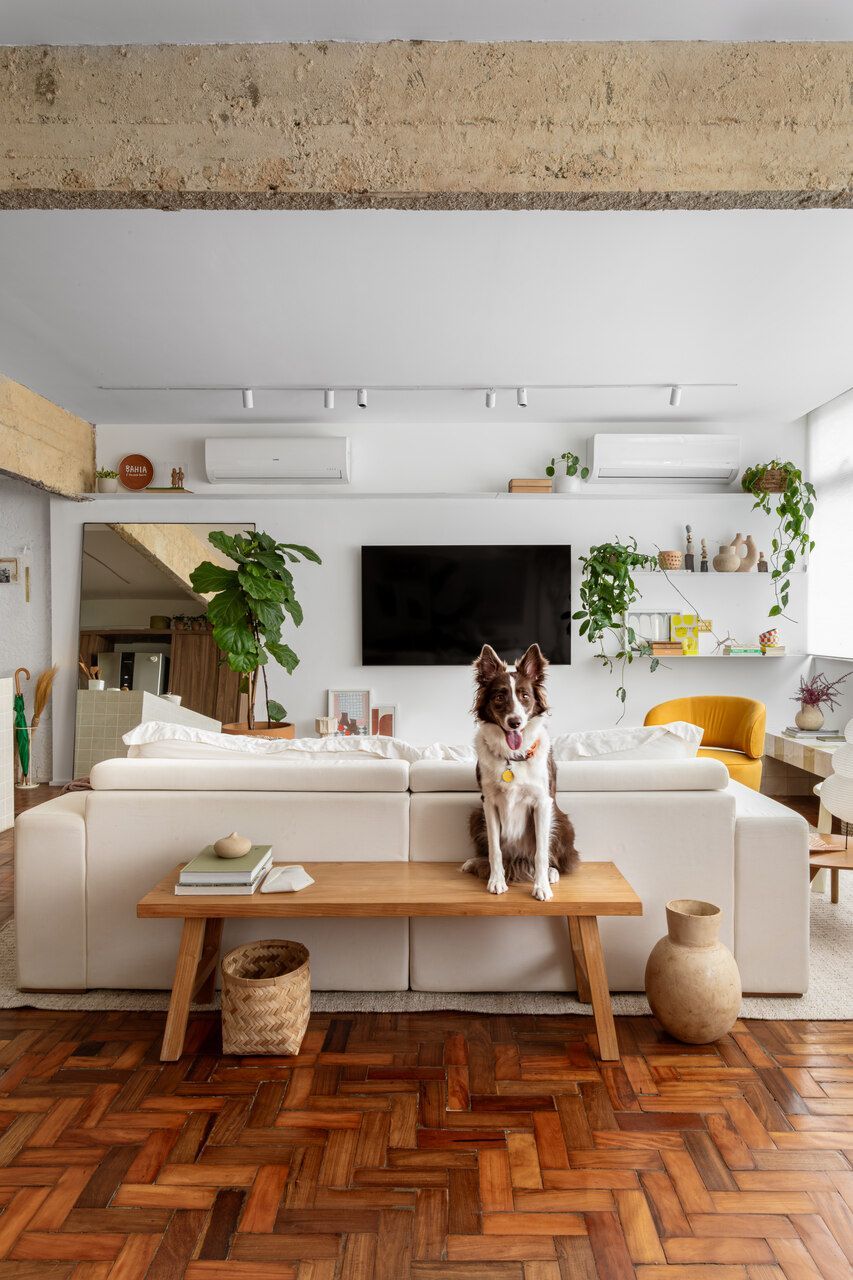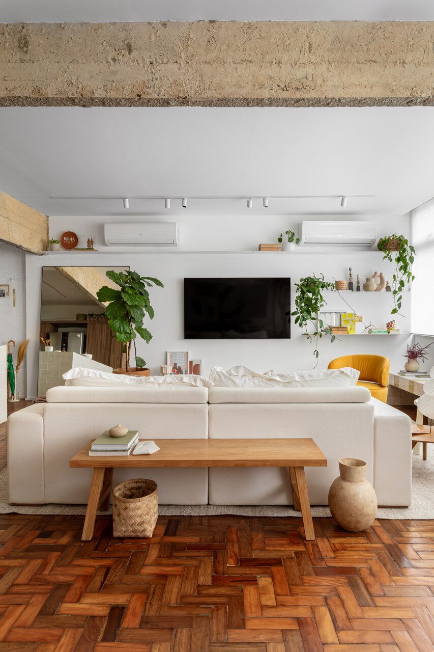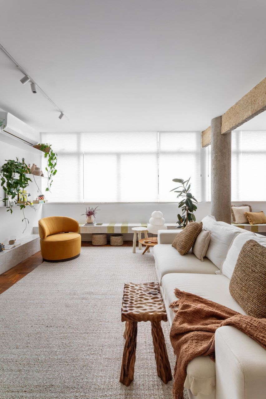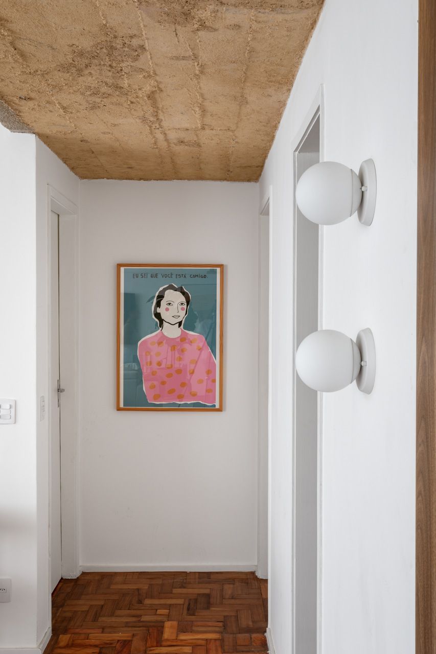 O projeto, classificado como contemporâneo brasileiro, valoriza a materialidade e a história do apartamento. A parede rústica da entrada, deixada no reboco e pintada de branco, junto com o saibro bruto das vigas, exemplifica a beleza da imperfeição. Trata-se de uma verdadeira ode à alma vibrante da família, expressa em uma poesia arquitetônica que ultrapassa os limites dos materiais e celebra a vida.
