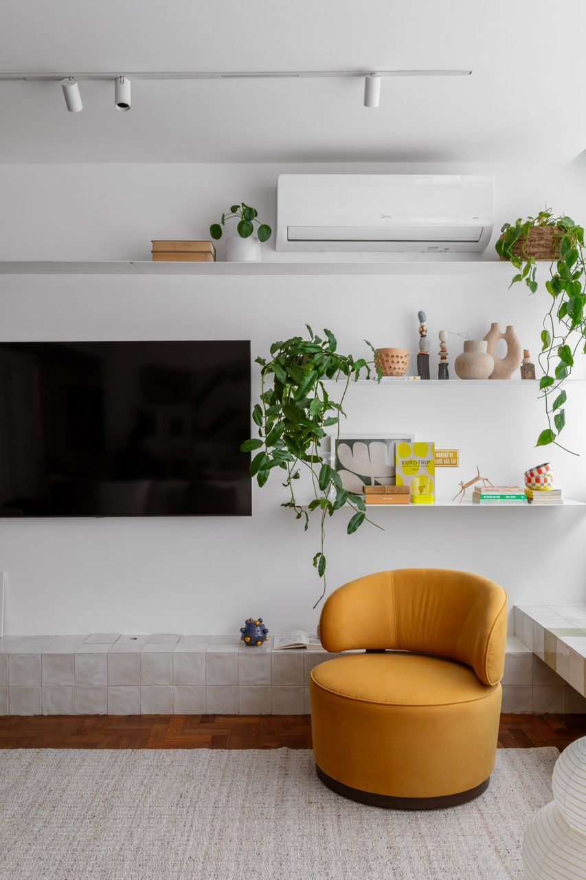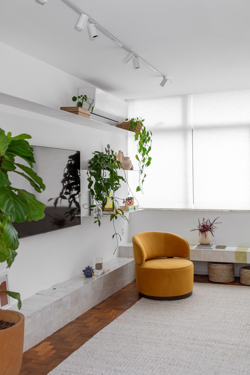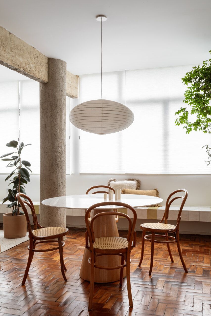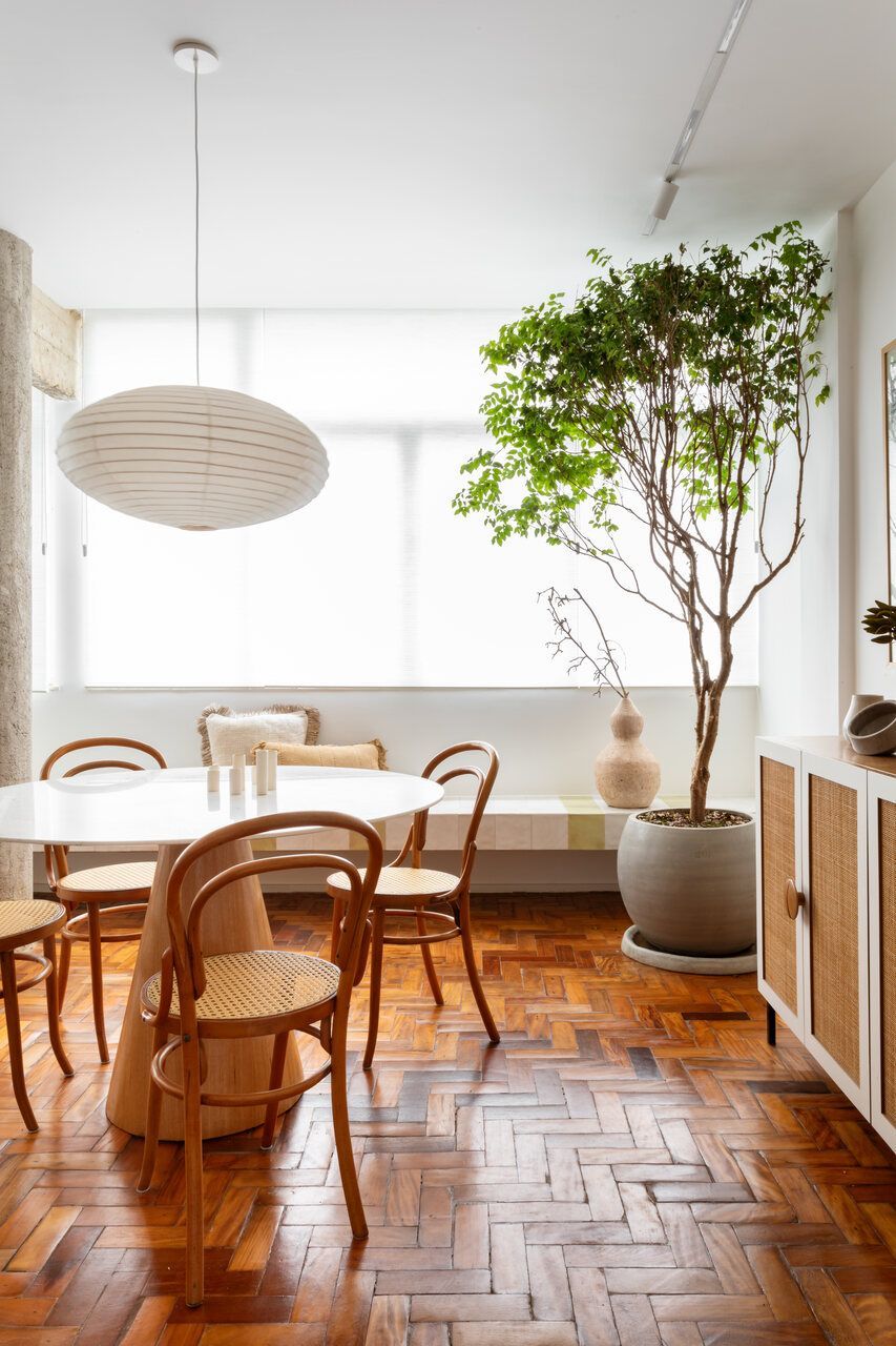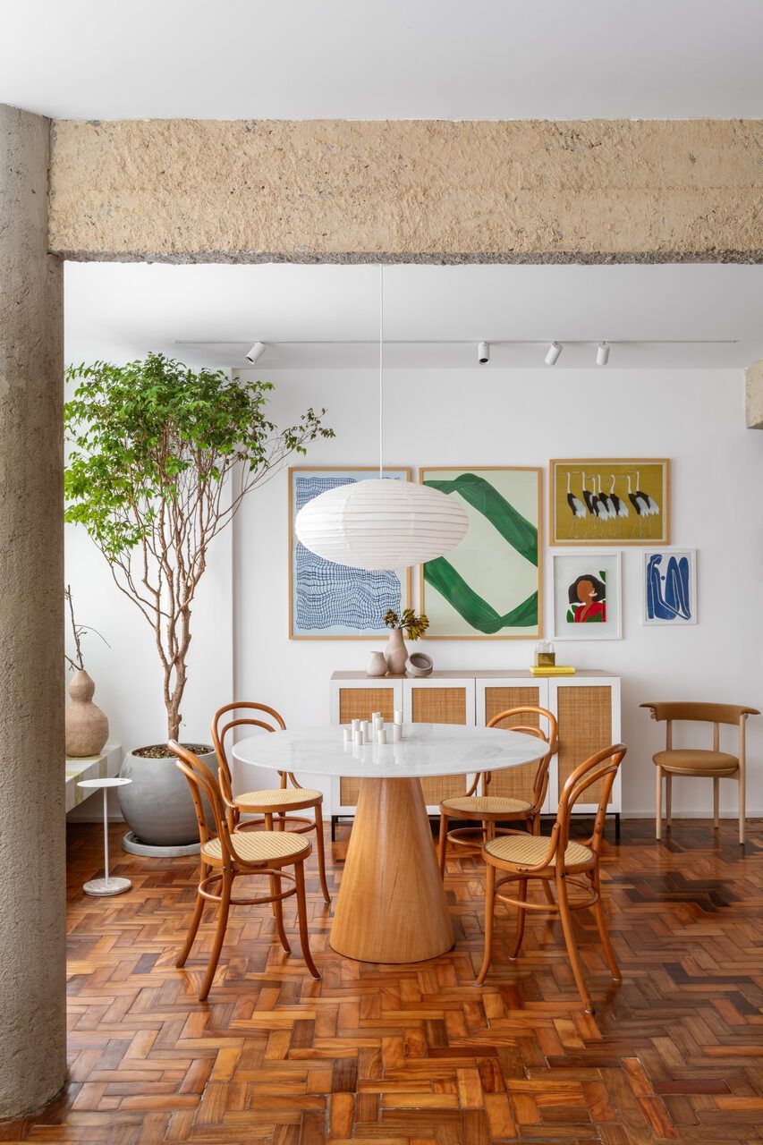 O projeto, classificado como contemporâneo brasileiro, valoriza a materialidade e a história do apartamento. A parede rústica da entrada, deixada no reboco e pintada de branco, junto com o saibro bruto das vigas, exemplifica a beleza da imperfeição. Trata-se de uma verdadeira ode à alma vibrante da família, expressa em uma poesia arquitetônica que ultrapassa os limites dos materiais e celebra a vida.