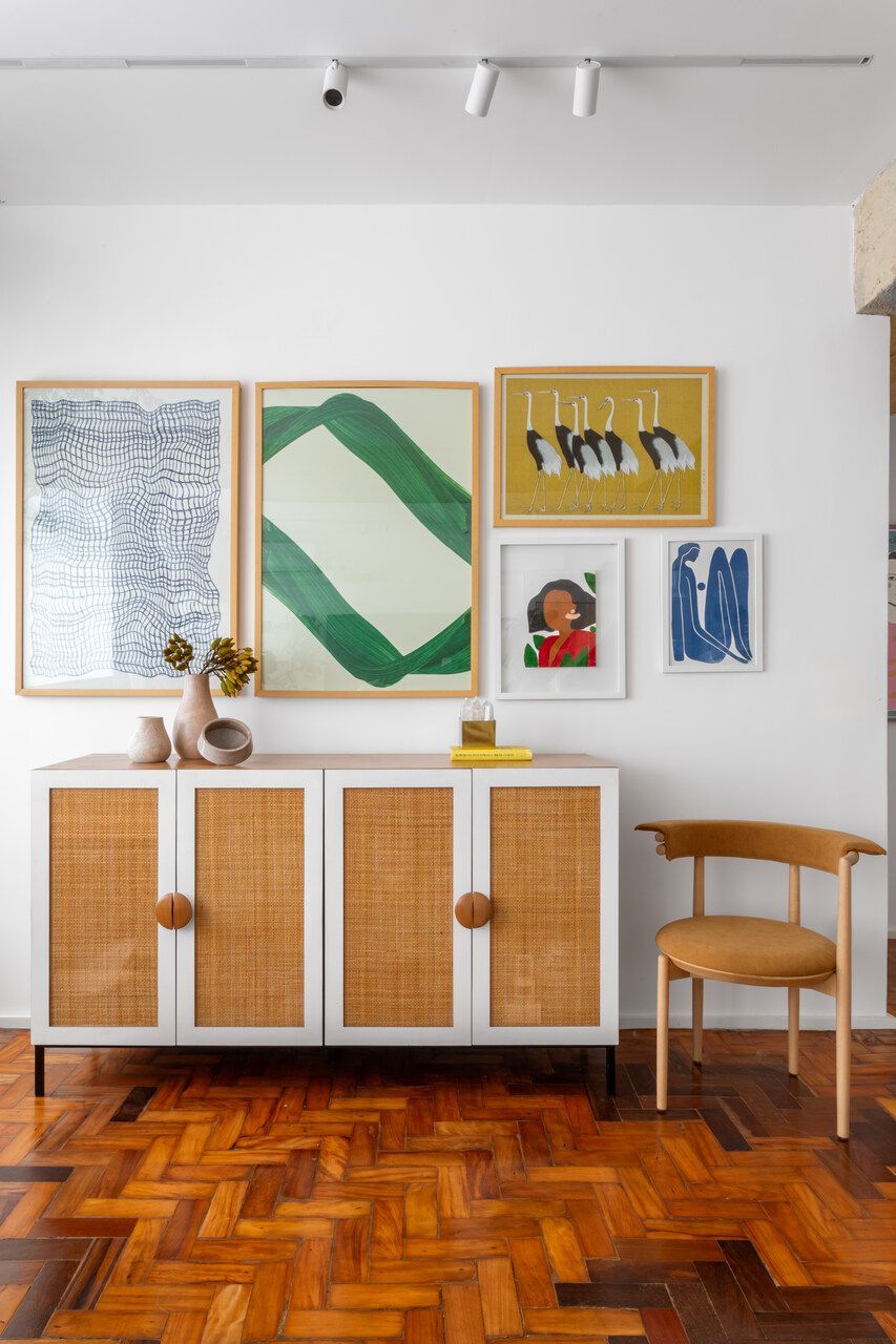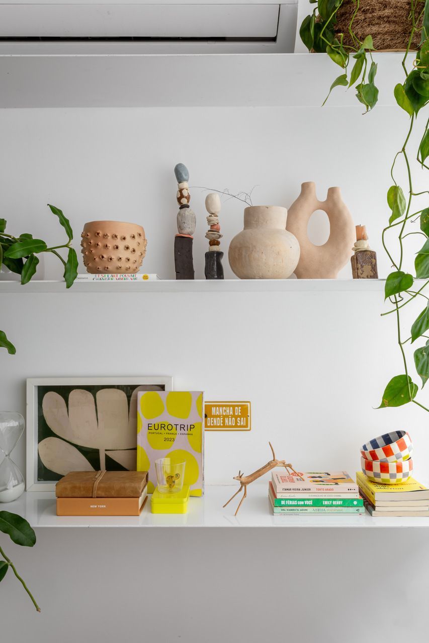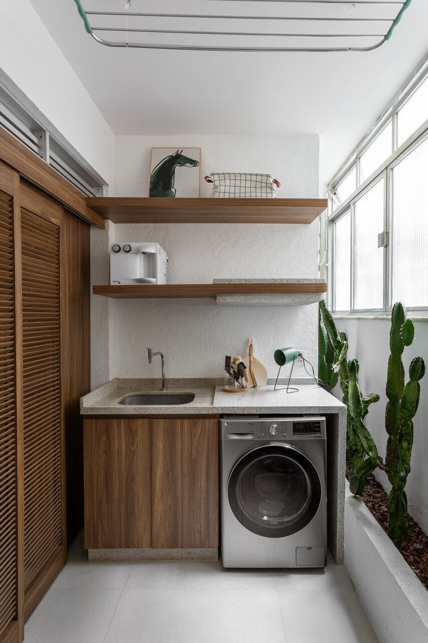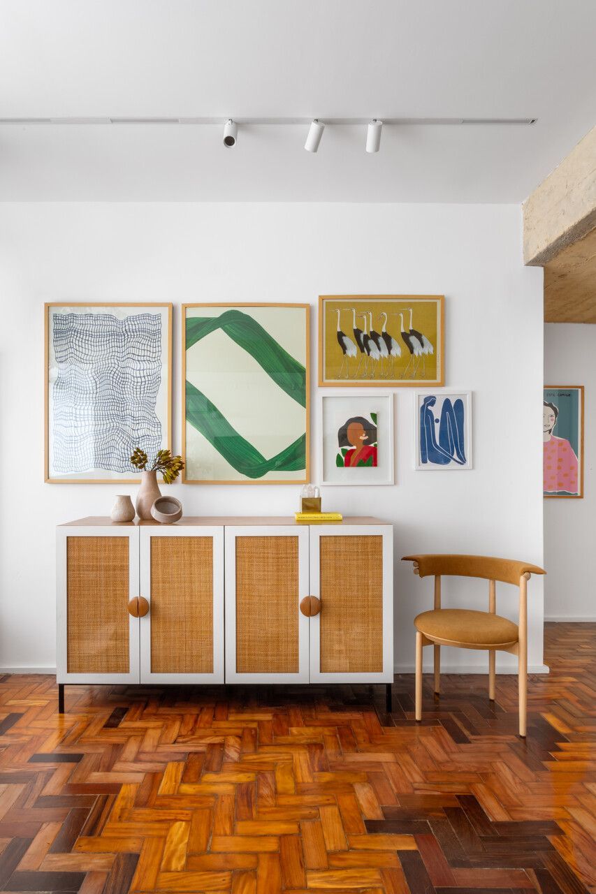 O projeto, classificado como contemporâneo brasileiro, valoriza a materialidade e a história do apartamento. A parede rústica da entrada, deixada no reboco e pintada de branco, junto com o saibro bruto das vigas, exemplifica a beleza da imperfeição. Trata-se de uma verdadeira ode à alma vibrante da família, expressa em uma poesia arquitetônica que ultrapassa os limites dos materiais e celebra a vida.