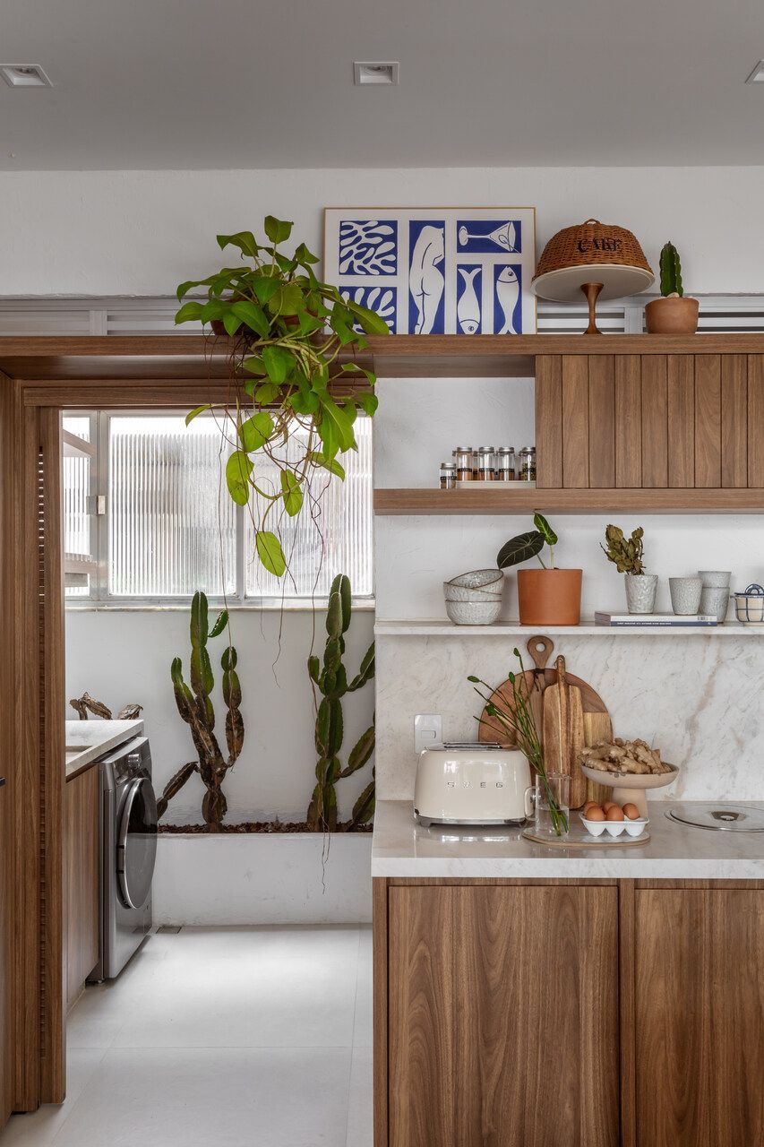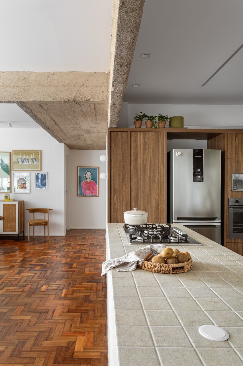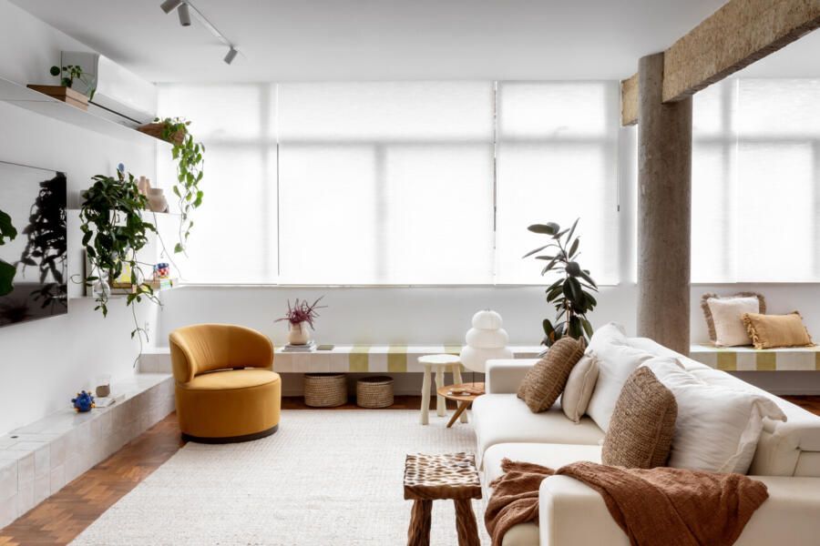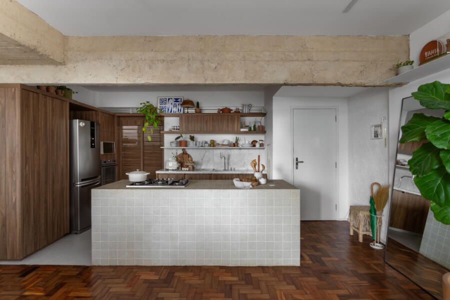 O projeto, localizado em Icaraí, Niterói, no Rio de Janeiro, assinado pelo pelo escritório Sensum Arquitetura é um apartamento contemporâneo brasileiro que celebra uma fusão entre a Bahia e o Rio de Janeiro, refletindo a essência da moradora Buanna Boechat, baiana com alma carioca. Os cômodos incluem um living integrado à cozinha, área de serviço, banheiro social, suíte master e o quarto do pequeno Nico. O destaque vai para a integração harmoniosa entre a cozinha e o living, marcada pelo contraste do taco natural com o revestimento frio da área da cozinha. Um banco, revestido em ladrilhos, conecta os ambientes de maneira sutil, enquanto a coluna redonda, deixada com acabamento bruto, transforma um antigo obstáculo em um elemento marcante.