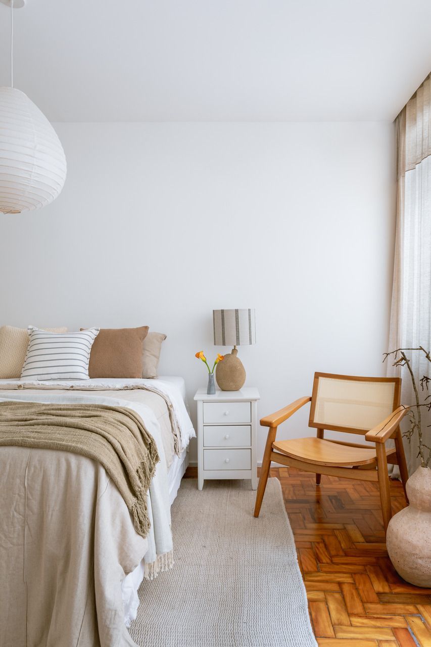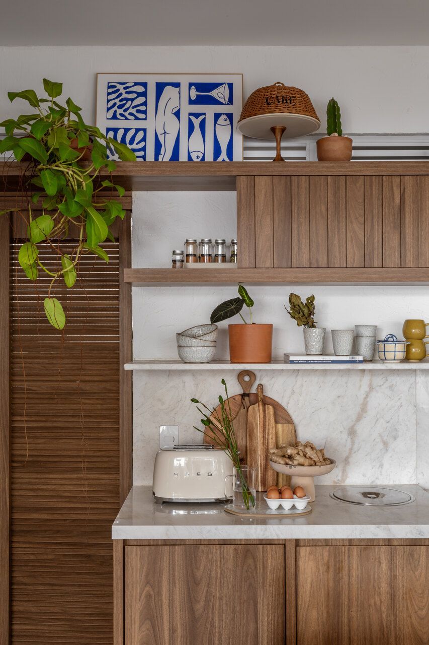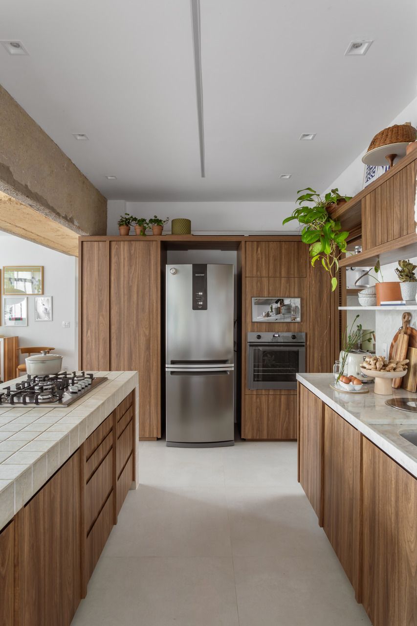 O projeto, localizado em Icaraí, Niterói, no Rio de Janeiro, assinado pelo pelo escritório Sensum Arquitetura é um apartamento contemporâneo brasileiro que celebra uma fusão entre a Bahia e o Rio de Janeiro, refletindo a essência da moradora Buanna Boechat, baiana com alma carioca. Os cômodos incluem um living integrado à cozinha, área de serviço, banheiro social, suíte master e o quarto do pequeno Nico. O destaque vai para a integração harmoniosa entre a cozinha e o living, marcada pelo contraste do taco natural com o revestimento frio da área da cozinha. Um banco, revestido em ladrilhos, conecta os ambientes de maneira sutil, enquanto a coluna redonda, deixada com acabamento bruto, transforma um antigo obstáculo em um elemento marcante.