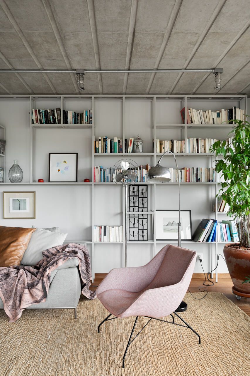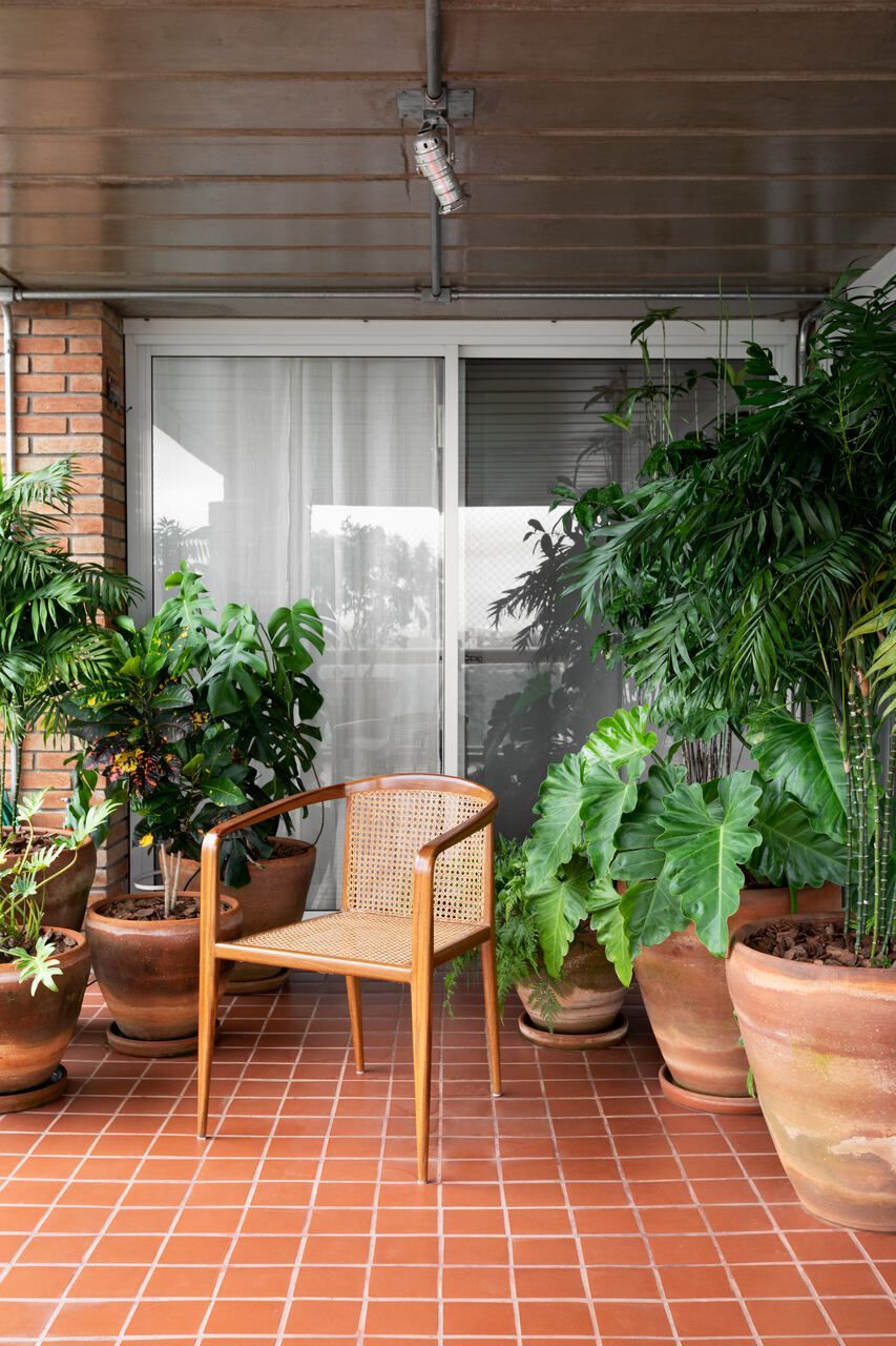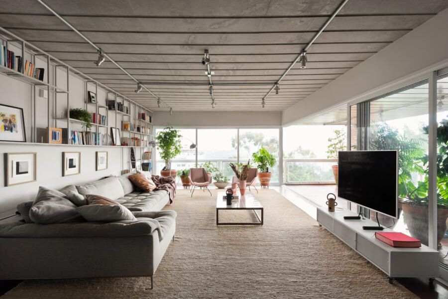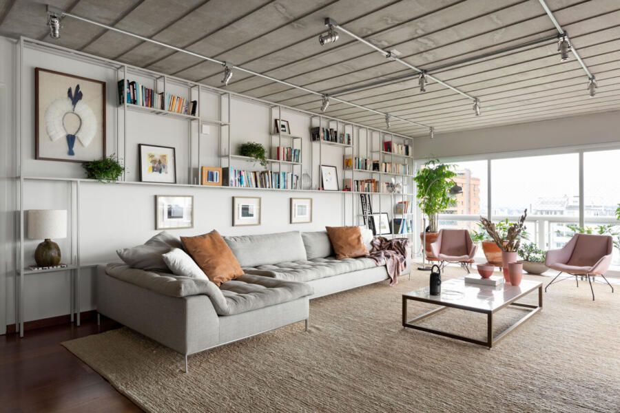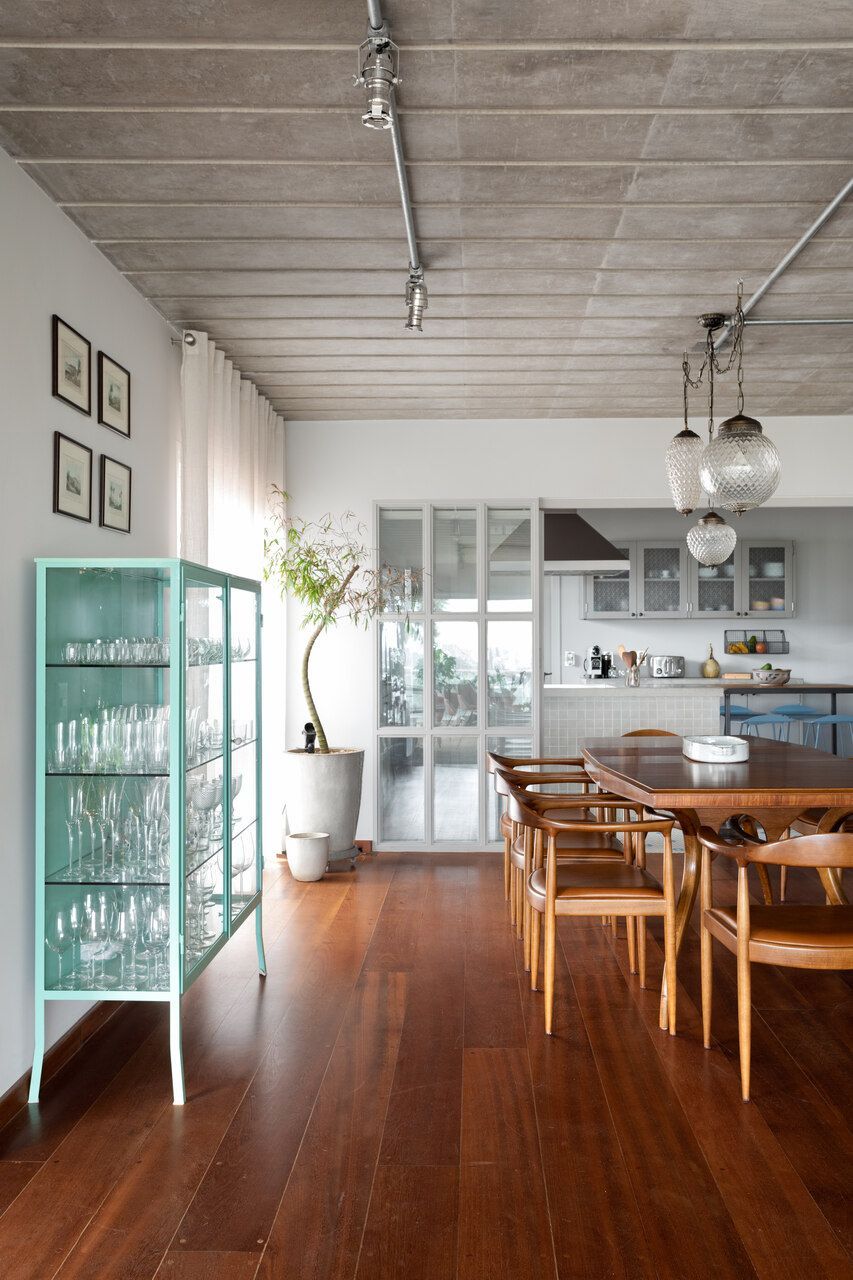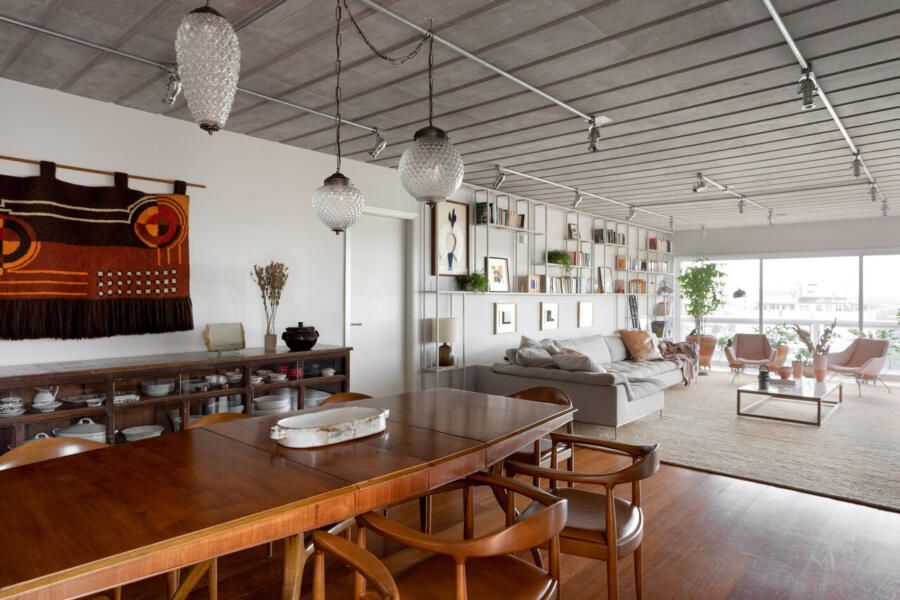 Memola Estudio: A renovação começa pela porta de entrada do apartamento que foi garimpada na Construverde já para dar um ar campestre, afinal é ela que vai receber a família todos os dias, além de dar as boas-vindas aos convidados. O forro do imóvel foi retirado e a laje existente, que era muito bonita, completamente revitalizada. Também foi desenvolvido um novo projeto de iluminação na área social. E apenas o piso em madeira foi mantido.