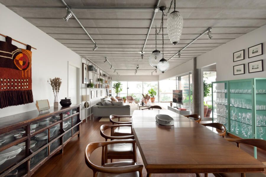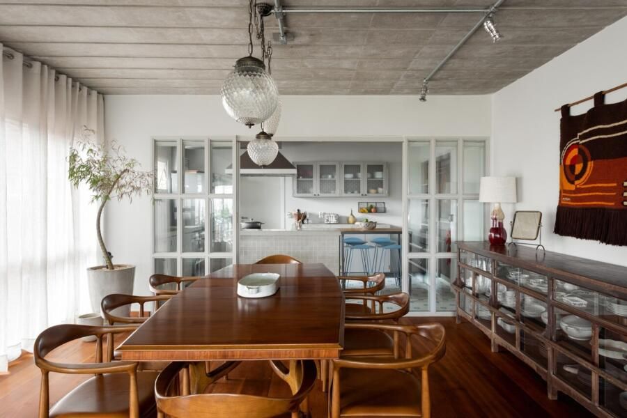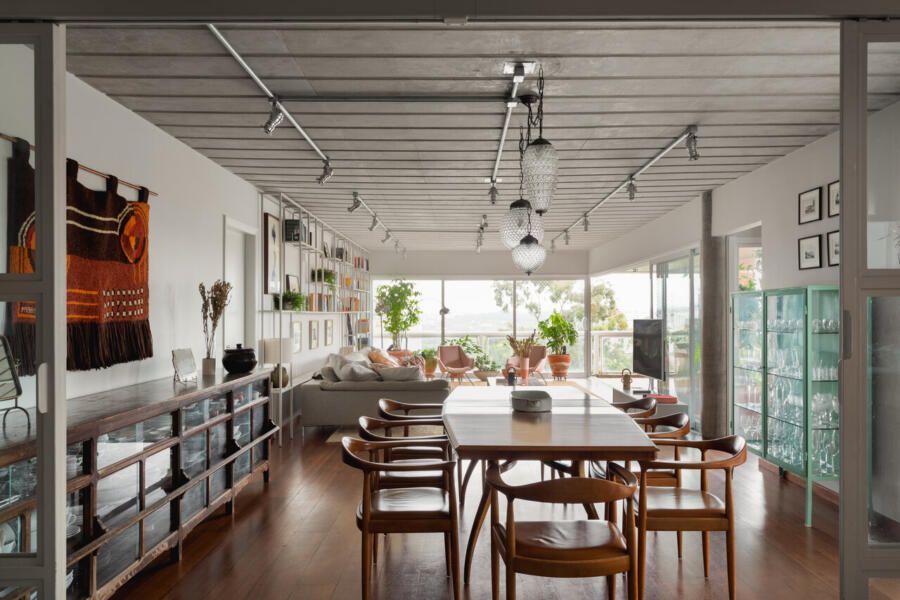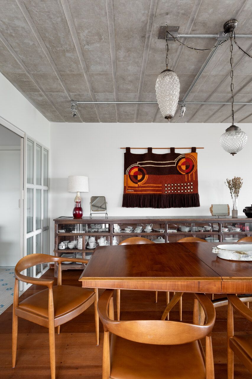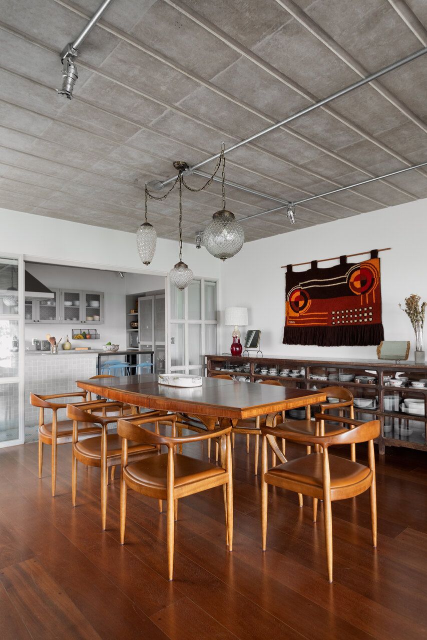 Quem assina o projeto é o escritório Memola Estúdio e o arquiteto Vitor Penha para uma família composta por mãe francesa, pai brasileiro e dois filhos pequenos. Boa parte dos objetos e mobiliário foi garimpada, enquanto outra parte foi feita exclusivamente para o projeto e com desenhos próprios.