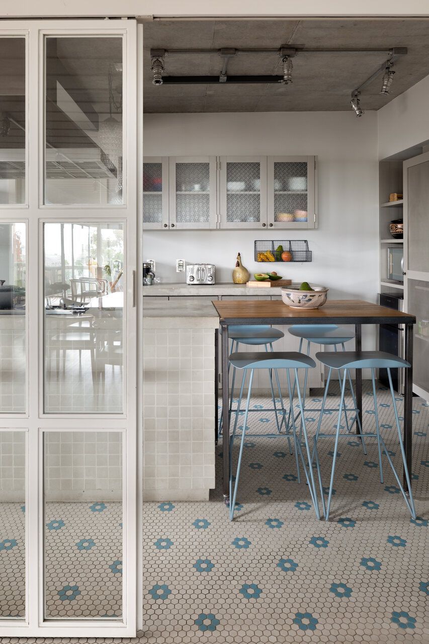 “A escolha do piso foi um dos pontos mais importantes para deixar o ambiente ainda mais elegante e charmoso, já que o escritório prioriza a mescla do industrial com o artesanal, do bruto ao delicado. O foco foi buscar por empresas que produzissem pastilhas antigas, hexagonais com desenhos de flores. E o resultado superou todas as expectativas da cliente.”