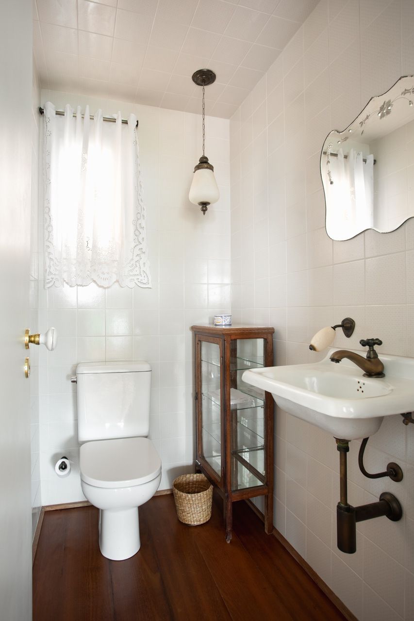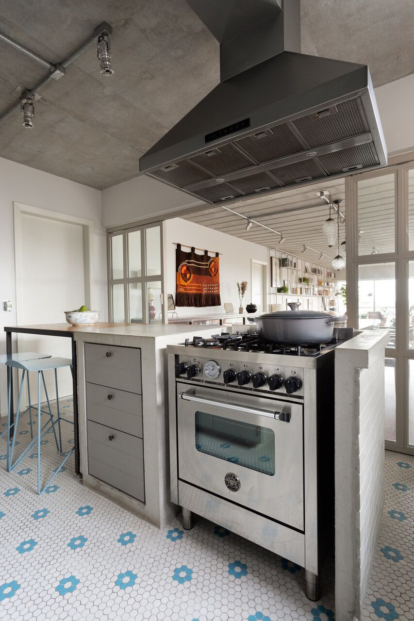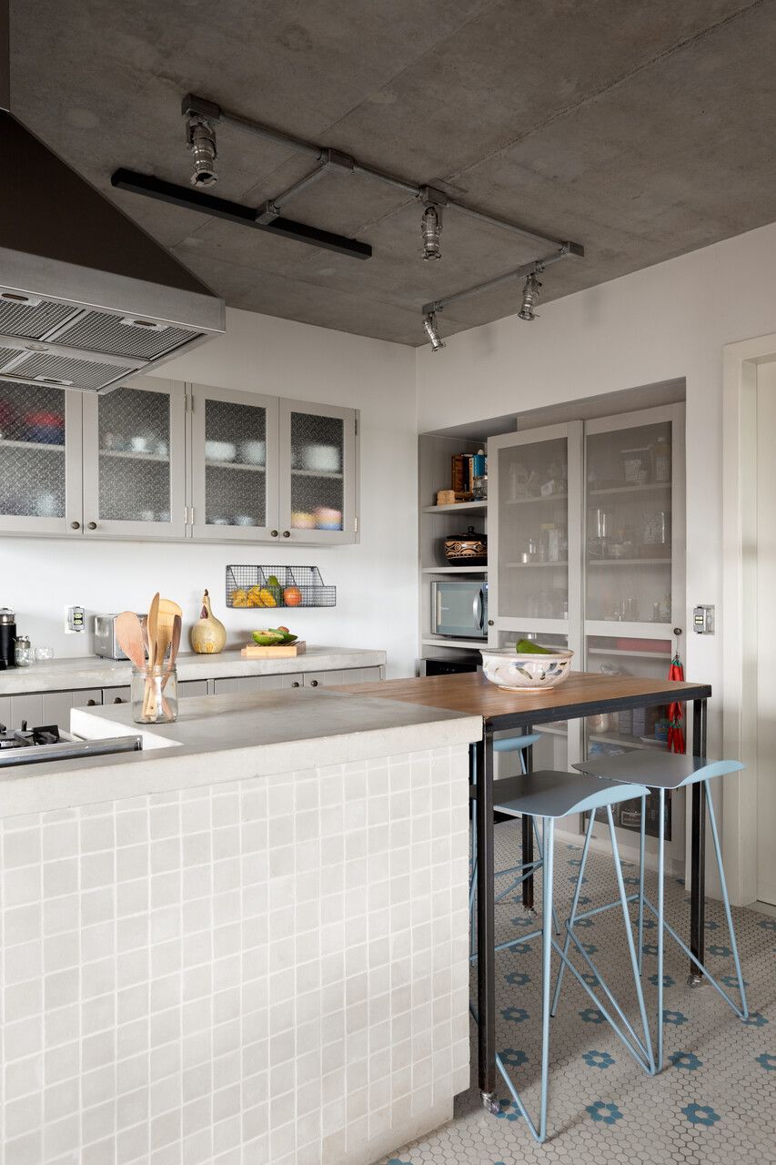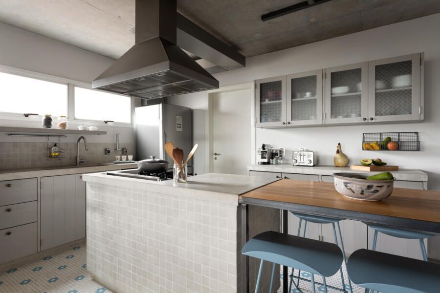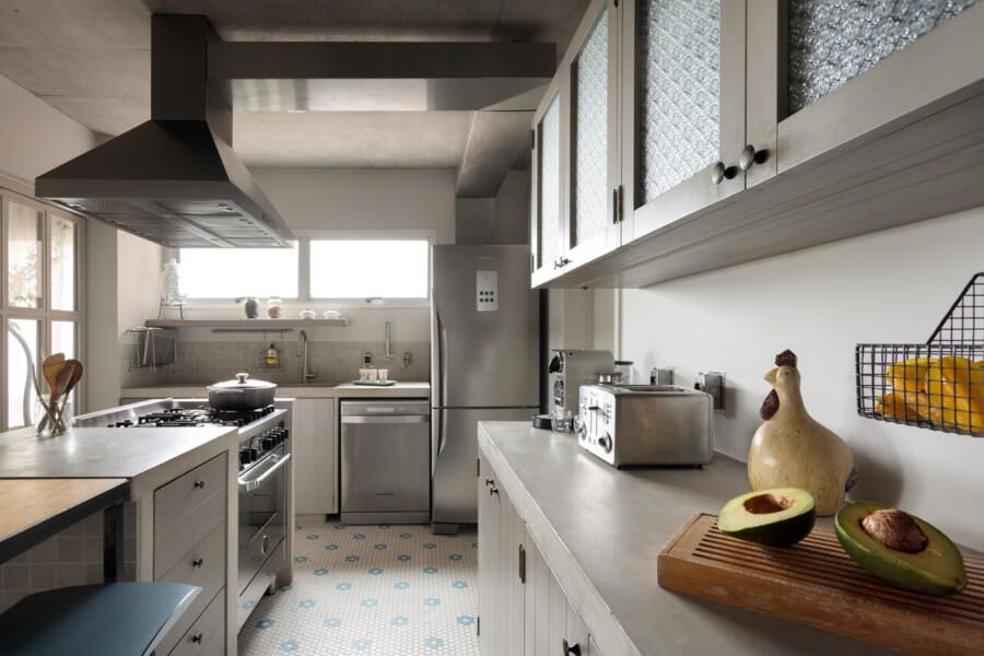 Memola Estudio: Todos os móveis da área social foram trocados, alinhando romantismo e delicadeza, detalhes finos com cores pontuais em harmonia com a rusticidade de uma casa de campo. Na cozinha, a bancada rústica, em concreto feito in loco, proporcionou o contraponto perfeito. Sua parte frontal recebeu ladrilho hidráulico em tom neutro, assim como a marcenaria, em cinza claro, para que todas as cores ficassem harmônicas e o piso recebesse a importância que merece.”