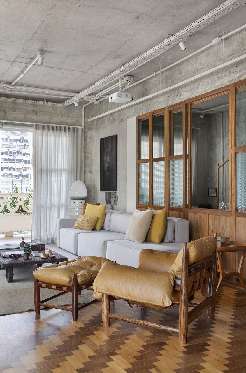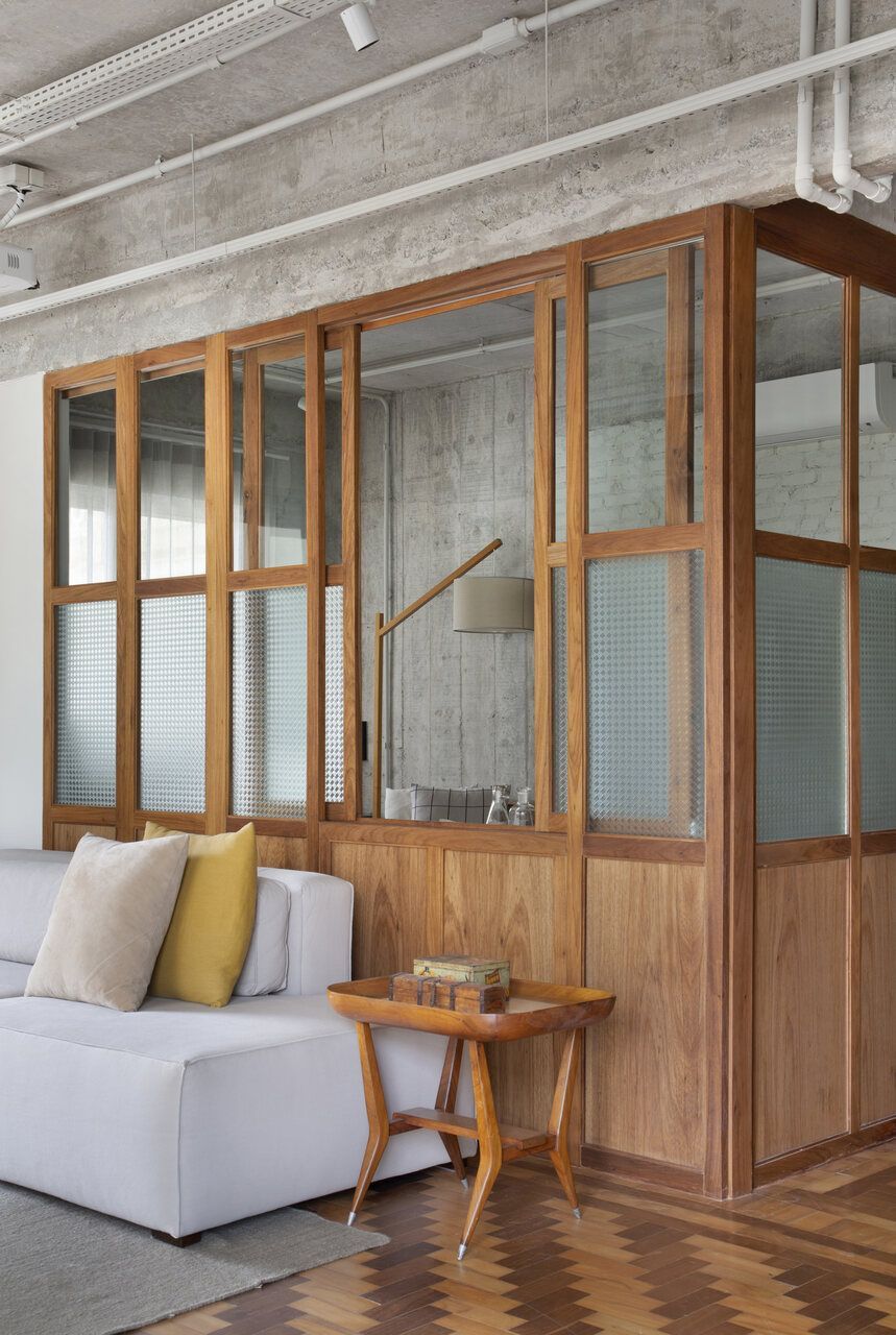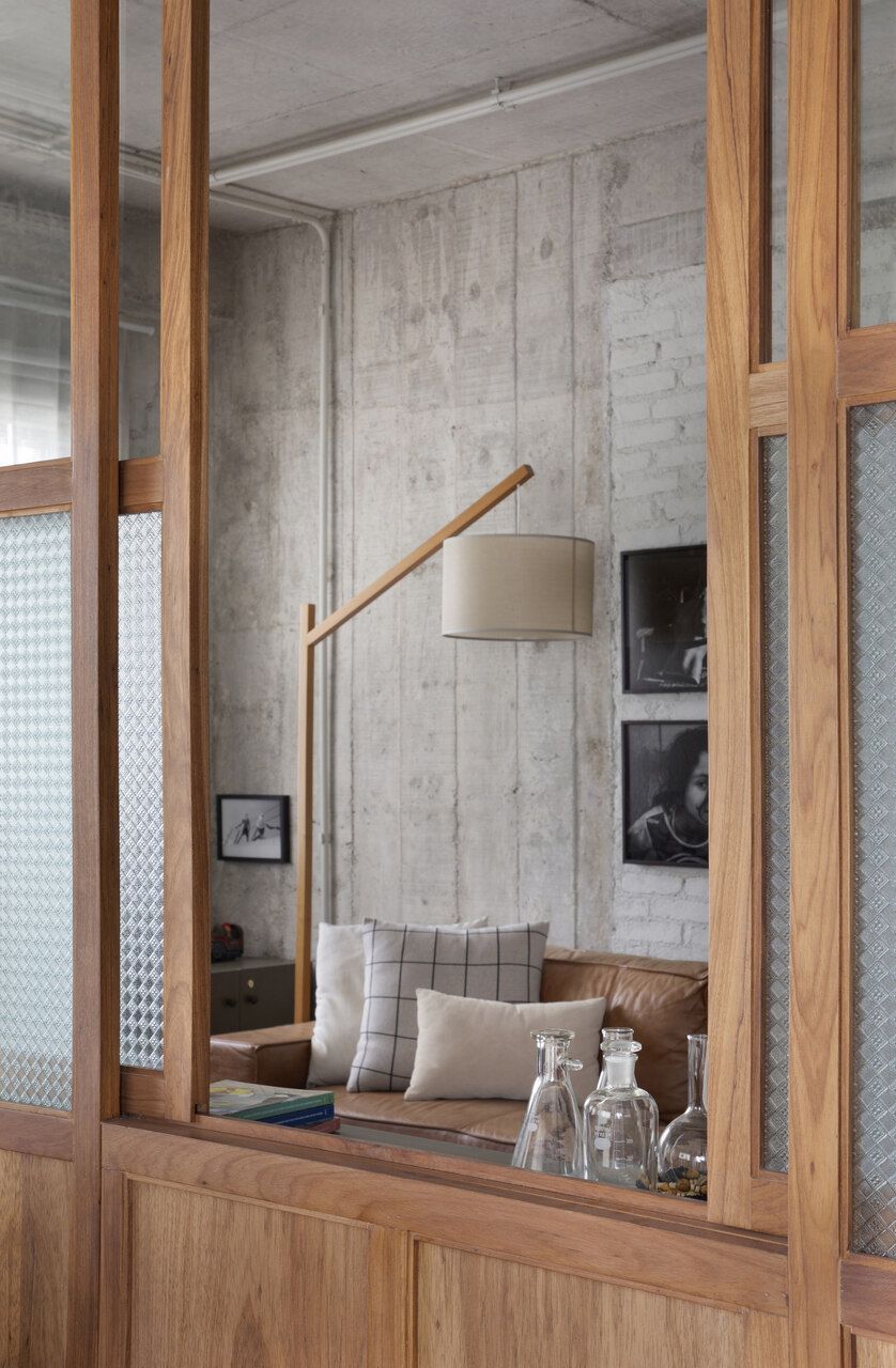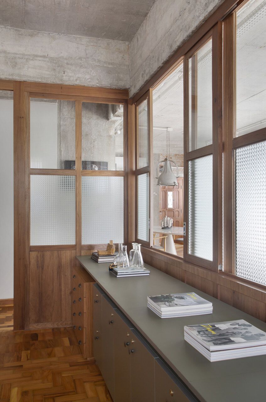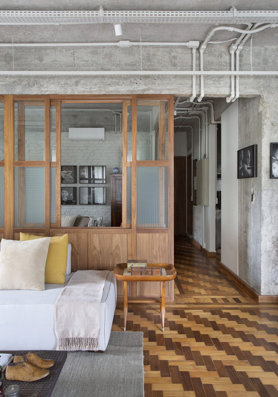 Memola Estudio: Grandes trechos de alvenaria foram demolidos no corredor íntimo e entre a cozinha e a sala, substituídos por nova caixilharia móvel de madeira e vidro à meia altura com a qual se pode variar da integração total à parcial e ao isolamento dos ambientes. Com a sua marcação vertical de panos, os caixilhos dão ritmo e unidade à aparente casualidade das recorrências do tijolinho à vista e do concreto aparente – de presença marcante no espaço. No alto, eles são delimitados pelas vigas de concreto deixadas à mostra e, abaixo, pelas faixas de tacos de madeira que sinalizam as remoções das paredes com a sua tonalidade destoante daquelas do belo piso geral do apartamento, paginado em escama de peixe.