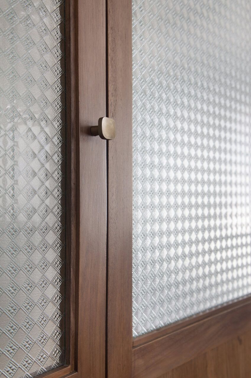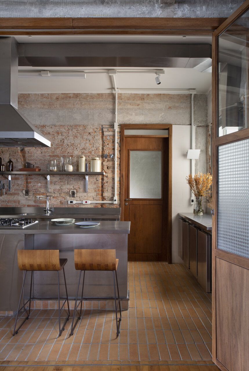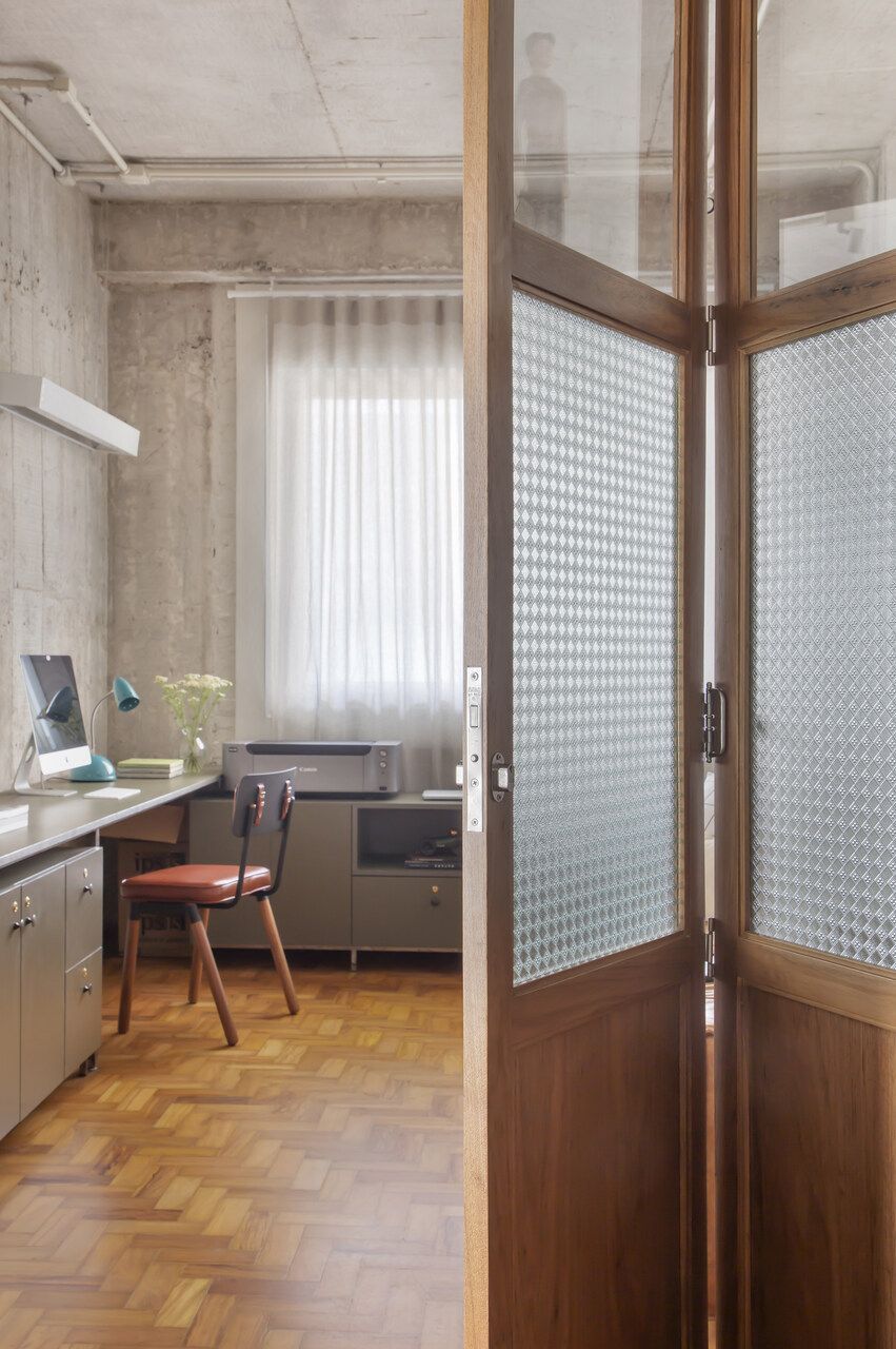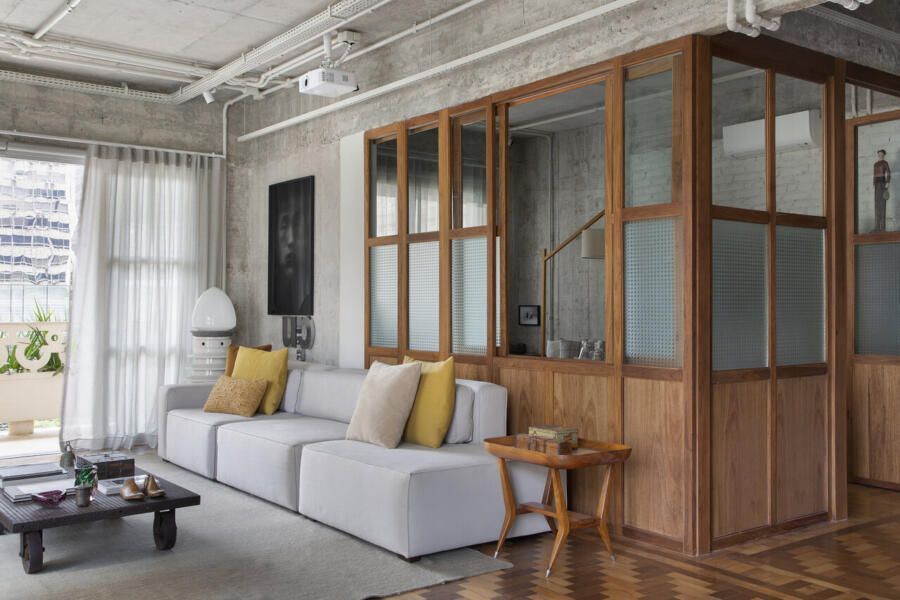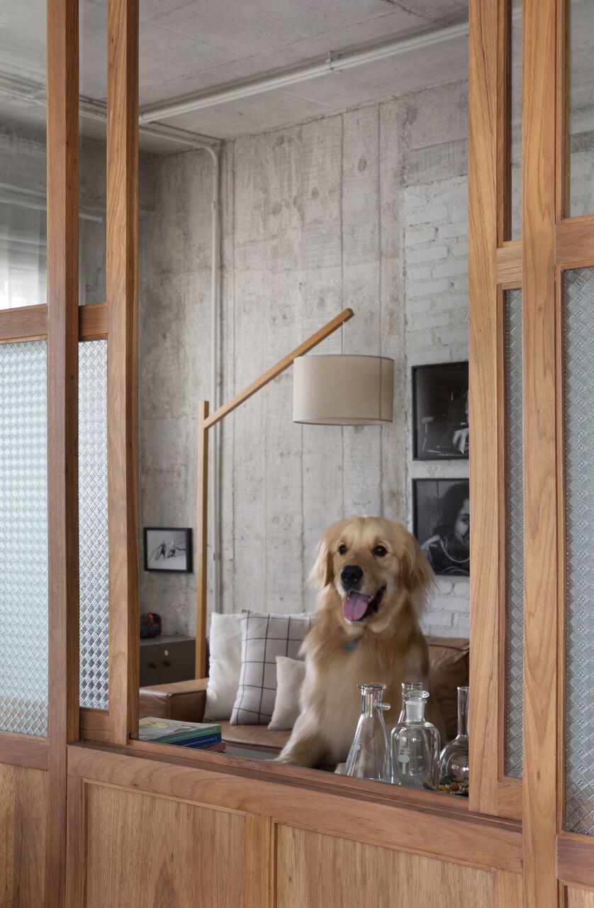 Memola Estudio: Grandes trechos de alvenaria foram demolidos no corredor íntimo e entre a cozinha e a sala, substituídos por nova caixilharia móvel de madeira e vidro à meia altura com a qual se pode variar da integração total à parcial e ao isolamento dos ambientes. Com a sua marcação vertical de panos, os caixilhos dão ritmo e unidade à aparente casualidade das recorrências do tijolinho à vista e do concreto aparente – de presença marcante no espaço. No alto, eles são delimitados pelas vigas de concreto deixadas à mostra e, abaixo, pelas faixas de tacos de madeira que sinalizam as remoções das paredes com a sua tonalidade destoante daquelas do belo piso geral do apartamento, paginado em escama de peixe.