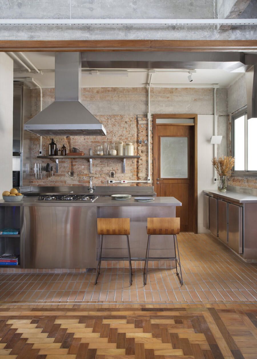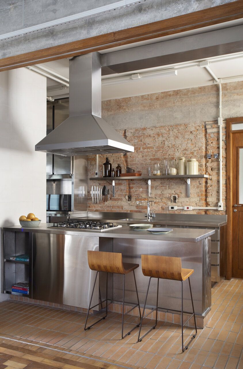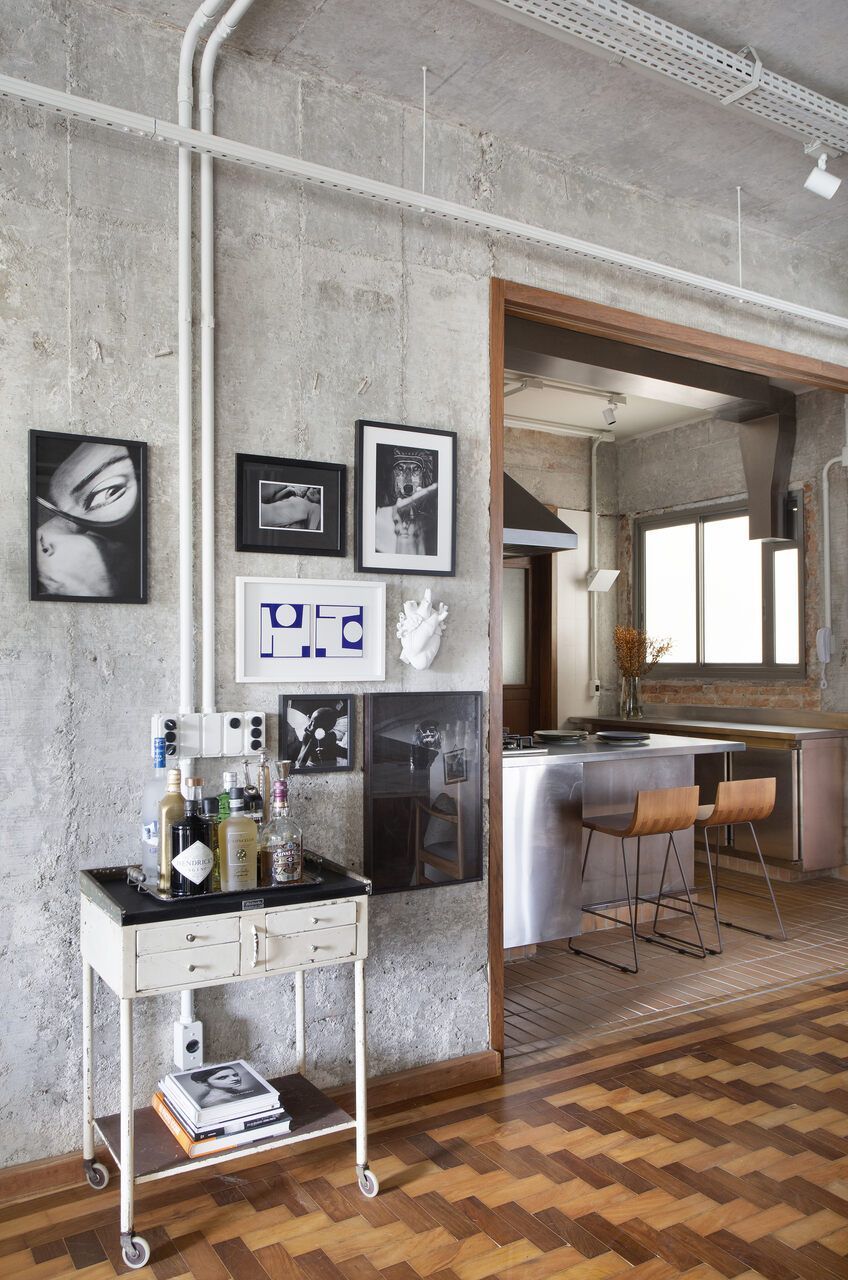 Memola Estudio: O universo industrial que participa do conceito do projeto está presente tanto nas instalações aparentes, com destaque para a rigorosa distribuição das tubulações ao longo de todo o apartamento, quanto nos elementos de aço inox que conformam as bancadas e móveis da cozinha e os móveis metálicos do escritório, instalado onde outrora havia um dos três dormitórios.