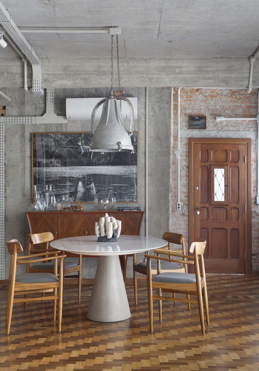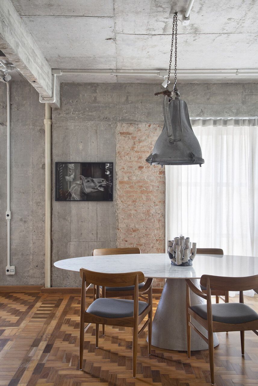 Com 160m², o conceito do apartamento visou criar uma atmosfera atemporal e inspirada em lofts de estilo industrial. Nele, materiais rústicos como o concreto e o tijolinho aparentes, mesclam-se perfeitamente ao aconchego de superfícies de madeira e objetos e mobiliário contemporâneo, além dos muitos garimpos espalhados pelo projeto.