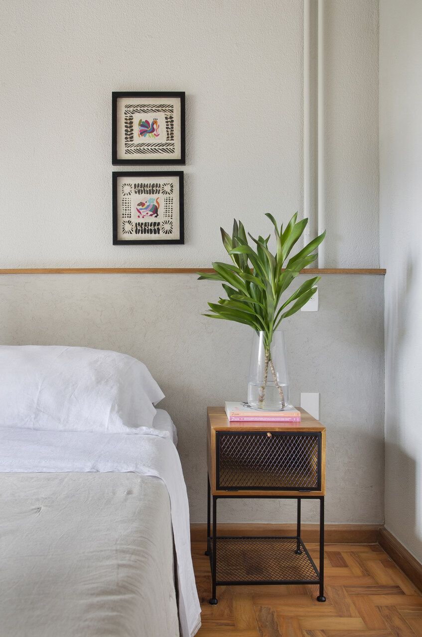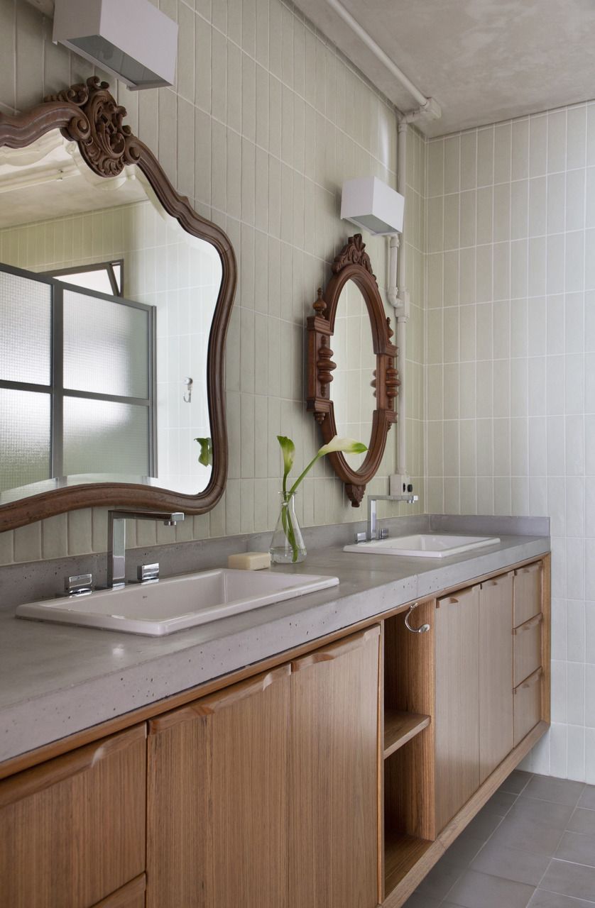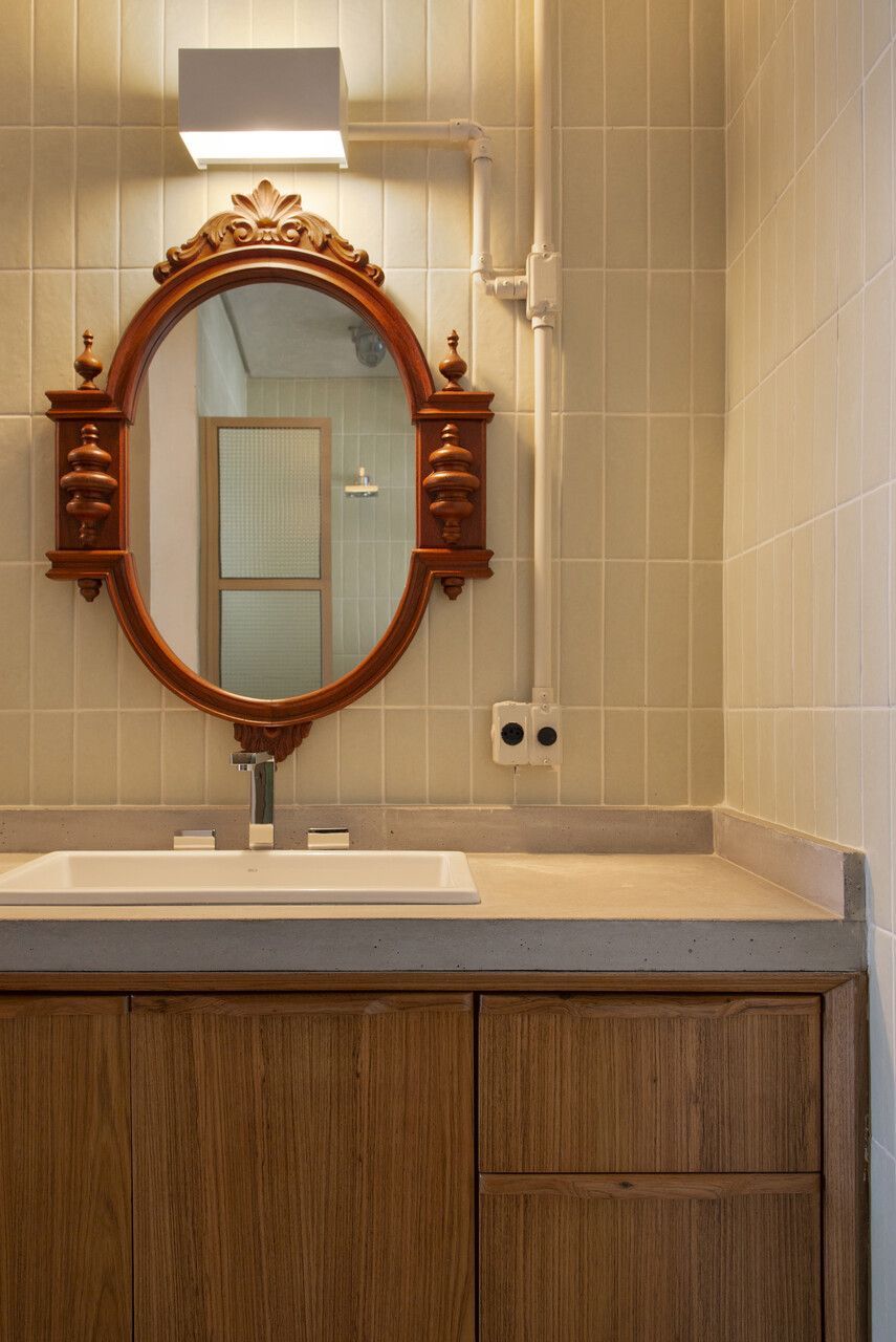 Memola Estudio: As demolições de alvenarias foram concentradas na área molhada – cozinha, área de serviço e banheiro -, com a mudança de layout reconfigurando completamente os dois primeiros a fim de melhorar os fluxos e integrar a cozinha com a área social, e o remanejamento do espaço possibilitando a inserção de um novo banheiro social lado a lado com o banheiro da suíte. Todo o piso desta zona do apartamento foi modificado, com a instalação de piso cerâmico com aparência rústica e tom terroso na área de serviço e cozinha, vizinha à entrada.