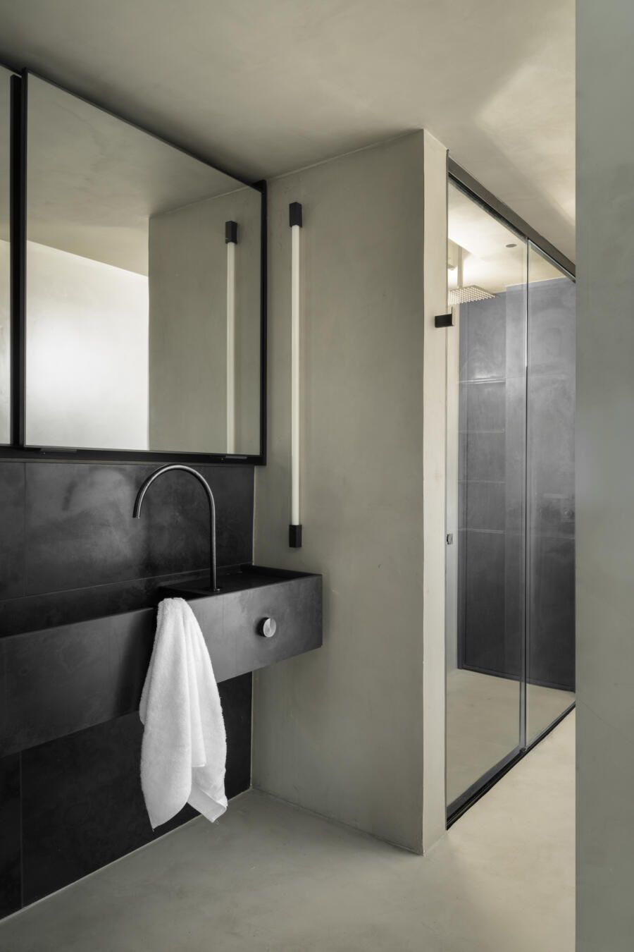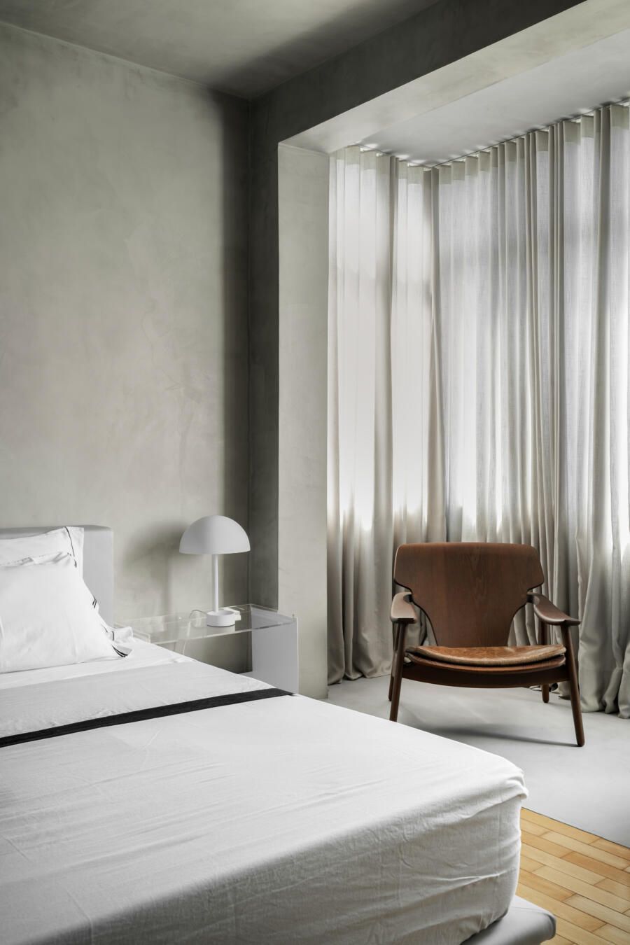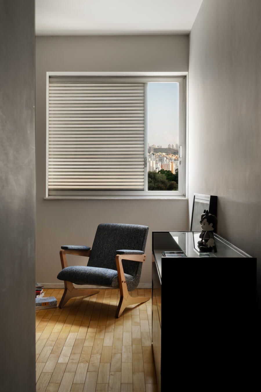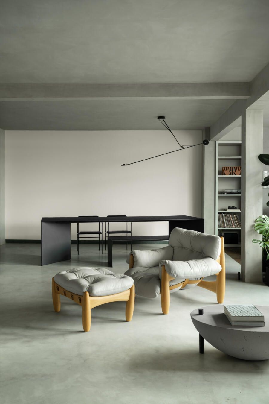 Com 300m2, o principal material usado é o tecnocimento, um material simples e de fácil manutenção que se espalha por todo o piso, teto e paredes da casa. Apesar de sua atmosfera moderna e minimalista, o arquiteto mostra sua identidade mineira ao resgatar as cores vibrantes da cidade no corredor que dá acesso à área íntima e na preservação do piso de peroba original nos quartos, em uma harmonia entre o novo e o antigo.