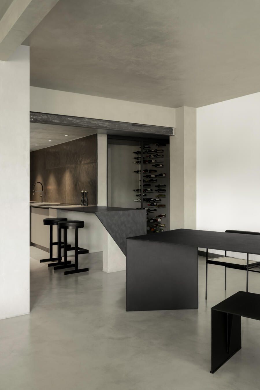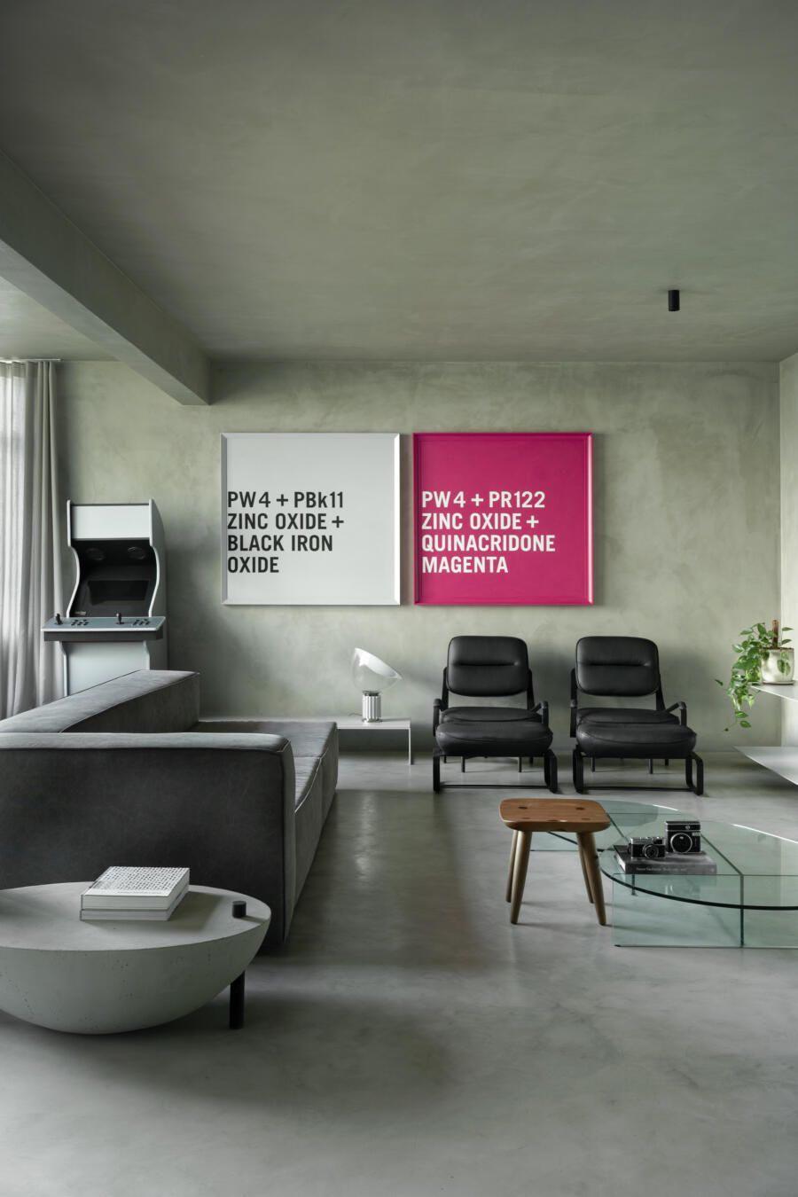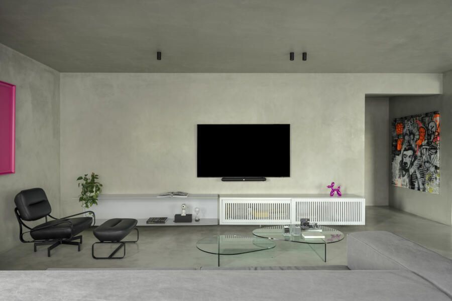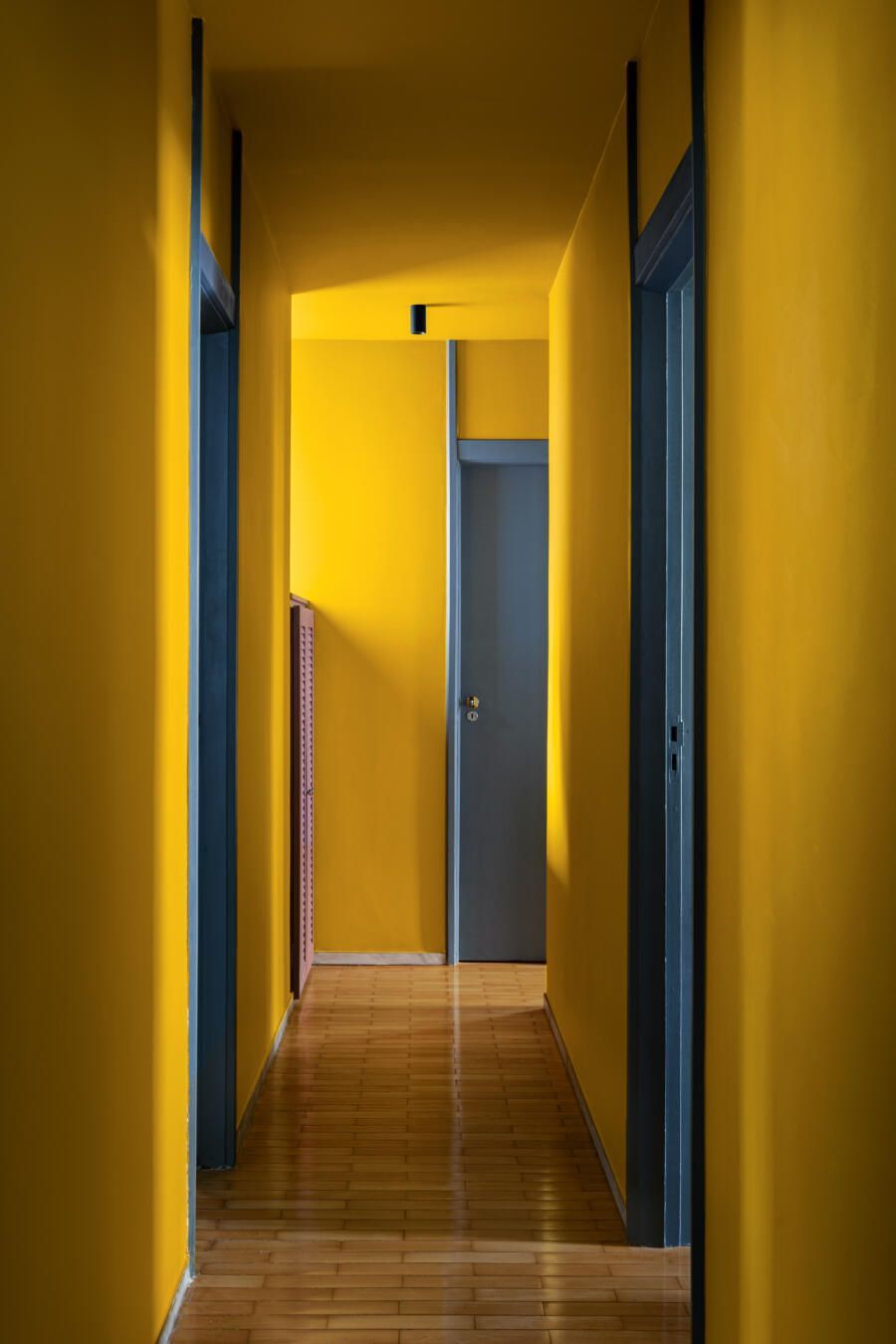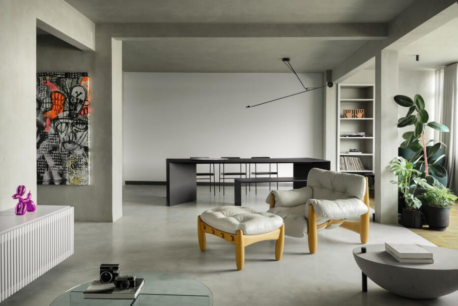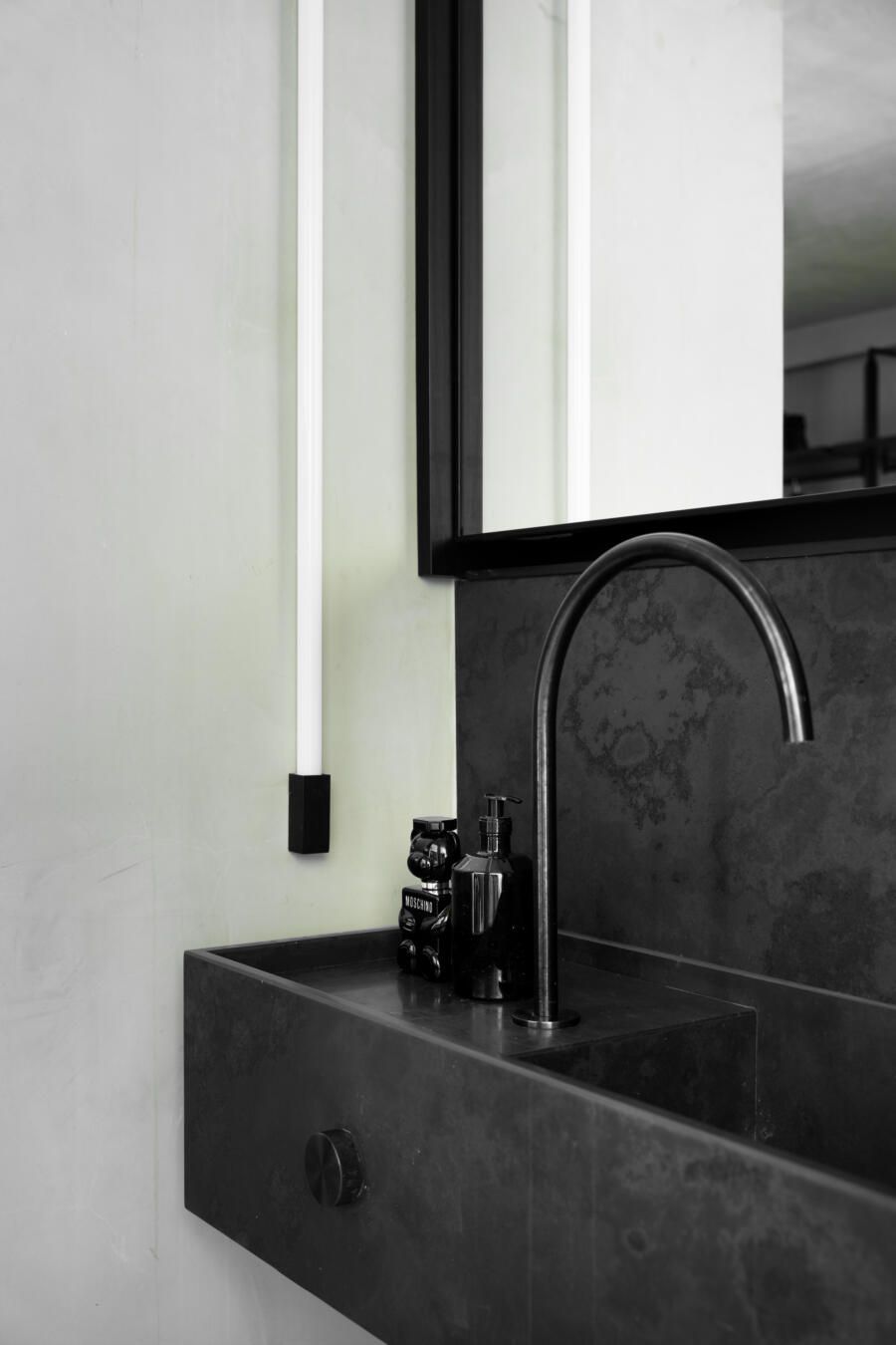 Com 300m2, o principal material usado é o tecnocimento, um material simples e de fácil manutenção que se espalha por todo o piso, teto e paredes da casa. Apesar de sua atmosfera moderna e minimalista, o arquiteto mostra sua identidade mineira ao resgatar as cores vibrantes da cidade no corredor que dá acesso à área íntima e na preservação do piso de peroba original nos quartos, em uma harmonia entre o novo e o antigo.