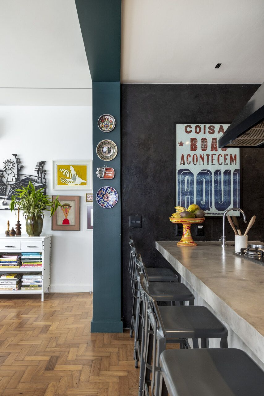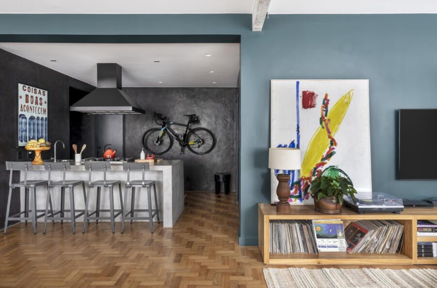 O apartamento possui uma sala ampla integrada a uma cozinha gourmet, um lavabo, e três quartos, sendo uma suíte. Há também uma cozinha tradicional, utilizada com menos frequência no dia a dia. Um dos destaques do projeto é a sala integrada à cozinha gourmet, onde o revestimento em tadelakt traz um toque artesanal e exclusivo. Este espaço, anteriormente uma sala de jantar, foi transformado para criar um ambiente mais dinâmico e acolhedor, promovendo interações familiares de maneira mais fluida.