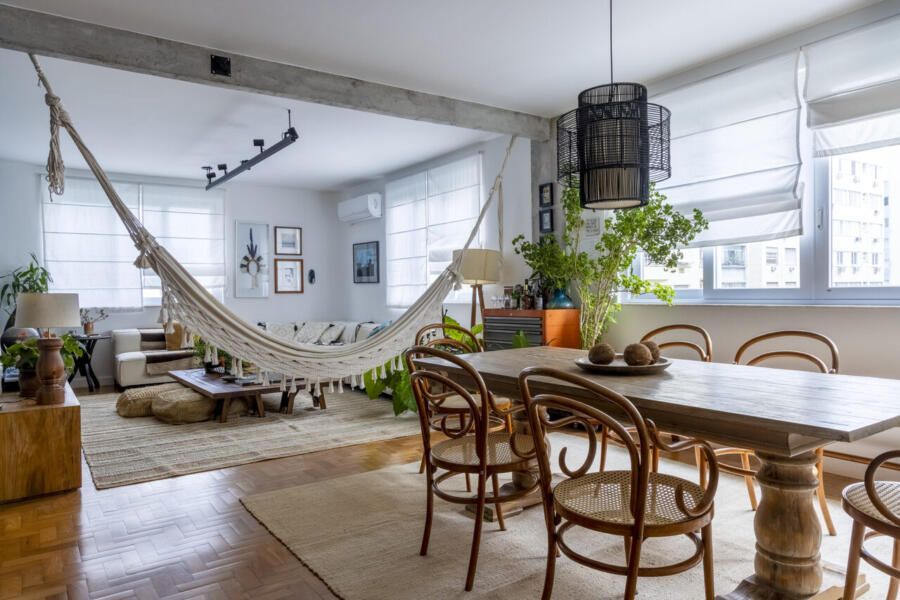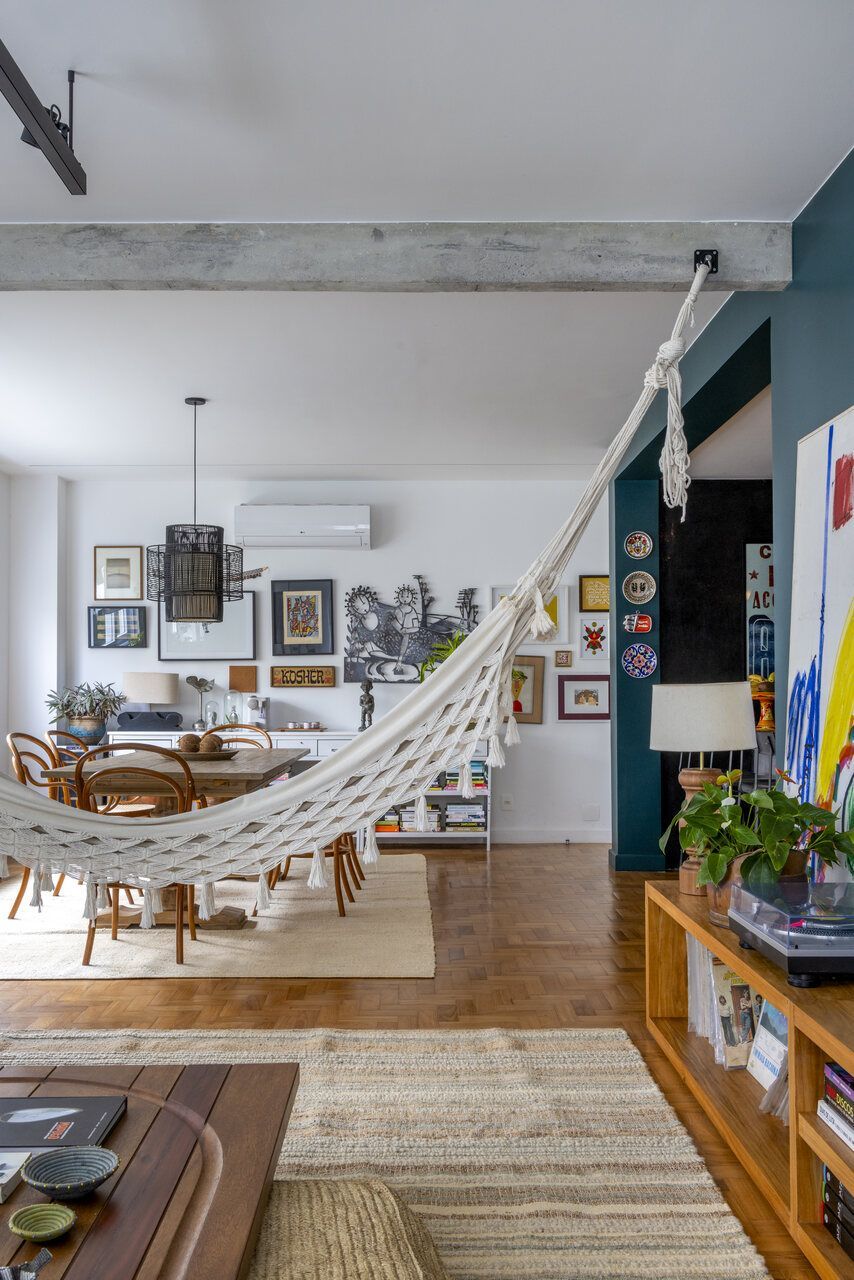 Camila descreve seu apartamento como “uma casa que é só nossa”, evitando classificações tradicionais. Mais do que um estilo, o imóvel é uma extensão de sua essência e vivências. A rede instalada em um dos ambientes simboliza a leveza e o aconchego que permeiam o projeto, convidando qualquer visitante a compreender a alma da casa apenas ao se deitar nela.