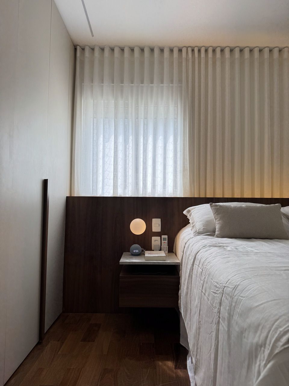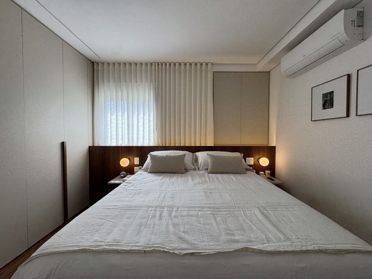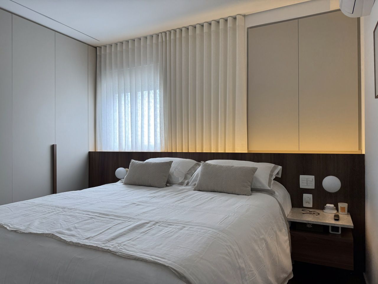 Botamos quase todas as paredes abaixo, integração total da área social, mudança de layout na área íntima, transformação de dois banheiros em um.