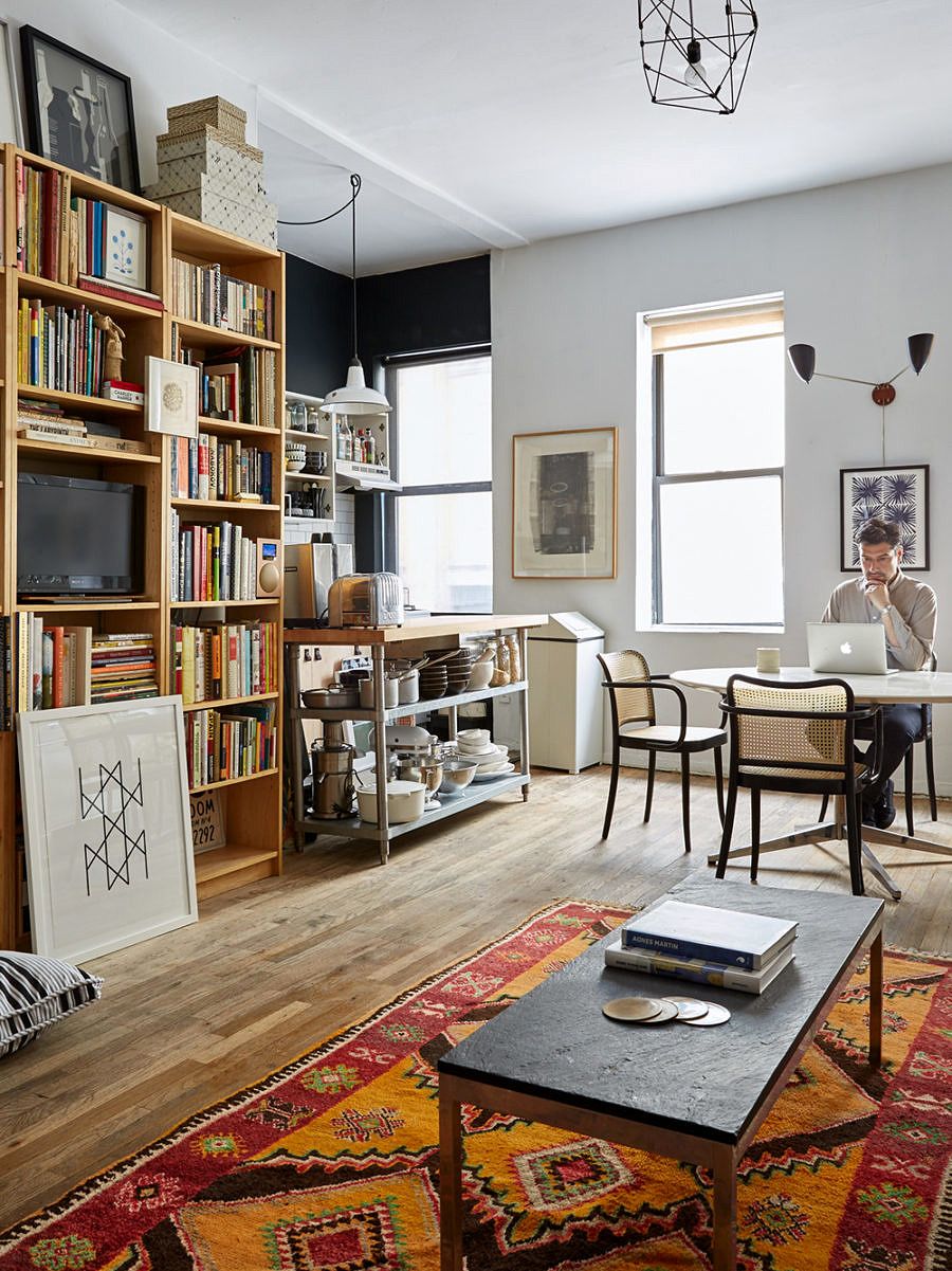 Outra ideia é a integração dos espaços, que acaba sendo inevitável na maioria dos casos de apartamentos pequenos. Nesse apartamento, ter a cozinha, sala de jantar, sala de estar, home office e até uma biblioteca unidos no mesmo m², foi uma maneira de agregar as pessoas e atividades de quem vive ali.
