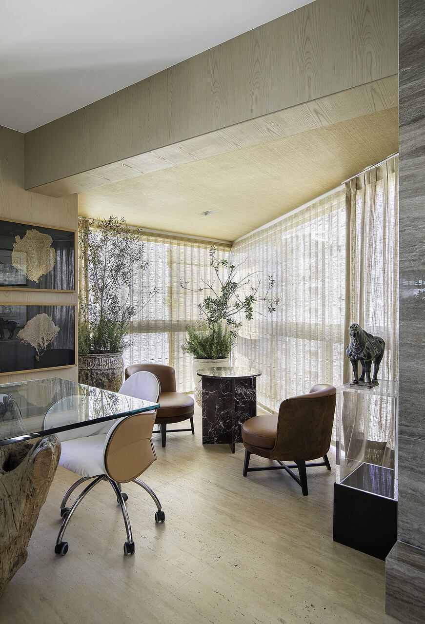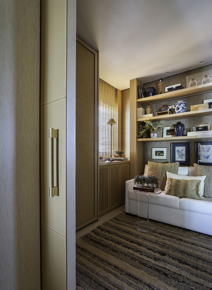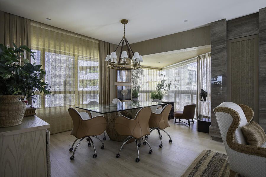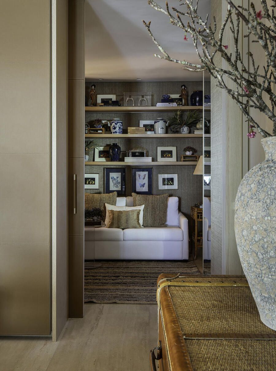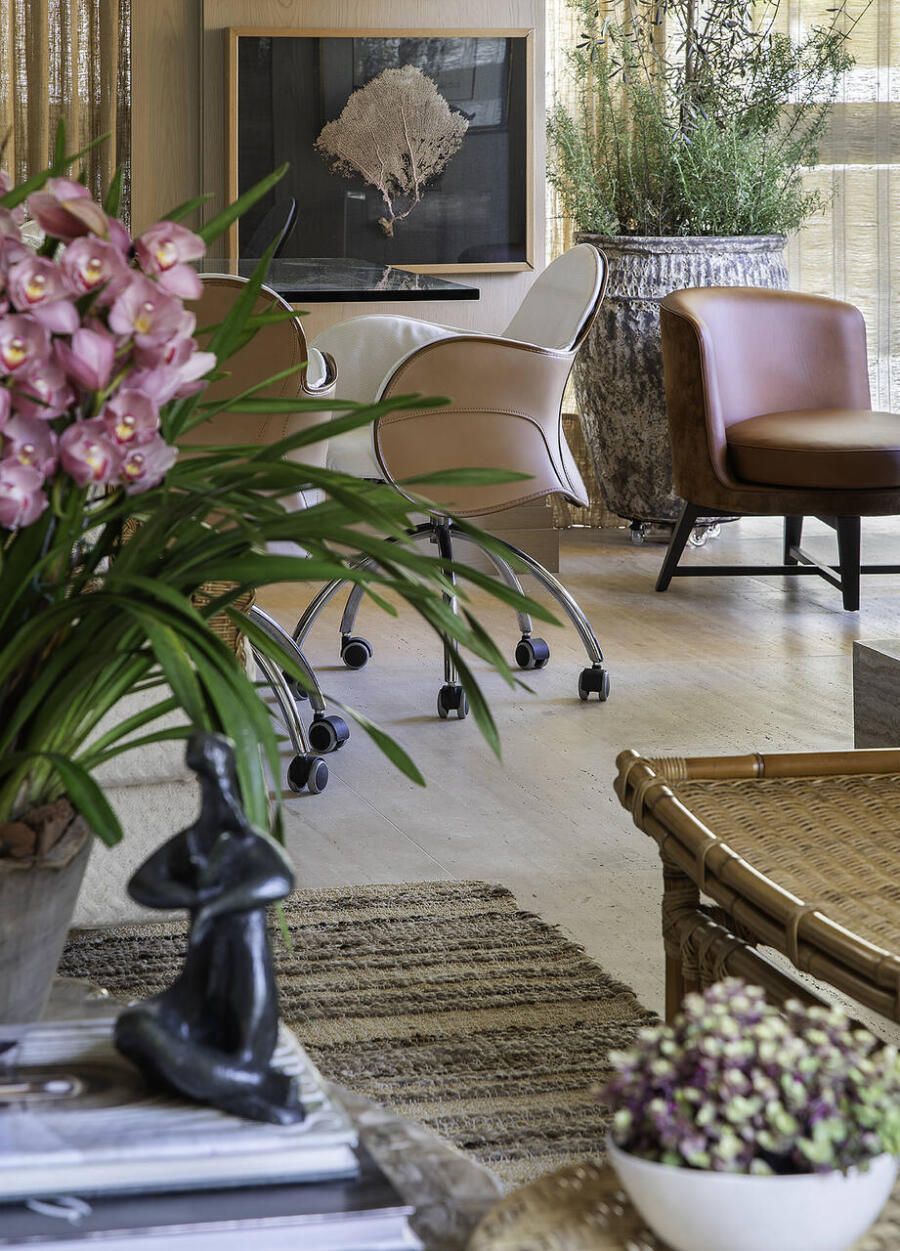 A inspiração vem do chic despretensioso de Ralph Lauren, referência direta para o uso do couro caramelo, do linho branco, da palha de seda, do carvalho americano e do mármore Travertino no piso. Tudo conversa entre si com naturalidade, sem excessos, criando uma atmosfera elegante e atemporal. É um apartamento com DNA forte, mas que não cansa, e sim convida a ficar.