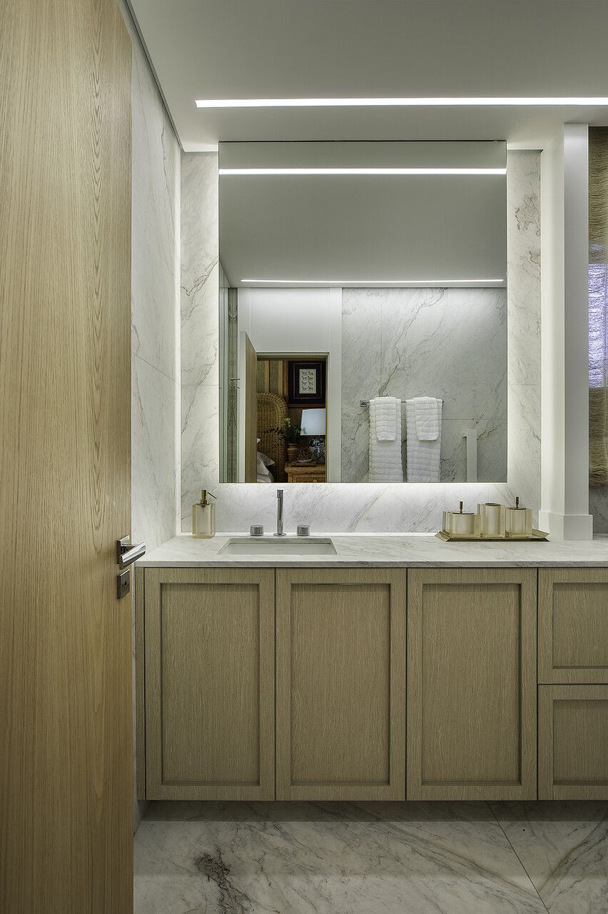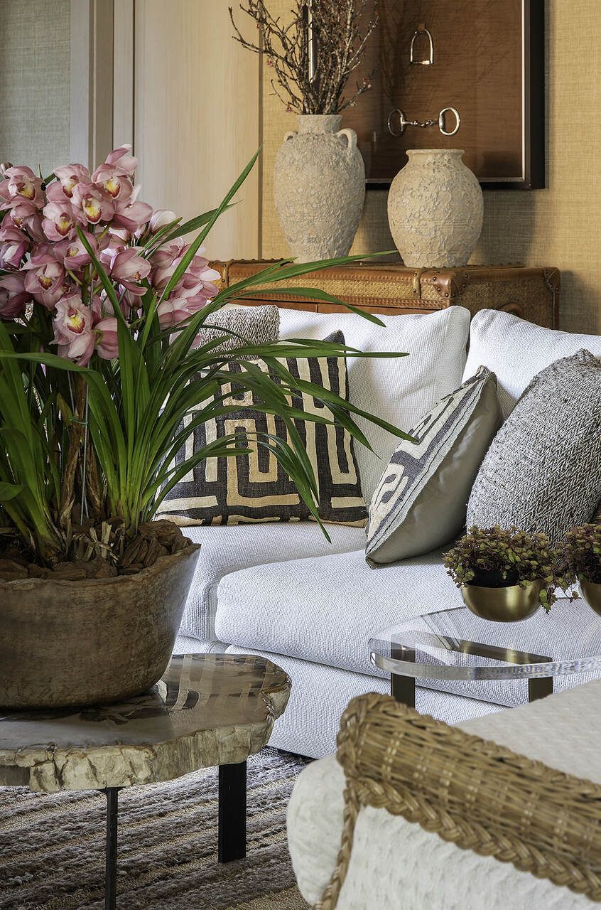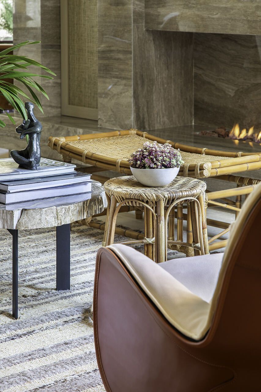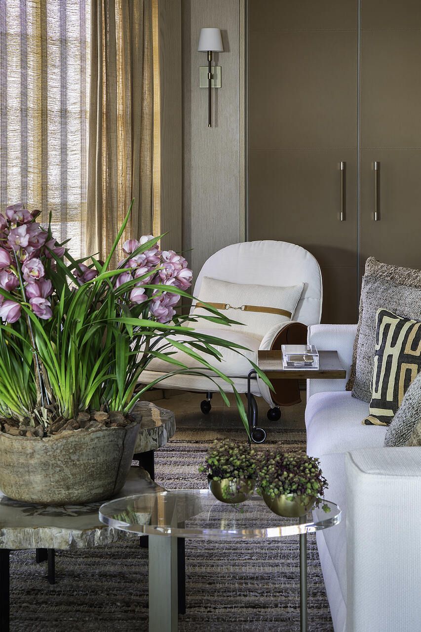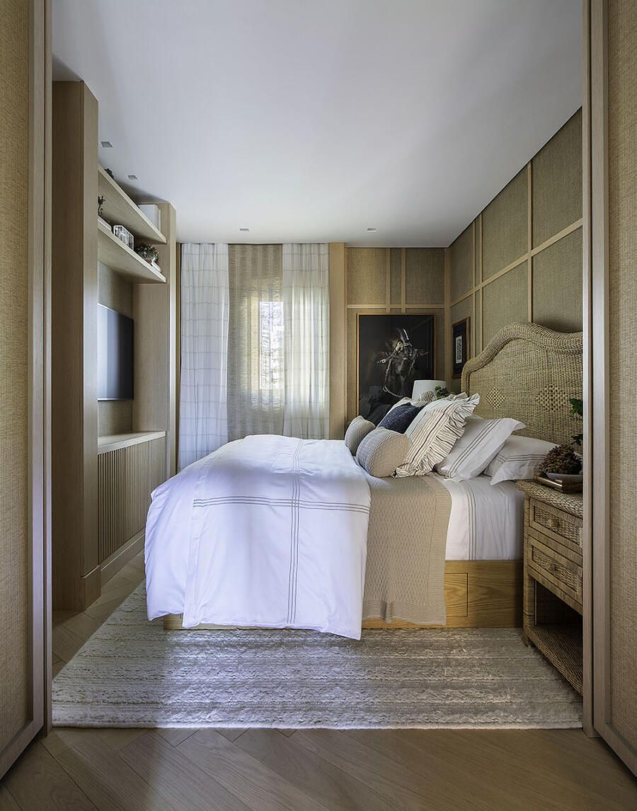 A inspiração vem do chic despretensioso de Ralph Lauren, referência direta para o uso do couro caramelo, do linho branco, da palha de seda, do carvalho americano e do mármore Travertino no piso. Tudo conversa entre si com naturalidade, sem excessos, criando uma atmosfera elegante e atemporal. É um apartamento com DNA forte, mas que não cansa, e sim convida a ficar.
