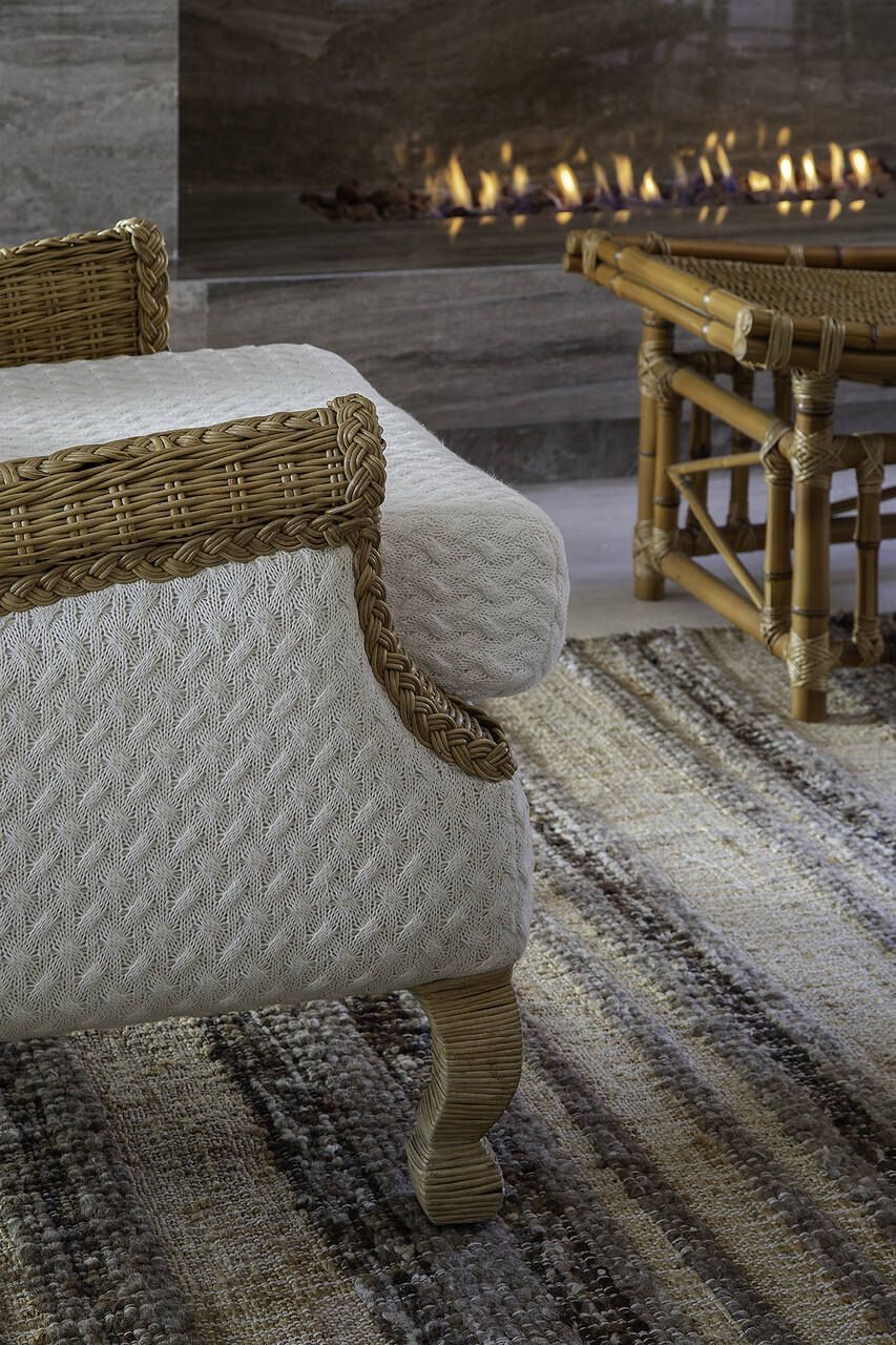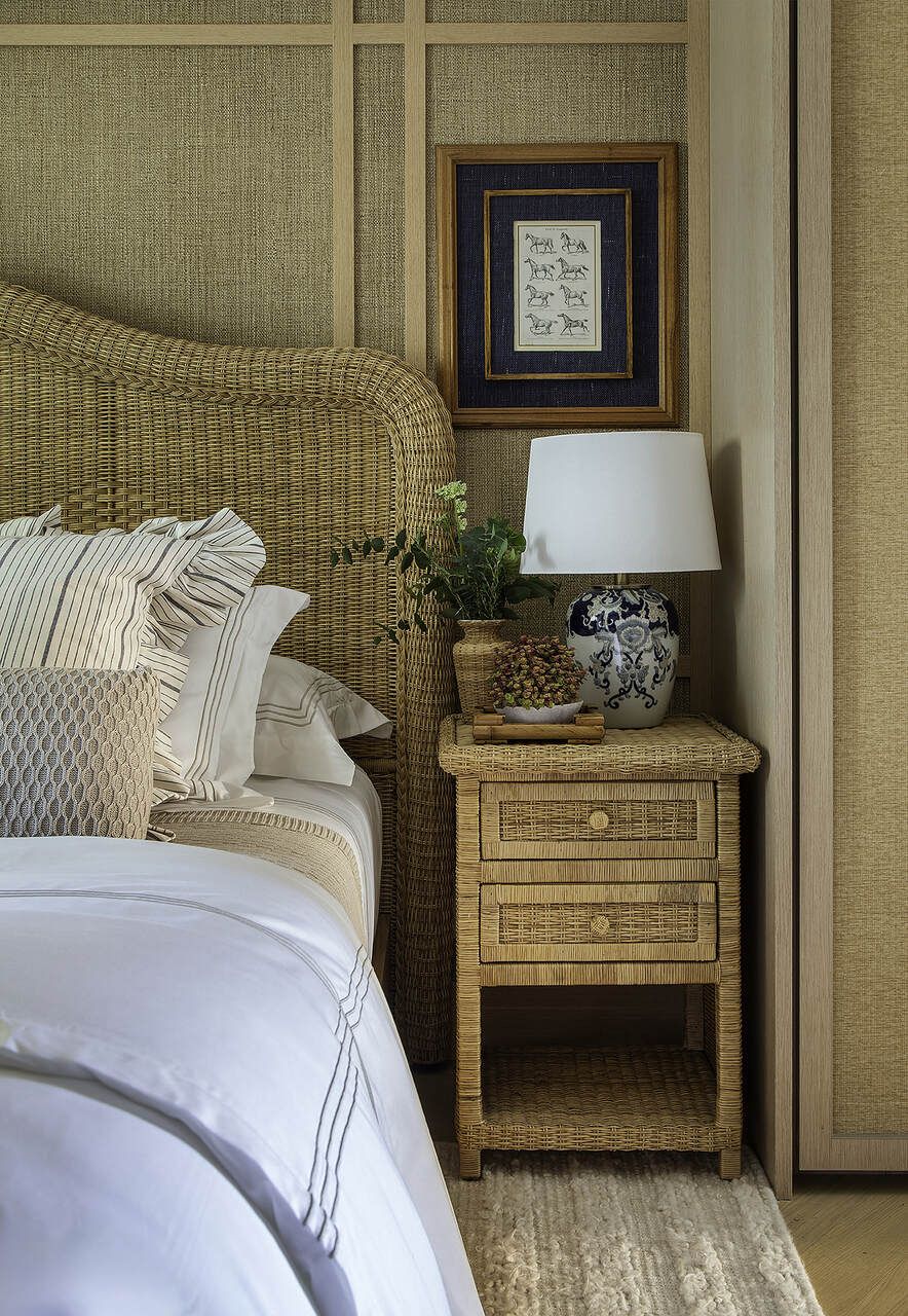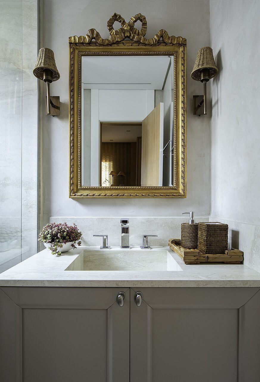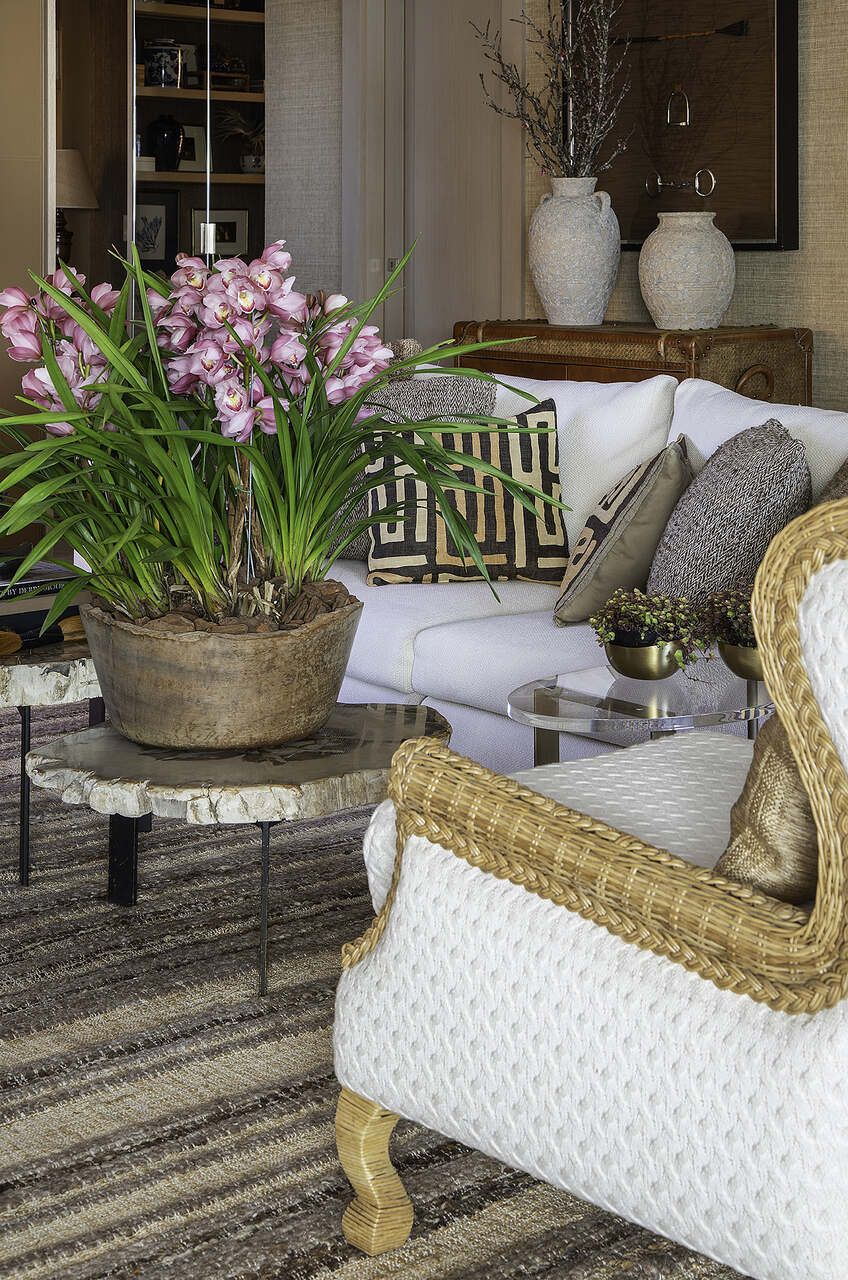 A inspiração vem do chic despretensioso de Ralph Lauren, referência direta para o uso do couro caramelo, do linho branco, da palha de seda, do carvalho americano e do mármore Travertino no piso. Tudo conversa entre si com naturalidade, sem excessos, criando uma atmosfera elegante e atemporal. É um apartamento com DNA forte, mas que não cansa, e sim convida a ficar.