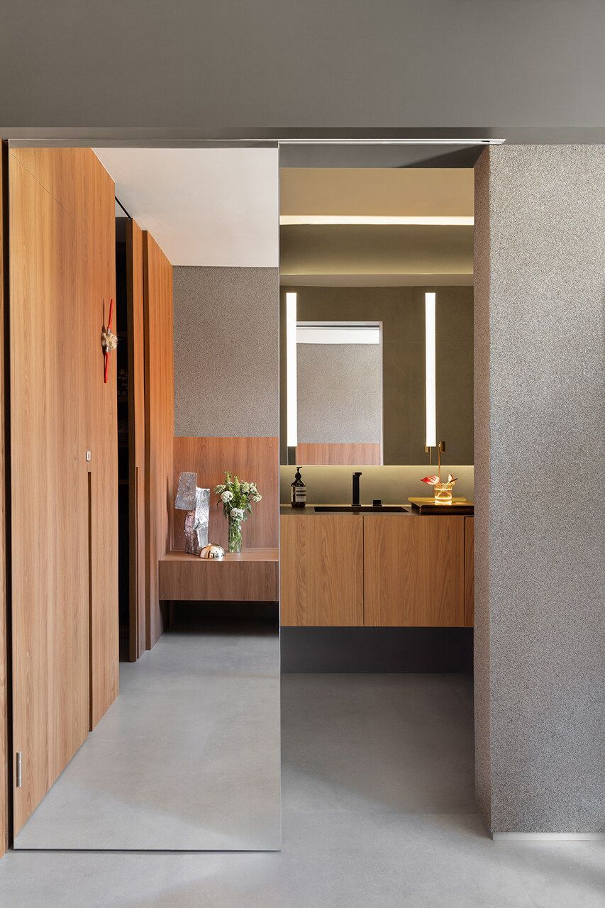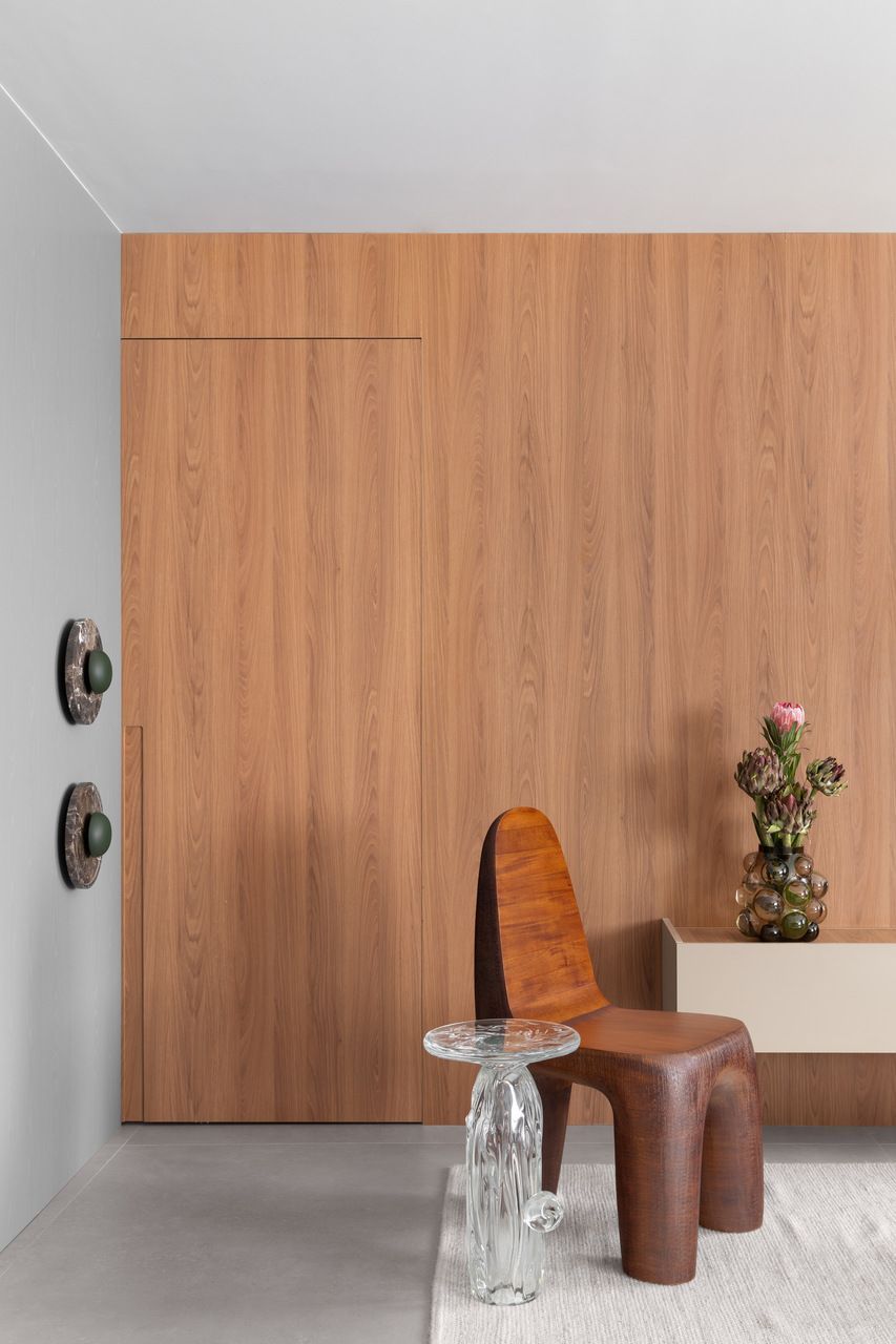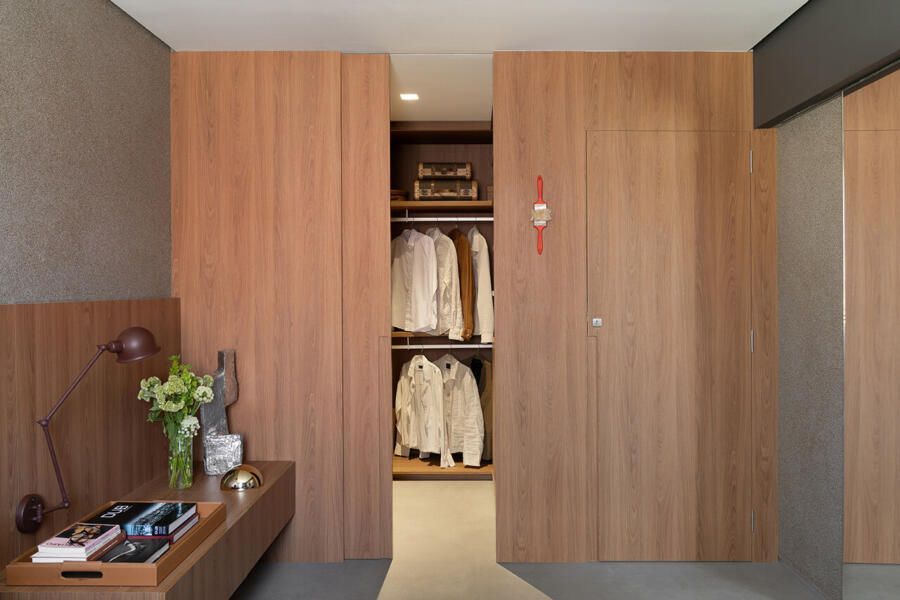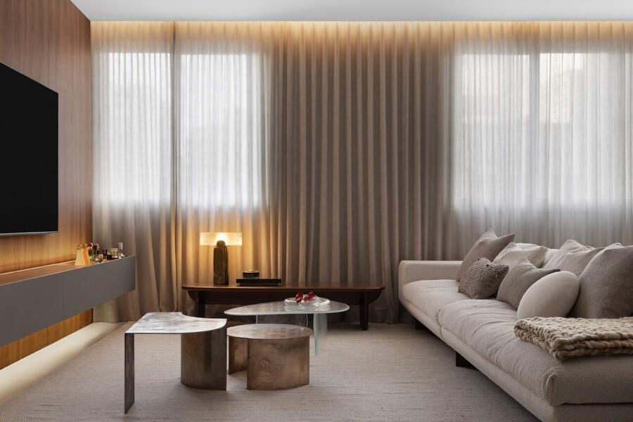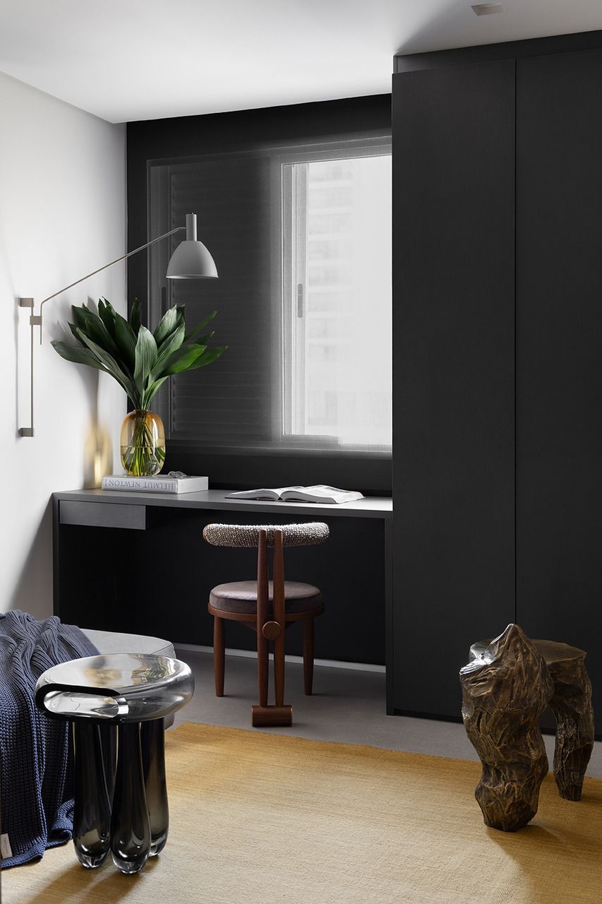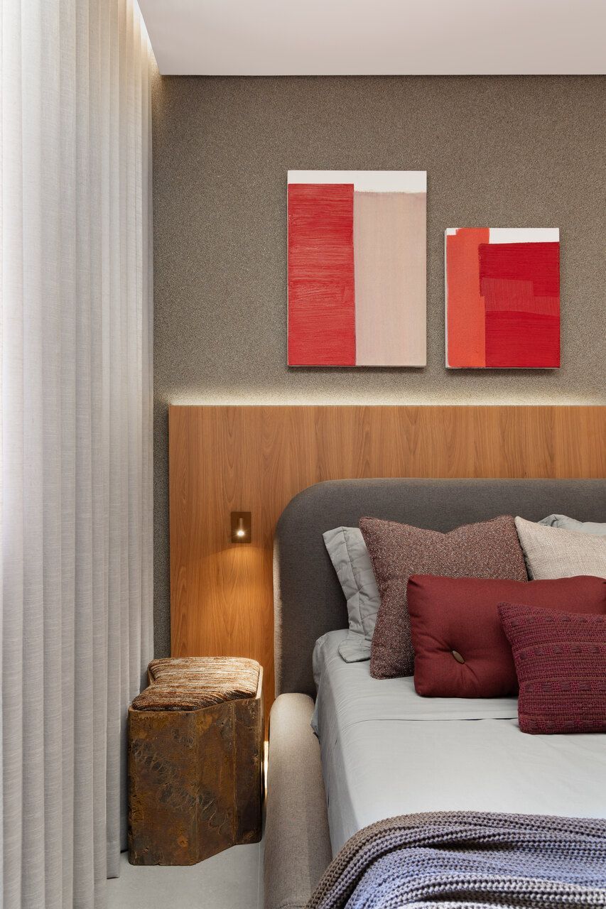 No quarto híbrido, onde hóspedes e home office se acomodam com naturalidade, fica evidente como a arquitetura acompanha o estilo de vida do morador. É versátil, inteligente e sensível. E a luminotécnica, também assinada pelo escritório, costura tudo isso, revelando texturas, valorizando superfícies e criando atmosferas que mudam ao longo do dia.