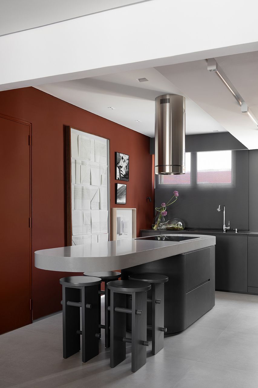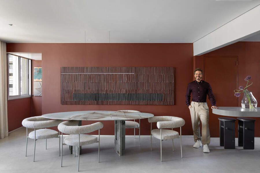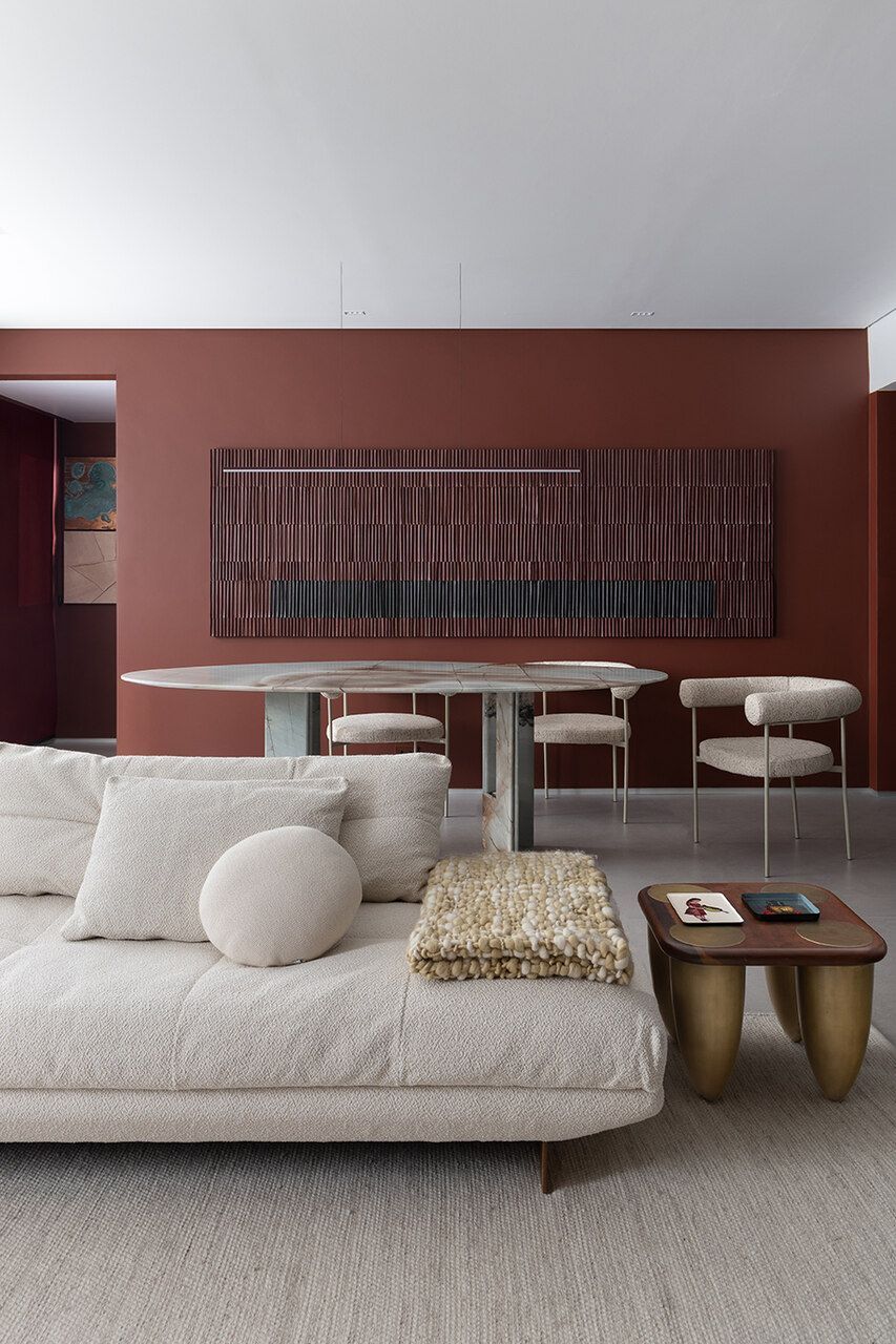 Outro ponto alto, e um dos meus favoritos, é a mesa Tecto, desenhada pelo próprio escritório. Ela quebra a ortogonalidade do teto e amarra toda a área social. A paleta neutra ganha força com o burgundy, que aparece como protagonista, criando profundidade e personalidade. Ao fundo, a obra de Erwin Zaidowicz Neto une arte e arquitetura de uma forma linda.