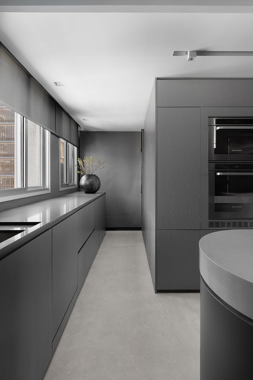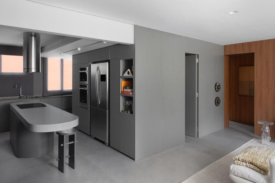 A cozinha é um capítulo à parte. A ilha arredondada, pensada para acolher e aproximar, traduz de forma literal o espírito do morador, que agora cozinha bem e recebe melhor ainda. A lavanderia compacta e integrada confirma essa abordagem contemporânea que elimina fronteiras rígidas: aqui, o uso real da casa dita o projeto, e não o contrário. E o living duplicado segue a mesma lógica, oferecendo diferentes maneiras de estar e conviver no dia a dia.