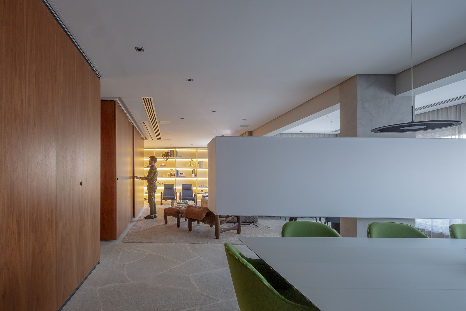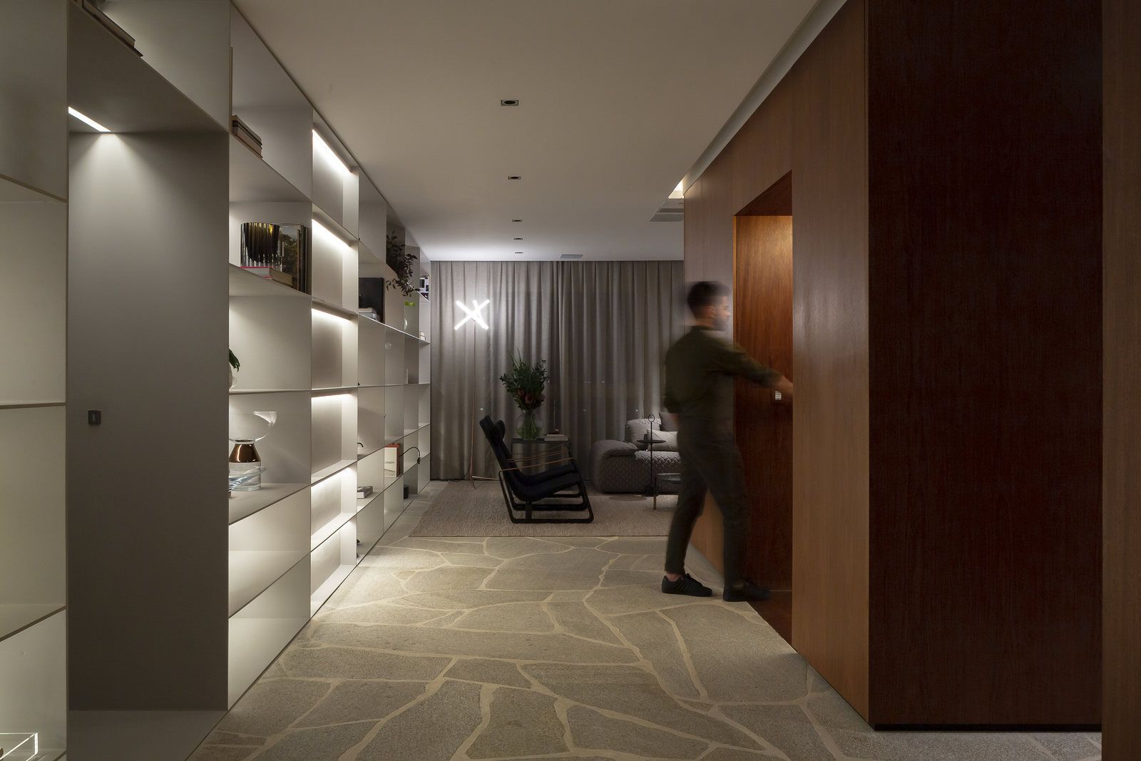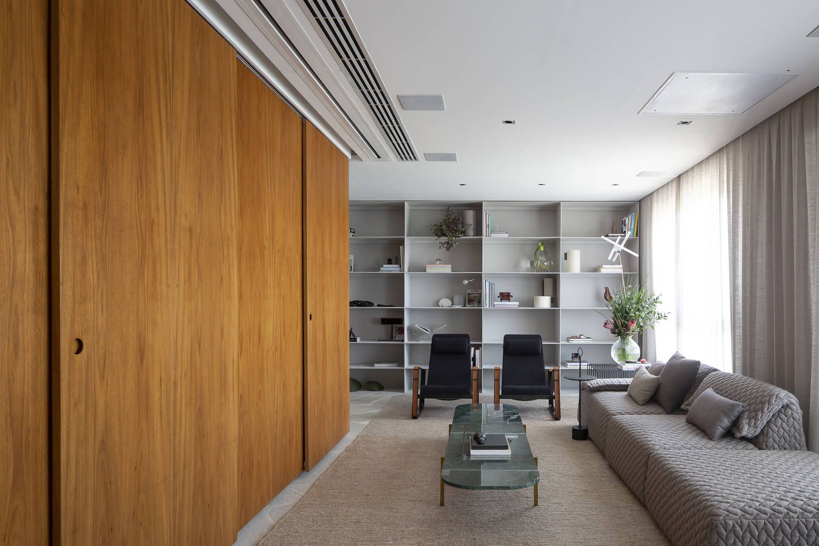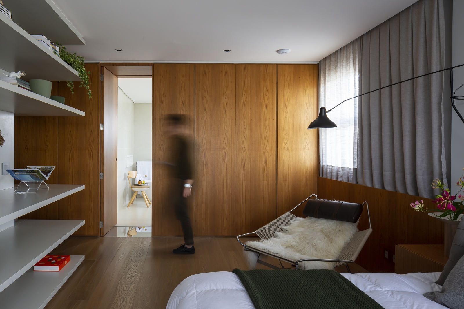Flávio Castro: “O Jonas entrou em contato com o escritório por já se identificar com os projetos de arquitetura e interiores que fazemos. Assim, após projetar uma casa para ele, foi-nos encomendado o projeto deste apartamento. Como já tínhamos muita sintonia e afinidade, o conceito do projeto foi rapidamente determinado. As definições de materiais, proporções de marcenaria, revestimentos e mobiliários aconteceram de forma muito fluida.”