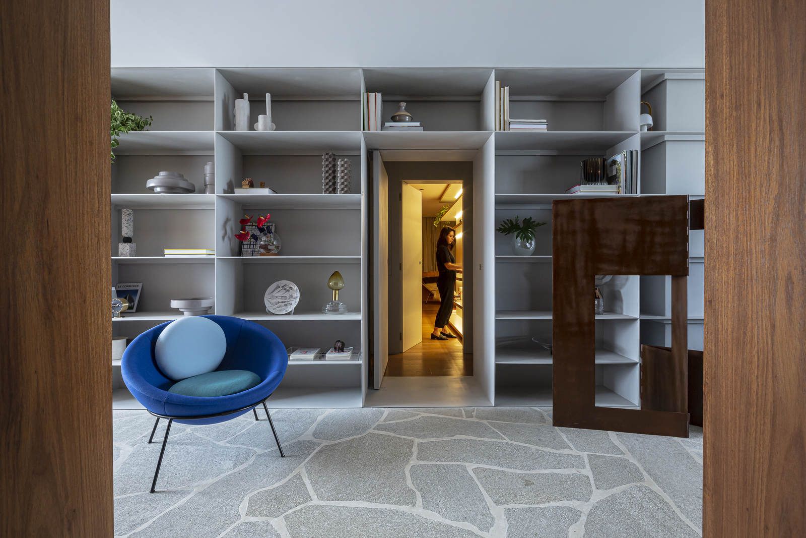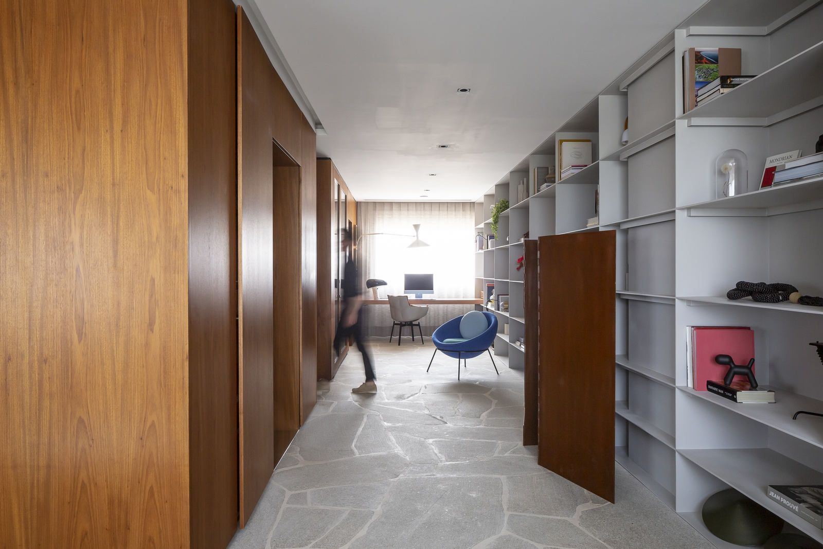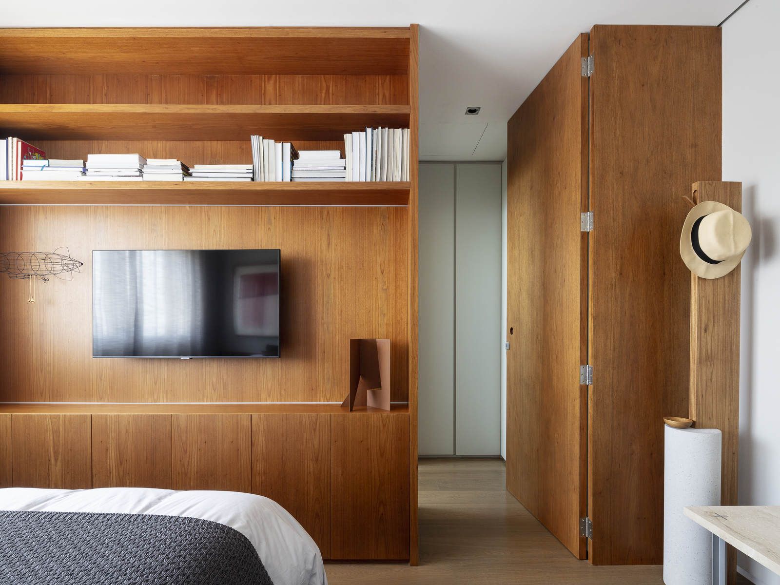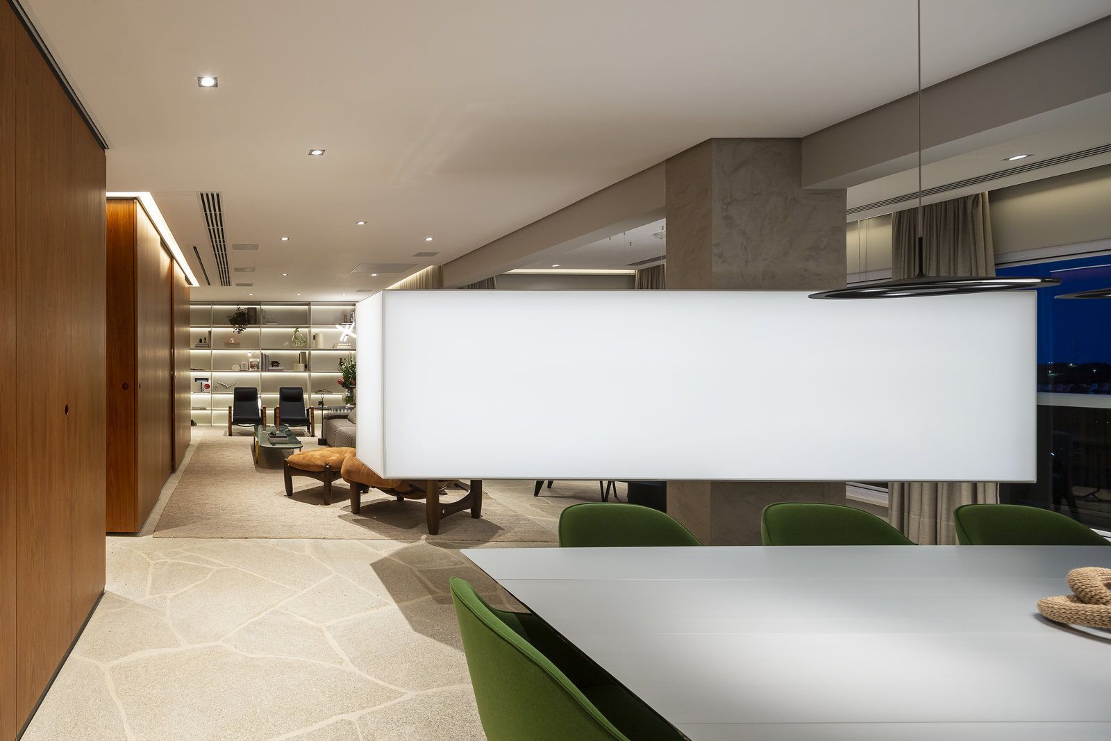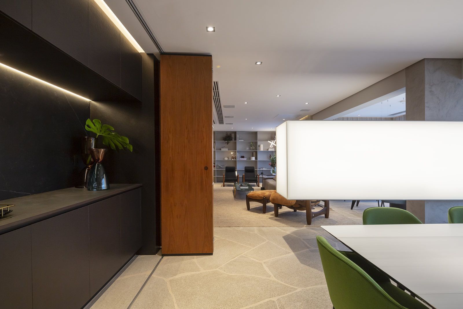 Flávio Castro: “O Jonas entrou em contato com o escritório por já se identificar com os projetos de arquitetura e interiores que fazemos. Assim, após projetar uma casa para ele, foi-nos encomendado o projeto deste apartamento. Como já tínhamos muita sintonia e afinidade, o conceito do projeto foi rapidamente determinado. As definições de materiais, proporções de marcenaria, revestimentos e mobiliários aconteceram de forma muito fluida.”