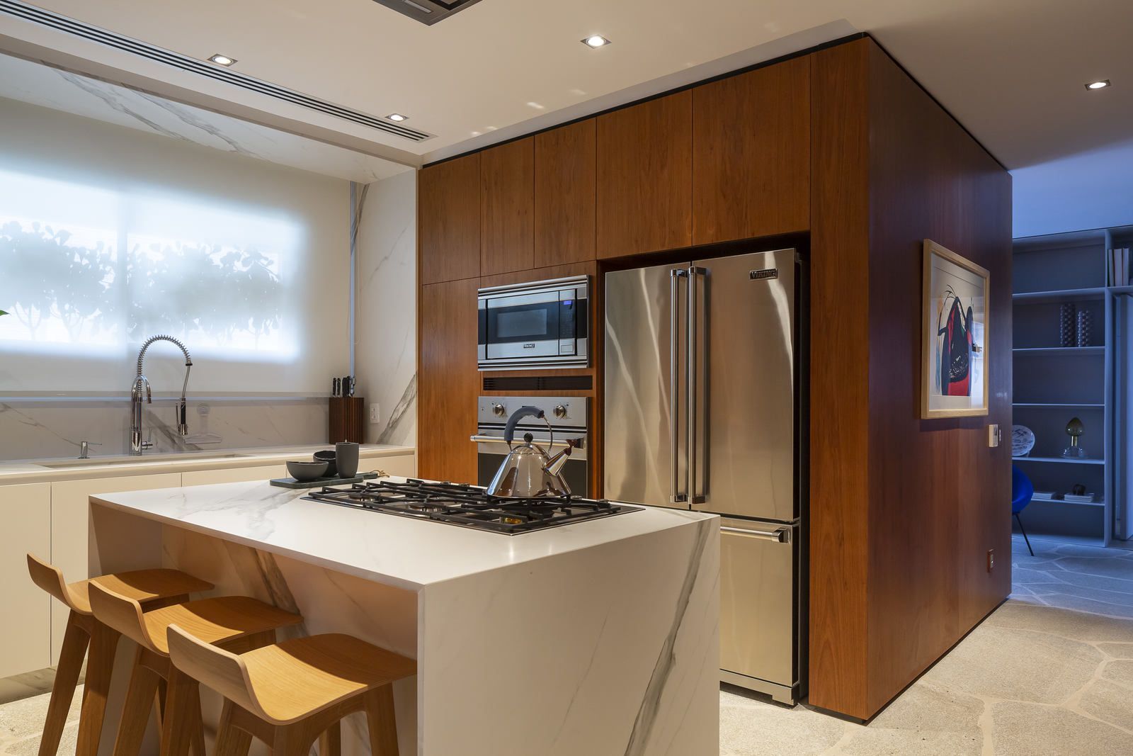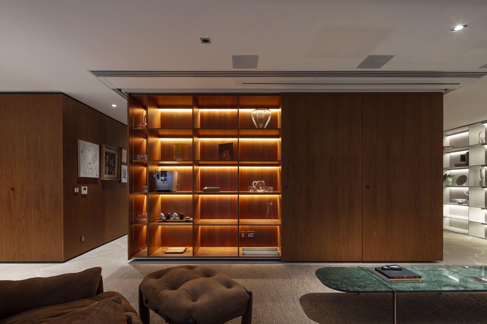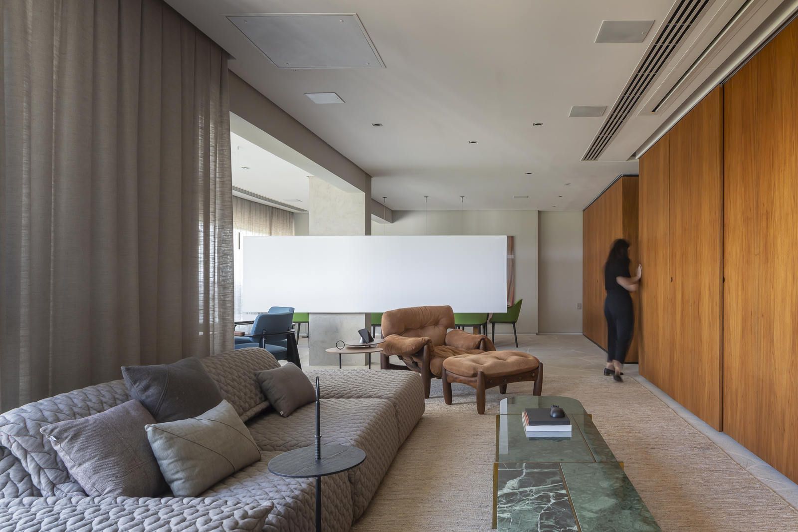Flávio Castro: “Quero destacar a solução para o entretenimento no living. Temos telão e TV disponíveis, mas que podem desaparecer através de movimentos de marcenaria. Assim, o ambiente se transforma.”