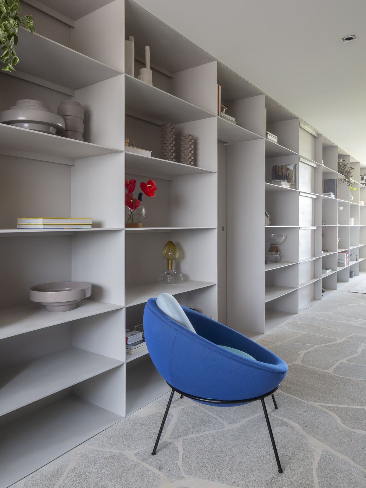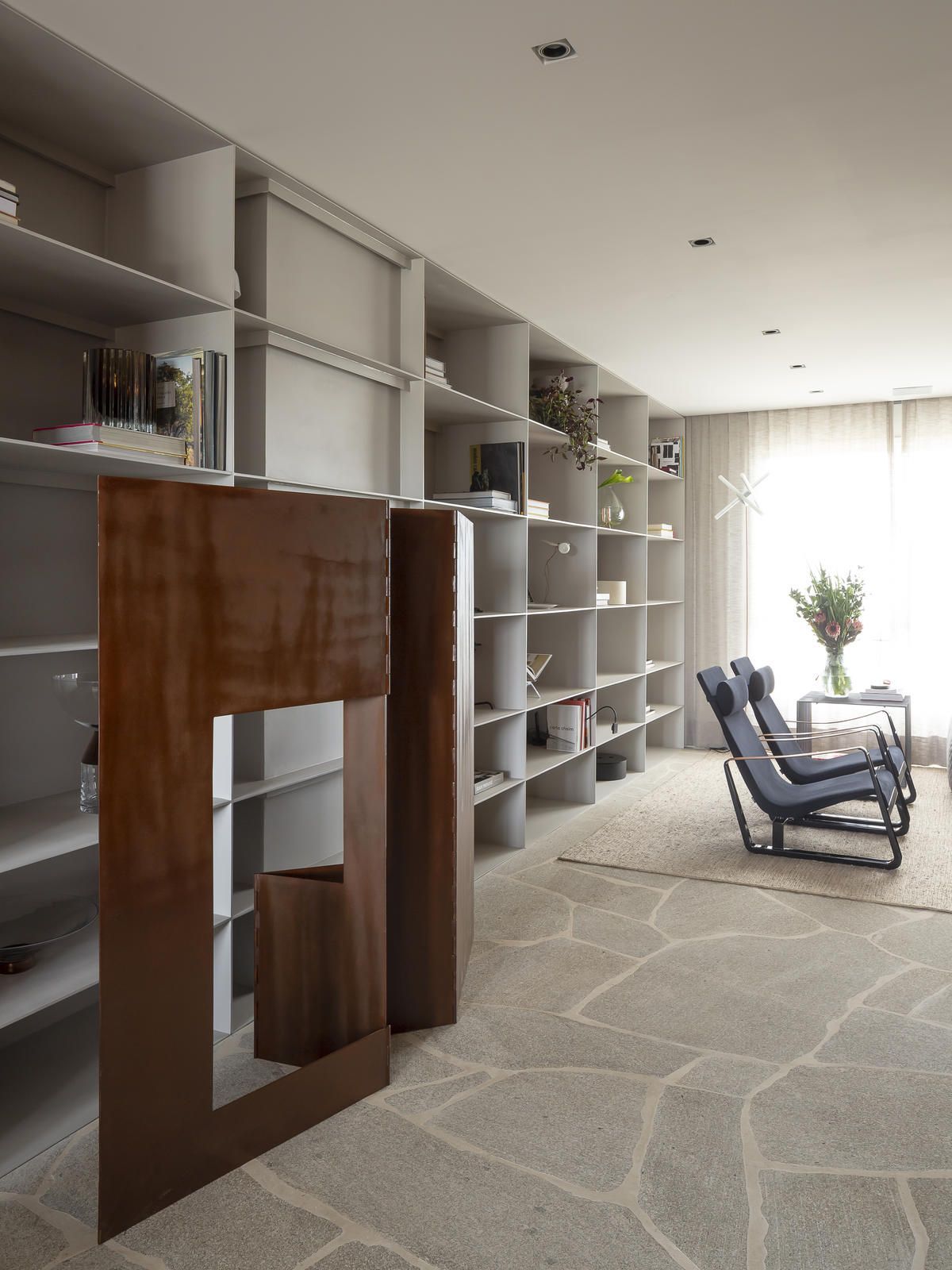 Flávio Castro: “Sim, não apenas móveis, mas também esculturas, como a Leku I e Leku II. As criamos em diferentes tamanhos. Uma para a estante e uma menor para o chão, logo em frente à porta principal de acesso. O conceito das peças é inspirado na obra de Amilcar de Castro e Chillida, por isso do nome ‘Leku’, que remete ao Museu Chillida Leku que fica em San Sebastian, no País Basco. Além disso, desenhamos o Aparador Gin, a Mesa Campo, o Banco Mies, a Mesa Rod e a Mesa Foco. Com destaque para a Mesa Campo, que surgiu em uma das visitas ao Mato Grosso do Sul. Olhando pela janela do avião, percebi que as configurações dos campos de plantação do estado poderiam servir como inspiração para a criação de uma mesa de centro. O mármore verde, dividido em partes de distintas proporções, remete aos campos de plantação, em diferentes tons de verde. As divisões metálicas entre os campos do tampo são convertidas em pés que estruturam a peça.”