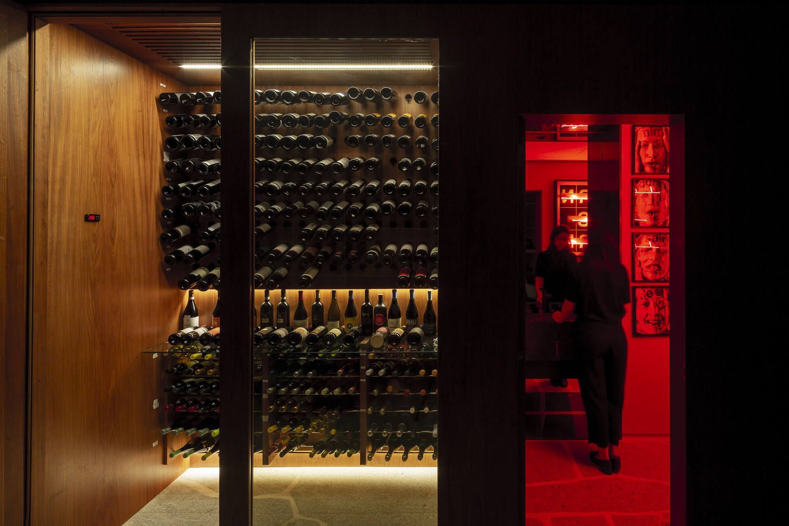 Flávio Castro: “O morador costuma receber os amigos e a planta do apartamento era bem mais compartimentada. Dessa forma, a intervenção buscou ampliar a área social. A incorporação da varanda e supressão de um lavabo e suíte, duplicou o tamanho da área social, tornando os espaços mais condizentes com as necessidades e rotina do morador. Então o projeto é uma tradução da paixão do cliente por design, mas sem deixar de lado a funcionalidade e o desfrute da vista para o parque da cidade, que fica em frente ao prédio. Os maiores desejos eram: ter uma adega com 350 garrafas, uma área social grande, muito apoio para objetos e uma parede para expor obras de arte.”