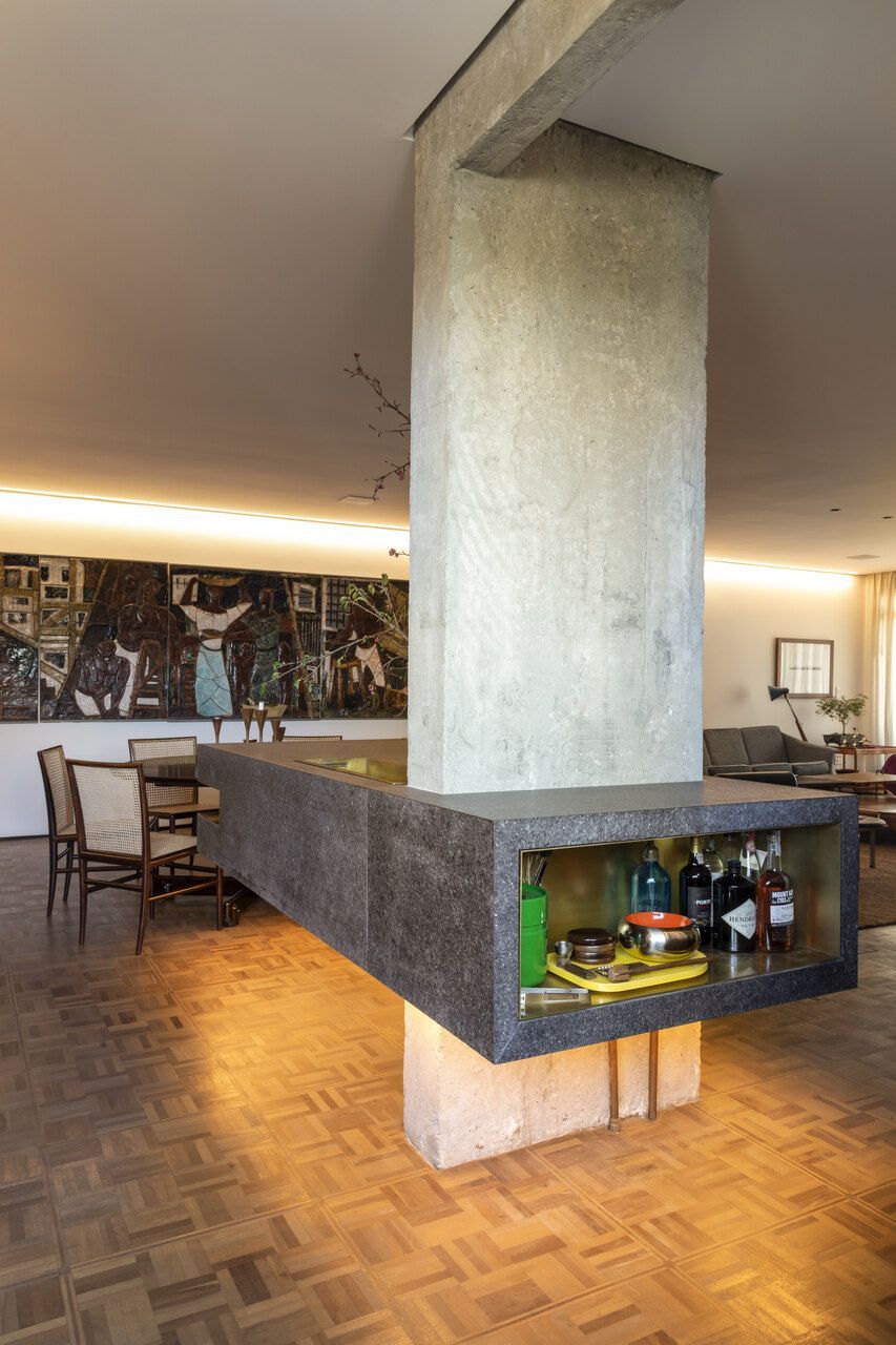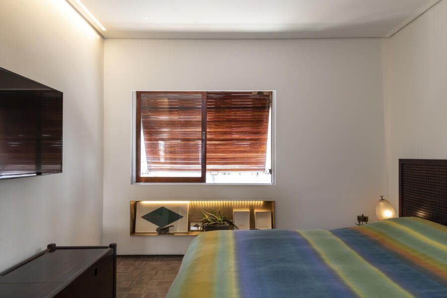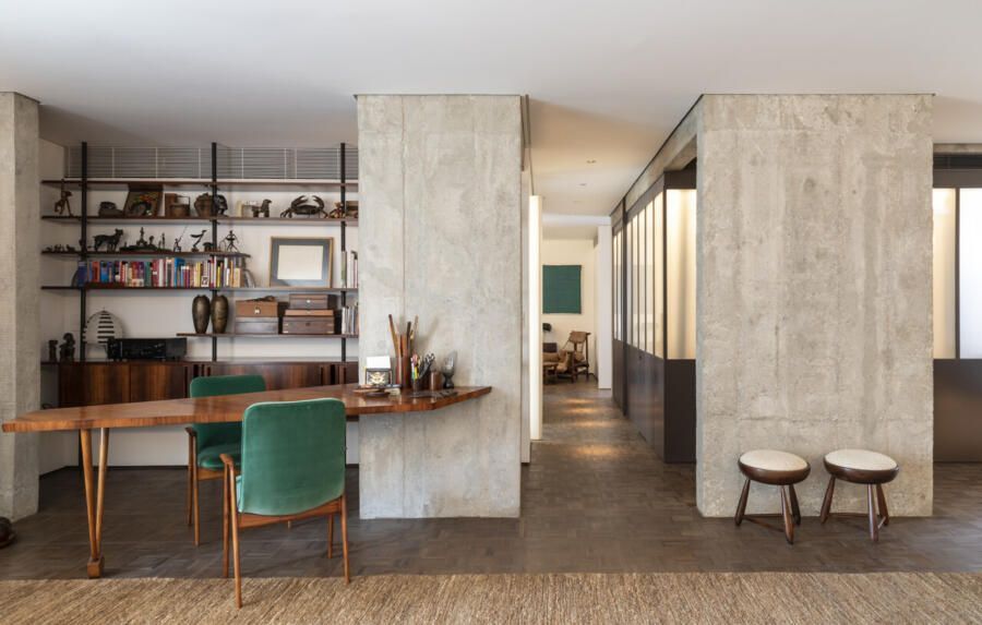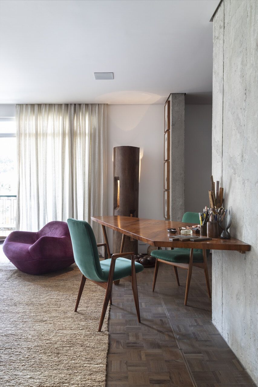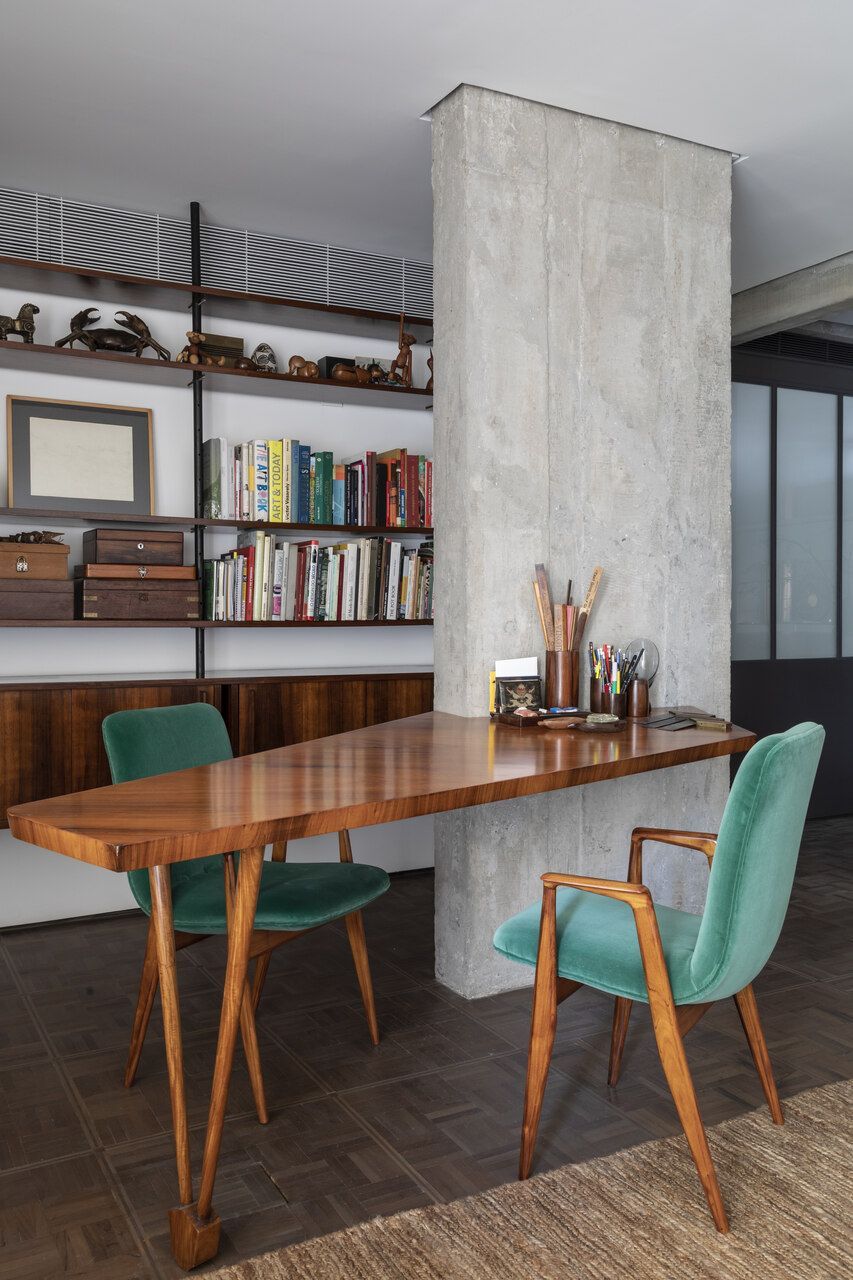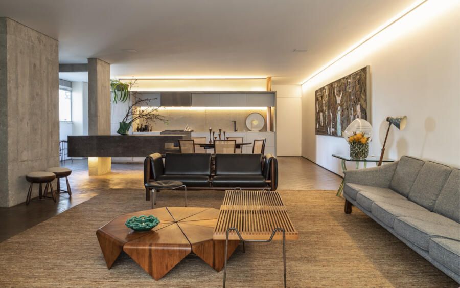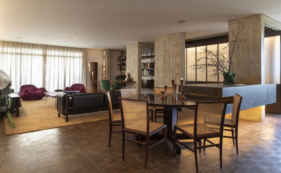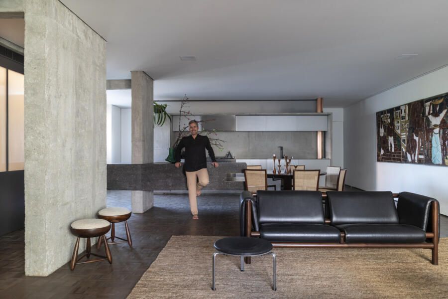 Estou falando da casa do Teo Vilela Gomes, advogado, designer de interiores e especialista quando o assunto é garimpo e antiquário, à frente da Galeria e Casa Teo. Completamente reformada por Gustavo Calazans durante um ano, o apartamento hoje possui um projeto de iluminação impressionante que dá o destaque certo para o mobiliário, além de uma estética contemporânea e com vigas aparentes.