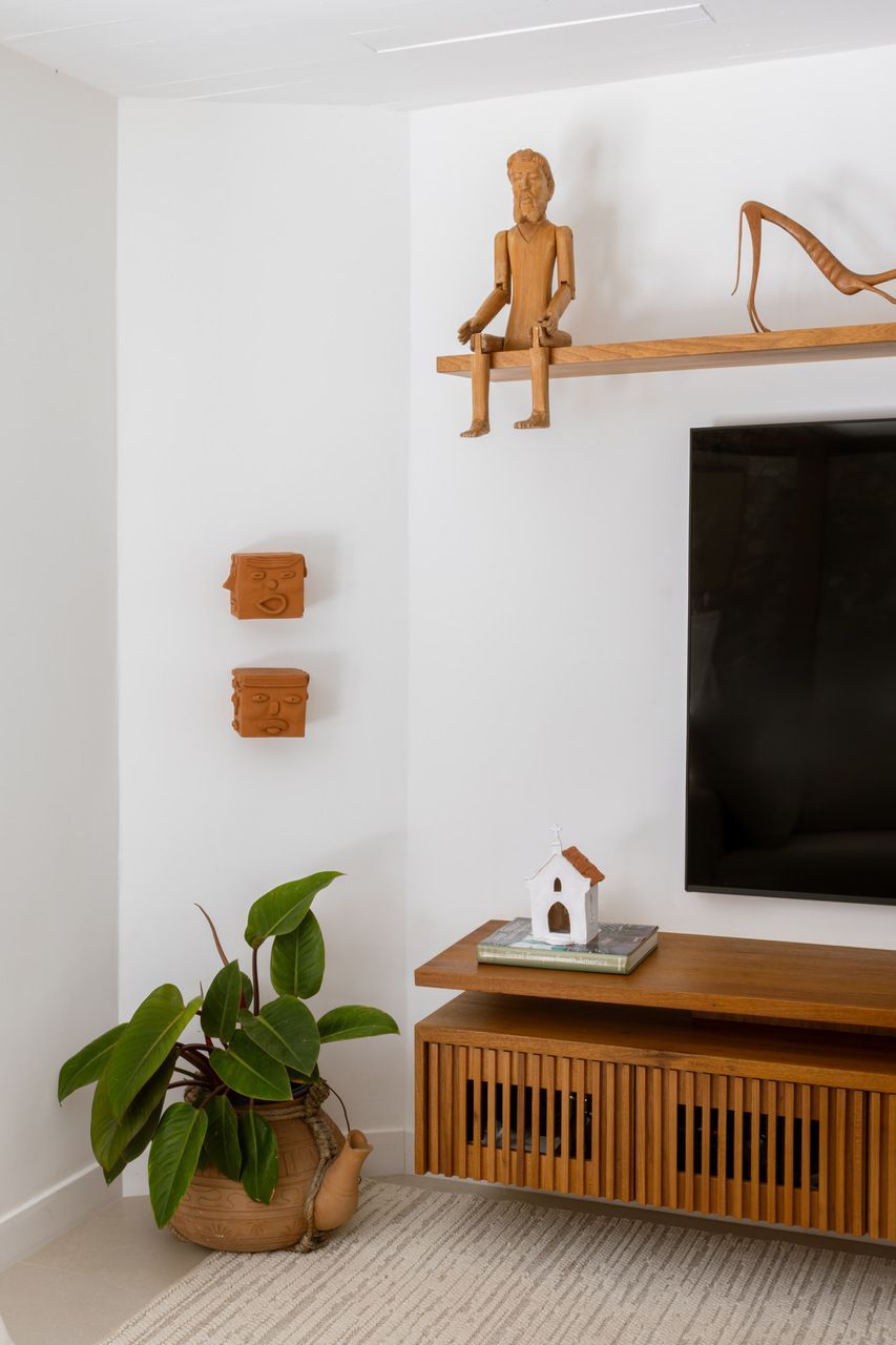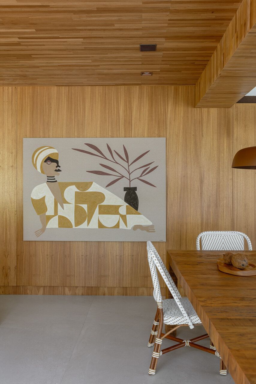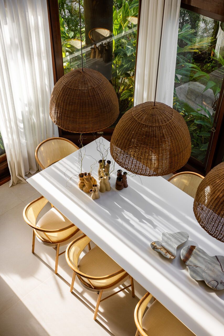 A marcenaria foi toda desenhada sob encomenda, o que garantiu personalidade e funcionalidade em cada ambiente. A decoração mistura peças assinadas por artistas brasileiros, móveis de design nacional e obras de arte cuidadosamente escolhidas para compor cada espaço com identidade.
