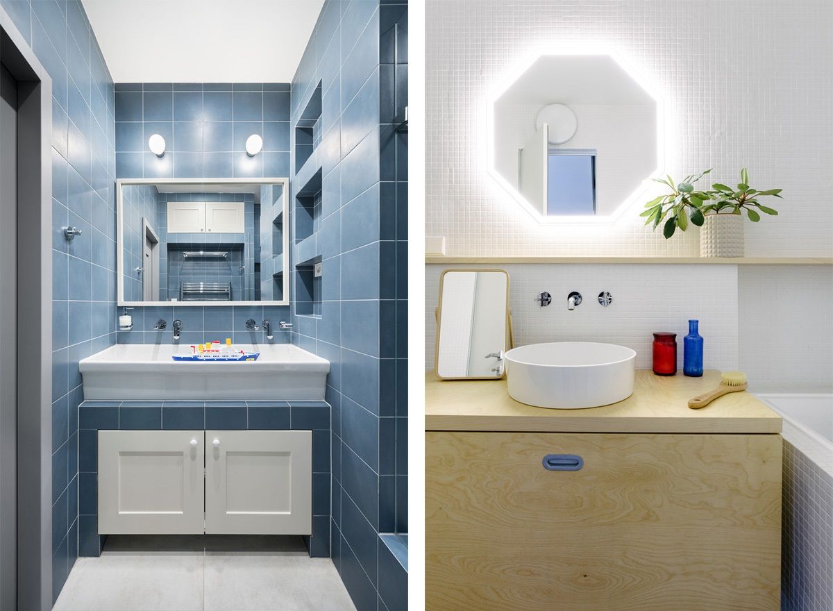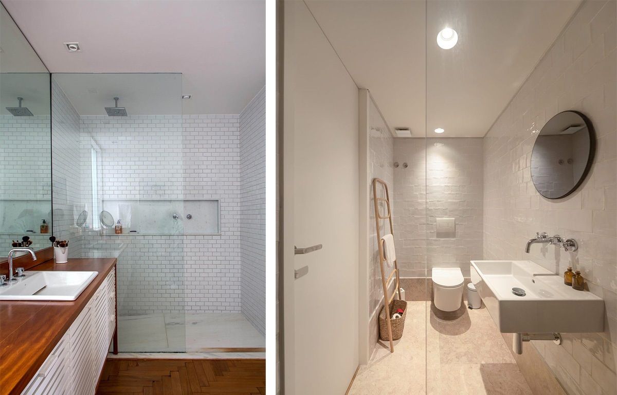 Paredes: ligada à marcenaria, usar a verticalidade da parede é muito importante em pequenos cômodos. Nos banhos, além dos armários, prateleiras e nichos suspensos, deve-se considerar a instalação de aramados para pendurar toalhas, papel-higiênico, decoração e etc.