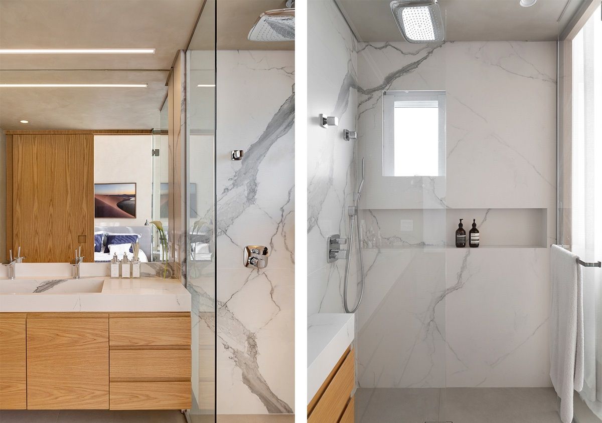 Nicho no box: aaah, os nichos! Como eles ajudam a liberar espaço, principalmente dentro do box. Se seu banheiro não tiver paredes estruturais, é possível projetar um nicho dentro do box para colocar os produtinhos de higiene: organização, estética e conforto na hora de tomar banho em um combo só!