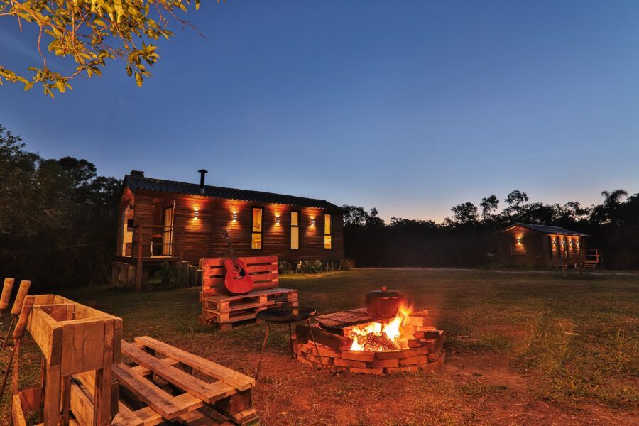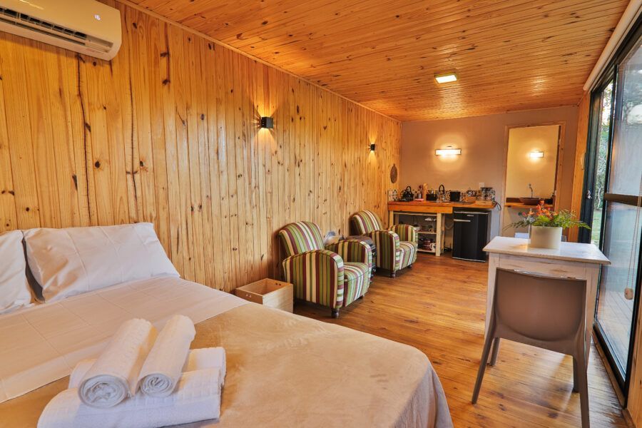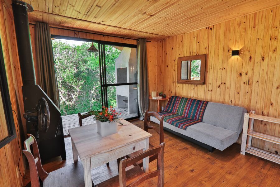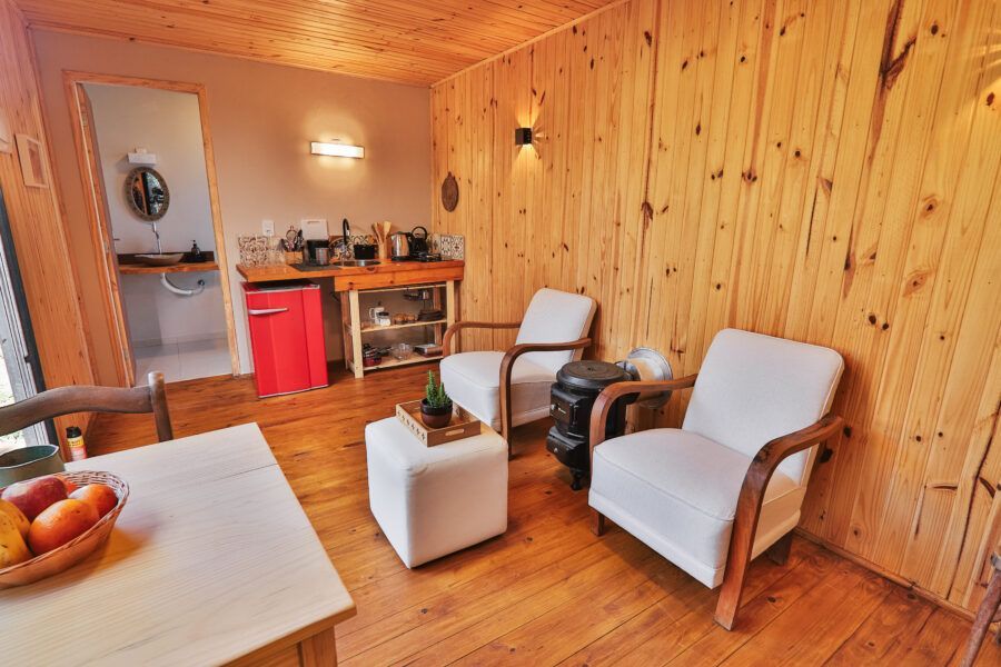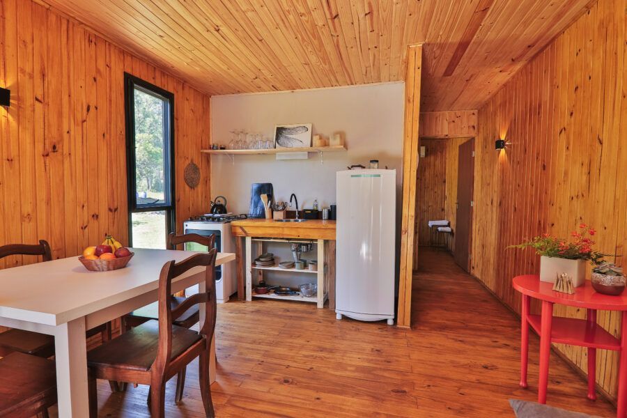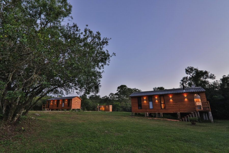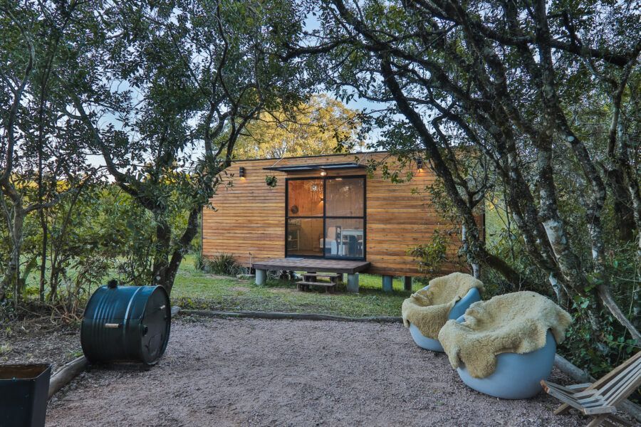 Nomeadas Butiá e a Pitanga, ambas de 40,00 m², duas das cabanas conseguem acomodar até quatro pessoas. Já outras duas, Amora e Bergamota, acomodam um casal e têm 25,00 m². A área construída total é de aproximadamente 300m², e conta com privacidade e vista privilegiada. A 40 minutos fica Pelotas, e a fronteira com o Uruguai também é logo ali. A influência do vizinho pode ser apreciada na arquitetura da pousada, que teve como referência as cabanas de Punta del Diablo.