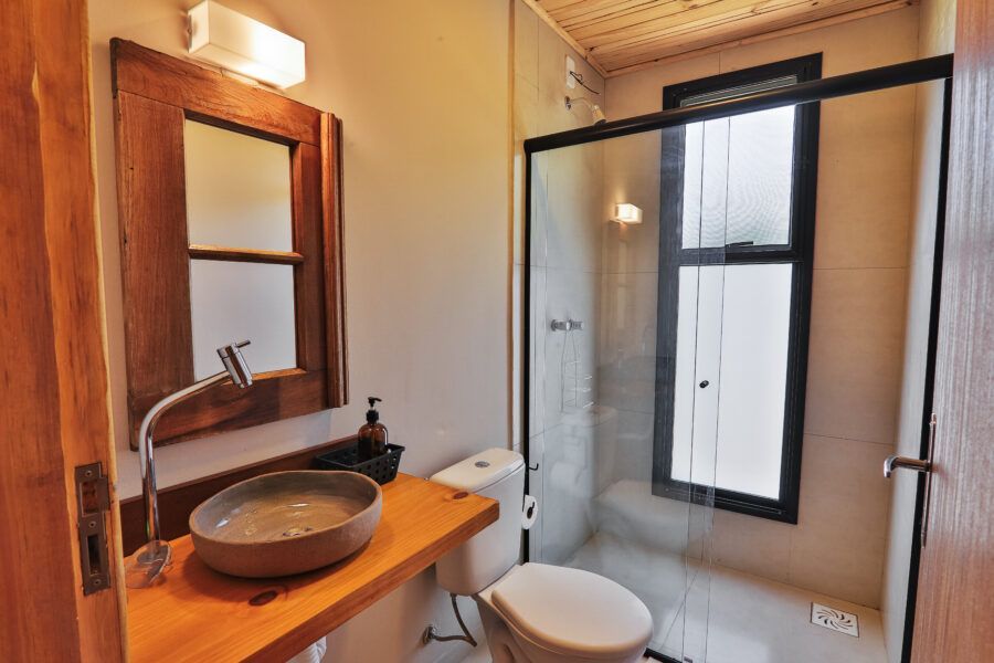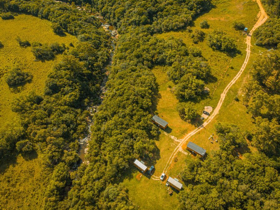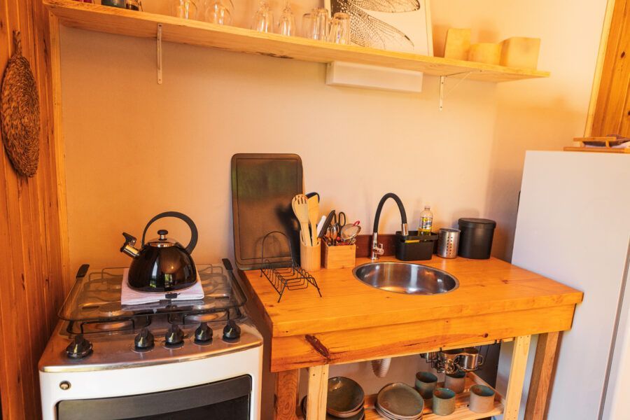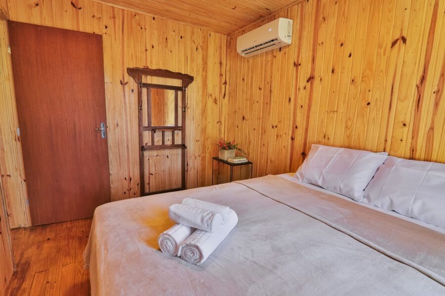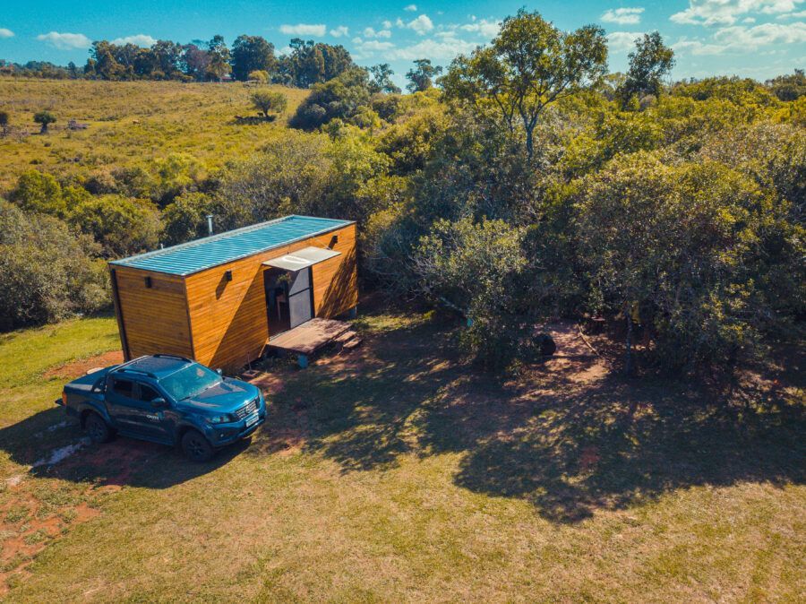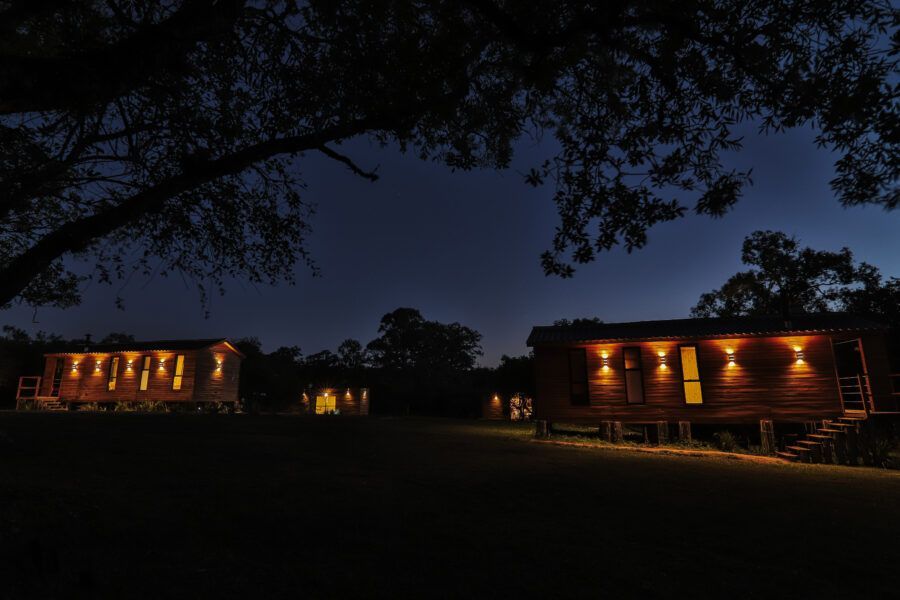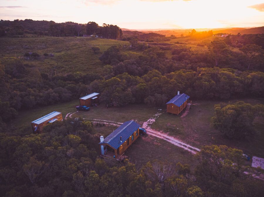 Nomeadas Butiá e a Pitanga, ambas de 40,00 m², duas das cabanas conseguem acomodar até quatro pessoas. Já outras duas, Amora e Bergamota, acomodam um casal e têm 25,00 m². A área construída total é de aproximadamente 300m², e conta com privacidade e vista privilegiada. A 40 minutos fica Pelotas, e a fronteira com o Uruguai também é logo ali. A influência do vizinho pode ser apreciada na arquitetura da pousada, que teve como referência as cabanas de Punta del Diablo.