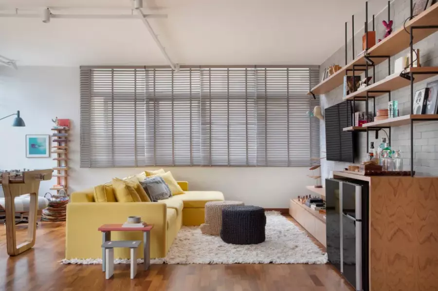 Já na sala de estar, a arquiteta Cacau Ribeiro optou por um sofá amarelo como ponto de cor. Foto: Denilson Machado / Divulgação