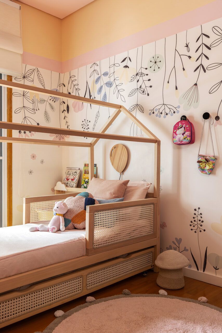 Com a chegada dos filhos, Tito (hoje com 6 anos) e Mila (4), o projeto foi sendo atualizado: surgiram os quartos infantis, criados do zero, enquanto a suíte do casal recebeu nova produção com enxoval, tapete e almofadas. Já a área íntima ganhou uma estante do Estúdio Bola, pensada para acomodar a crescente coleção de livros da família.