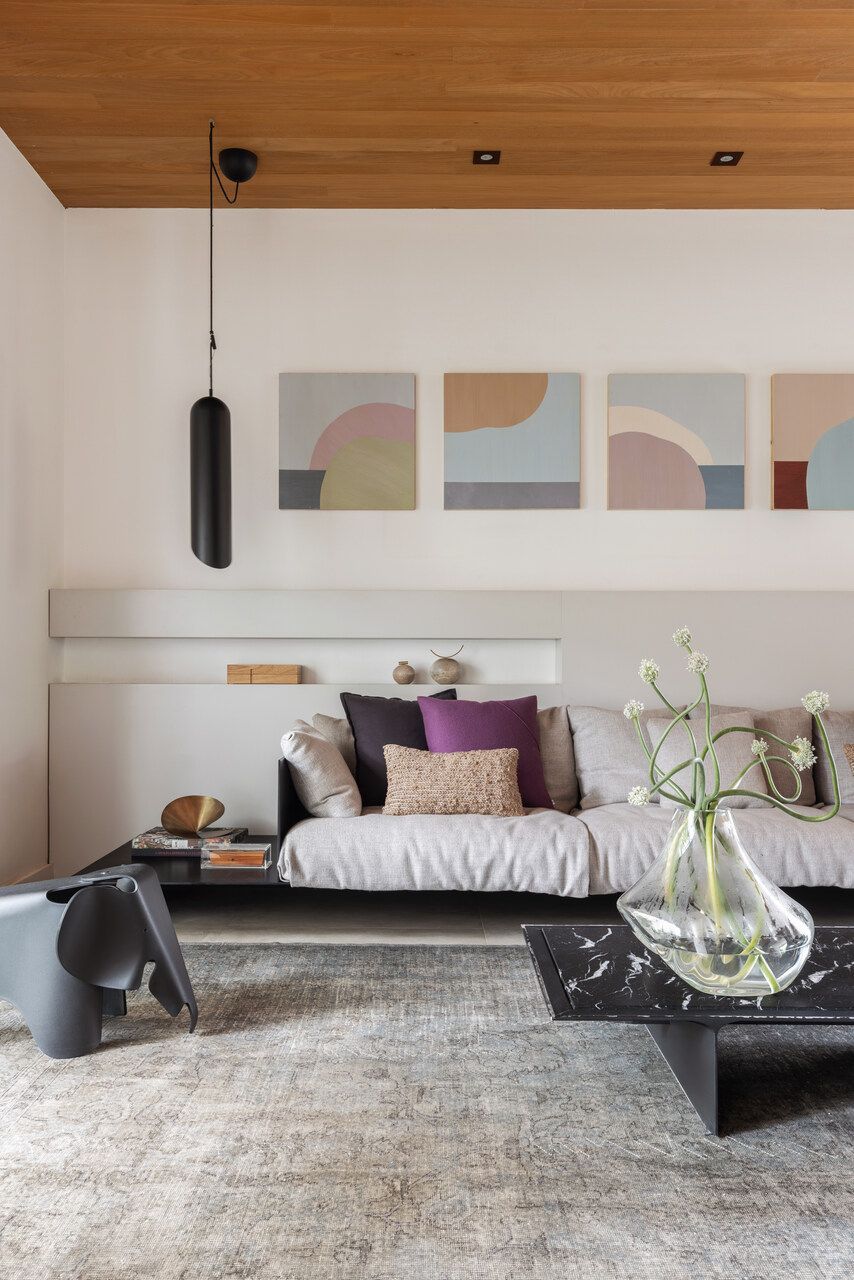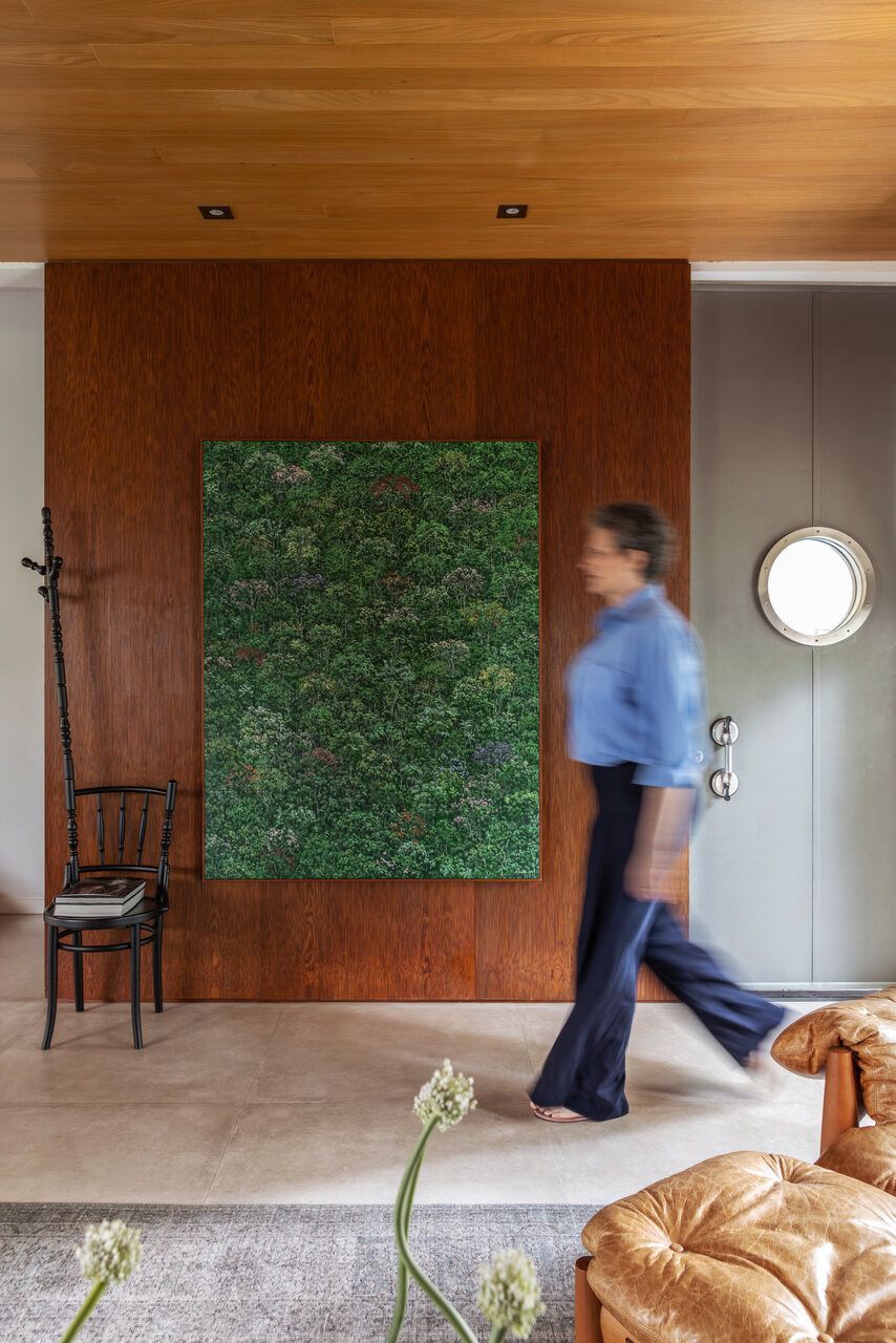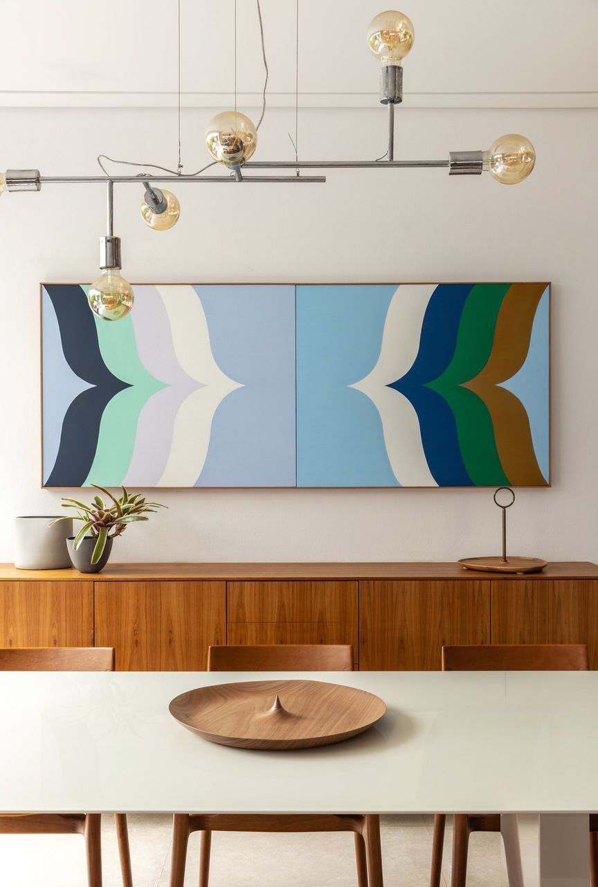 Oito anos depois, sentiram que era hora de atualizar o décor e manter a casa viva. Chamaram Carol novamente para dar o toque que queriam ao projeto: a casa precisava de manutenções, mas também de um “up” para refletir a nova fase da família. Todos os móveis foram reaproveitados, incluindo peças assinadas de grandes nomes como Jader Almeida e Sergio Rodrigues, que continuam atuais e impecáveis. Para completar, foram incorporadas obras de arte escolhidas em um processo de curadoria cuidadoso, que envolveu visitas a galerias e encontros com artistas.