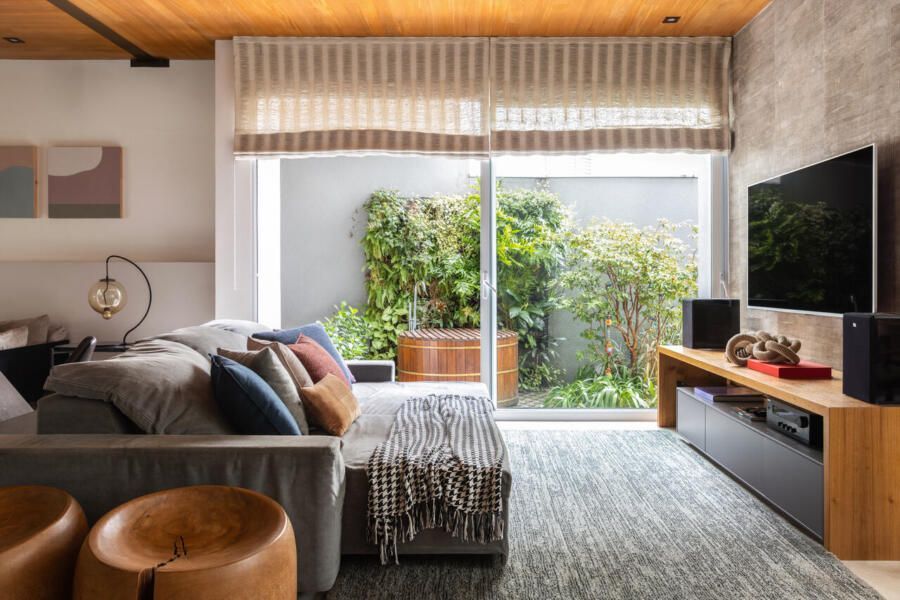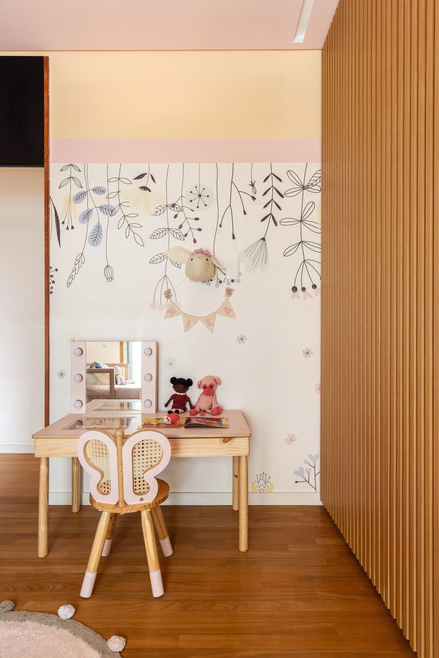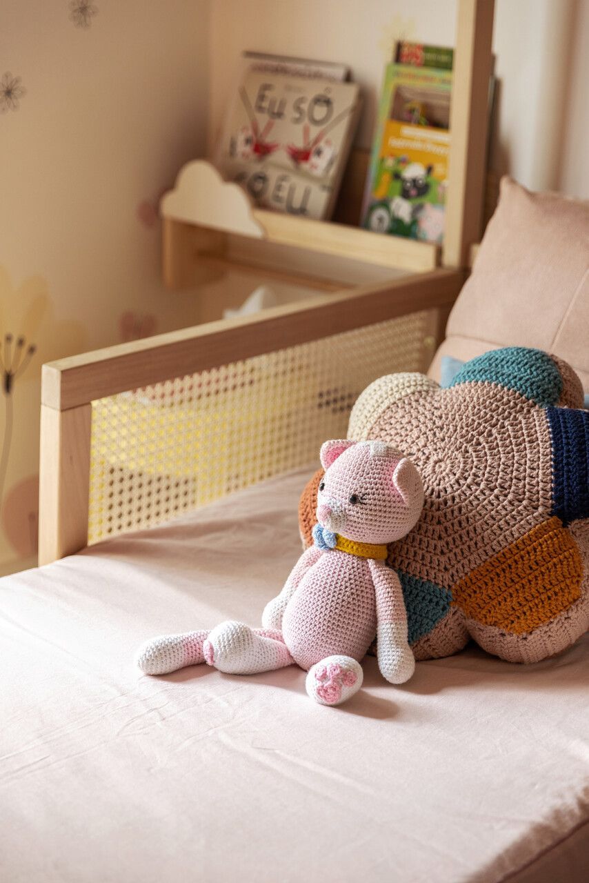 Com a chegada dos filhos, Tito (hoje com 6 anos) e Mila (4), o projeto foi sendo atualizado: surgiram os quartos infantis, criados do zero, enquanto a suíte do casal recebeu nova produção com enxoval, tapete e almofadas. Já a área íntima ganhou uma estante do Estúdio Bola, pensada para acomodar a crescente coleção de livros da família.